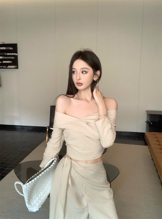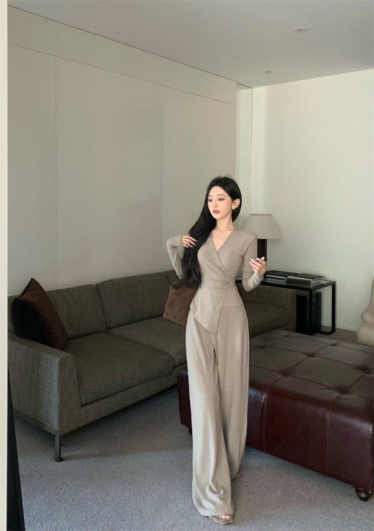 Jan. 休閒百搭 不規則V領側開叉收腰上衣休閒褲套裝 卡其