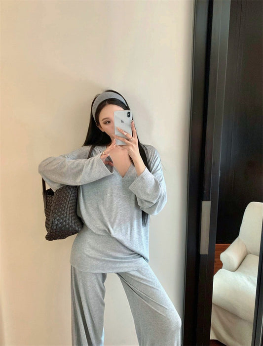 Apr. 隨心剪裁 簡約V領彈力下擺上衣休閒褲套裝 灰/藍