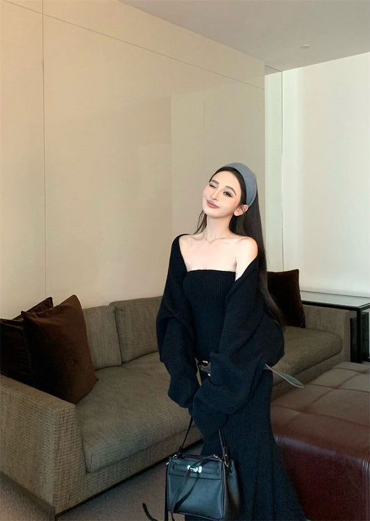 Jan. 東方美人 優雅氣質抹胸針織連身裙 外套裝 黑