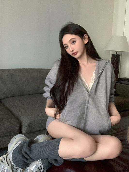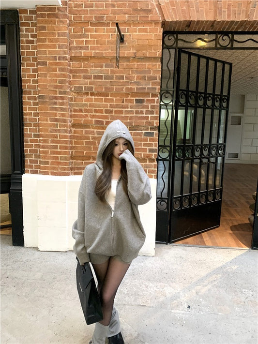 Jan. 休閒辣妹乘機套裝 慵懶灰色針織外套短褲套裝
