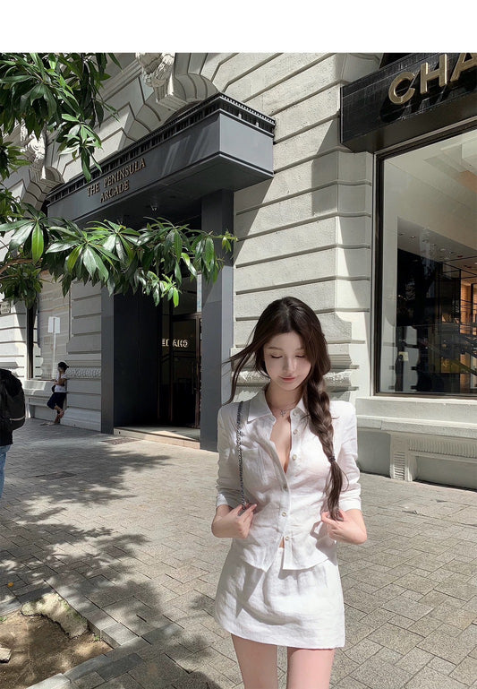 25Aug. 亞麻物語簡約七分袖襯衫低腰褲裙套裝 白色
