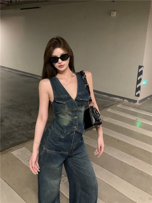 Aug. 美式復古老錢 V領排扣深色牛仔背心套裝
