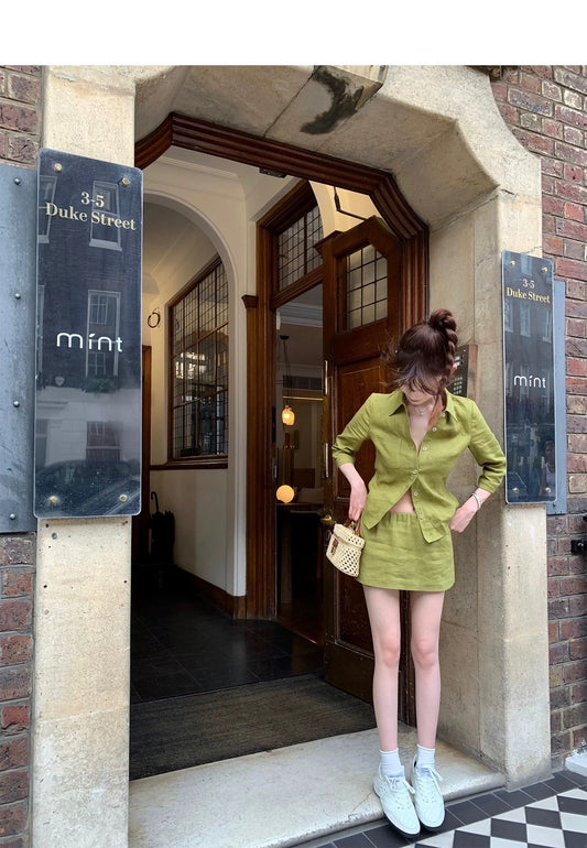 25Aug. 亞麻物語簡約七分袖襯衫低腰褲裙套裝 牛油果綠