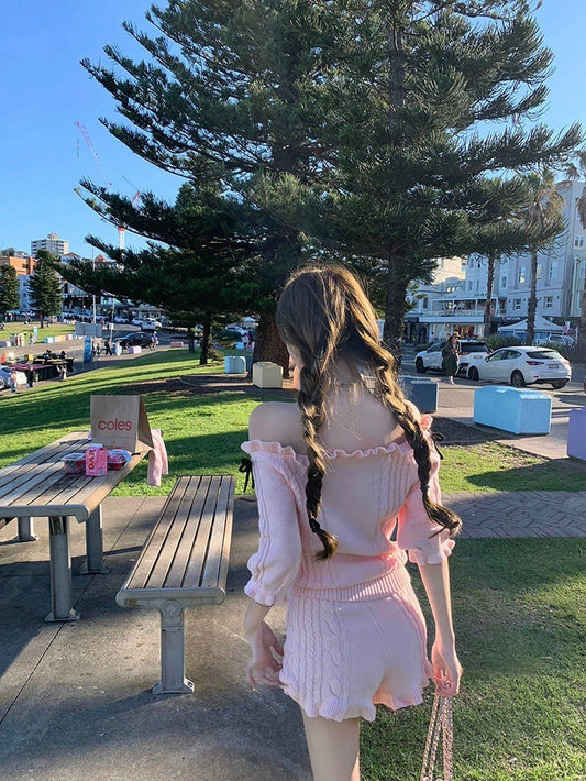 25Nov. 乖乖軟萌甜心一字領花邊針織短款套裝 草莓乳