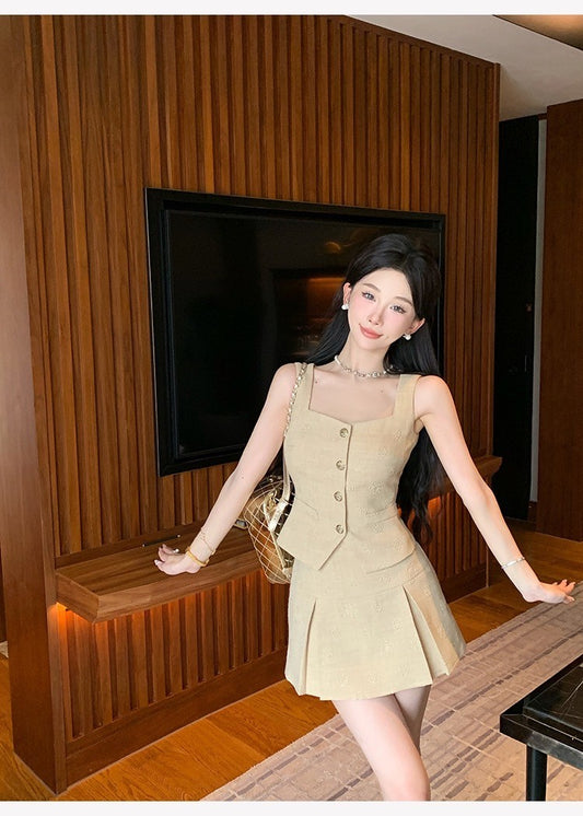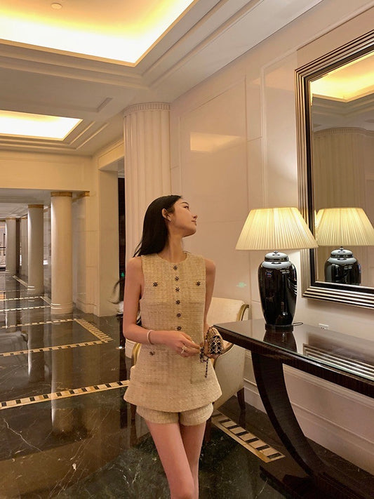 Aug. 溫沙玫瑰 氣質方領泡泡袖排扣馬甲小香套裝