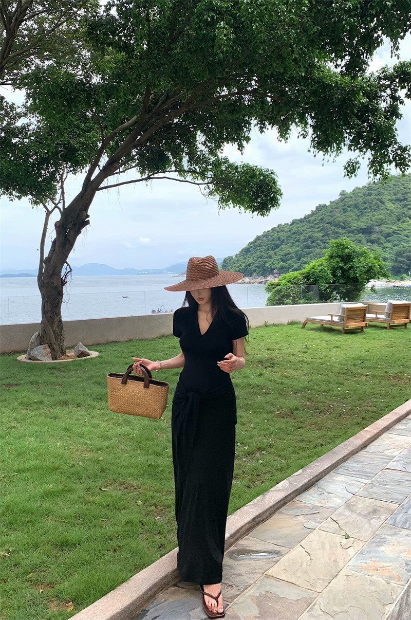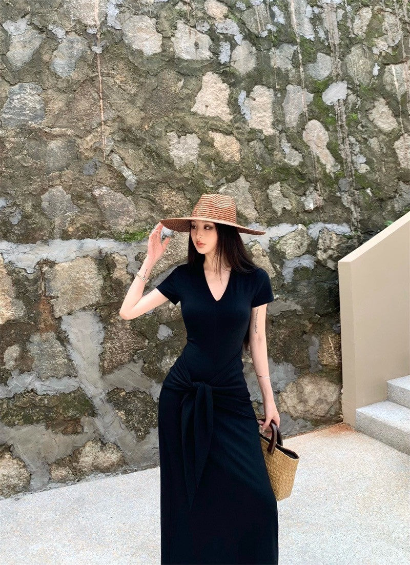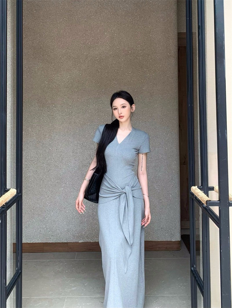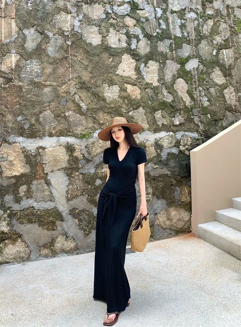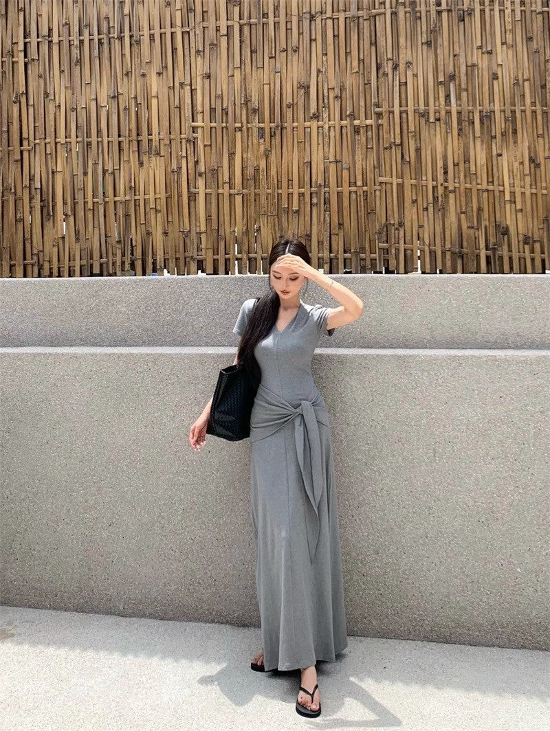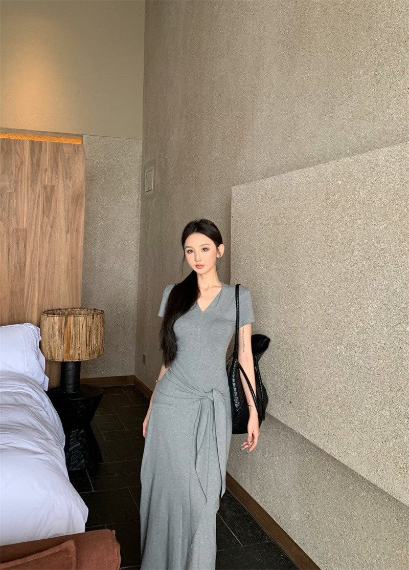 25Aug. 一件式穿不膩繫帶V領短袖連身長裙 灰/黑