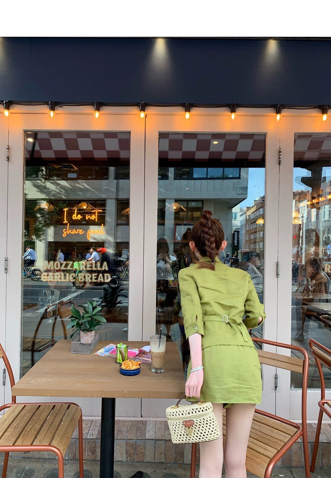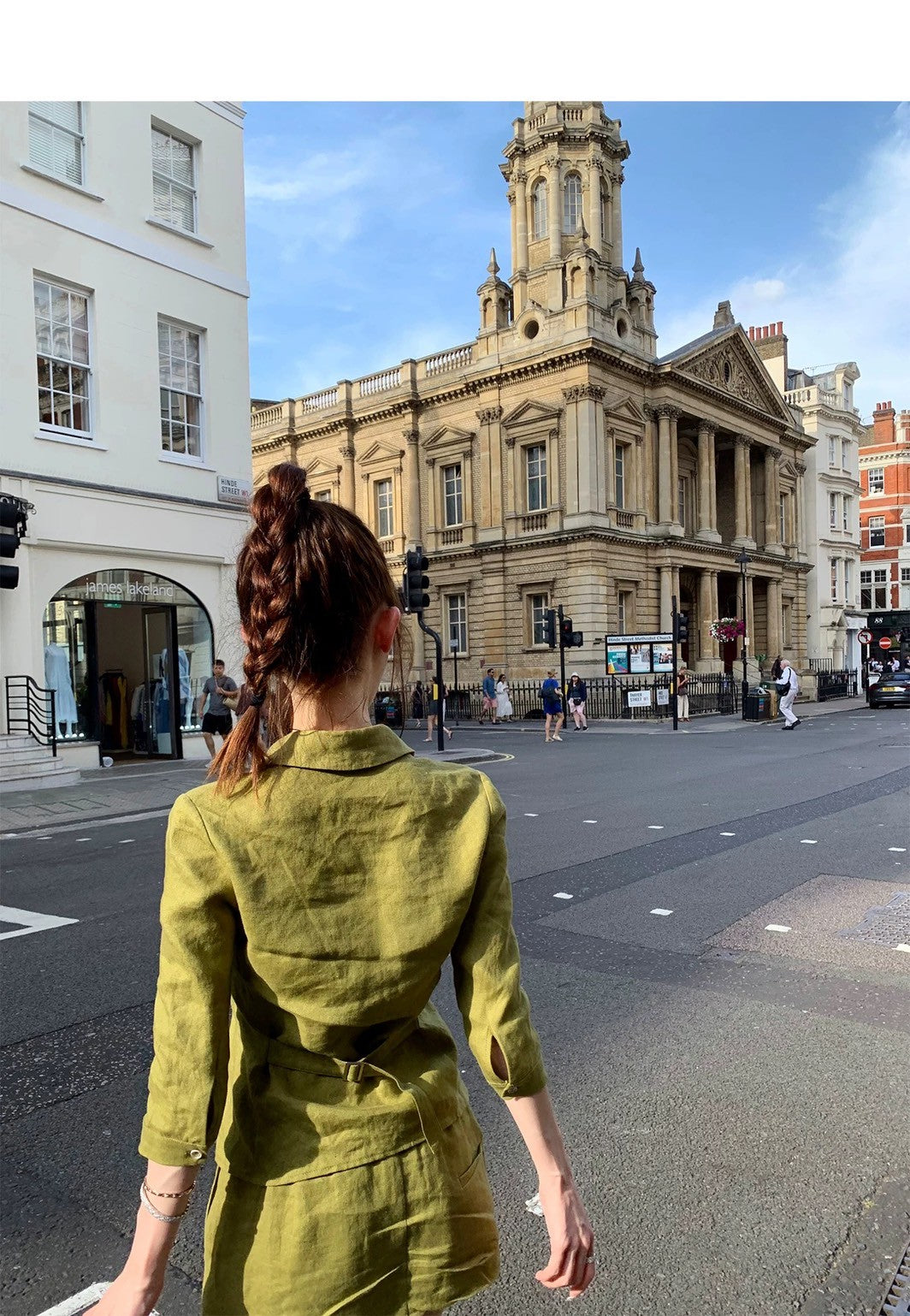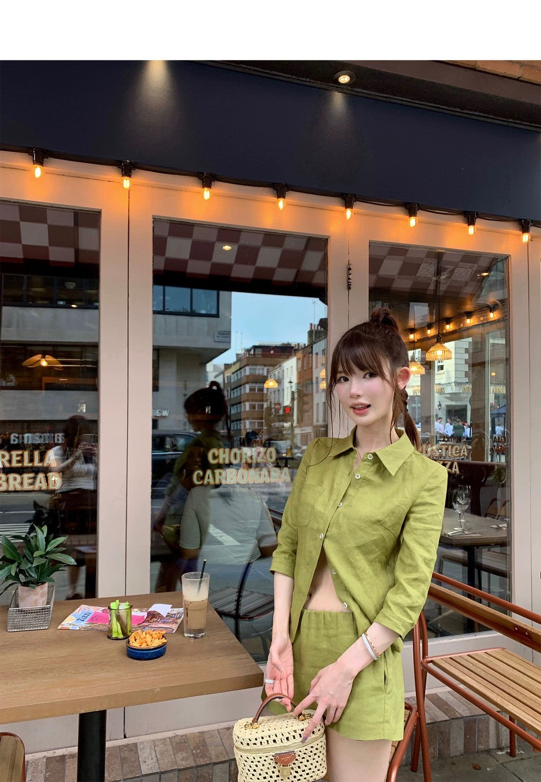 25Aug. 亞麻物語簡約七分袖襯衫低腰褲裙套裝 牛油果綠