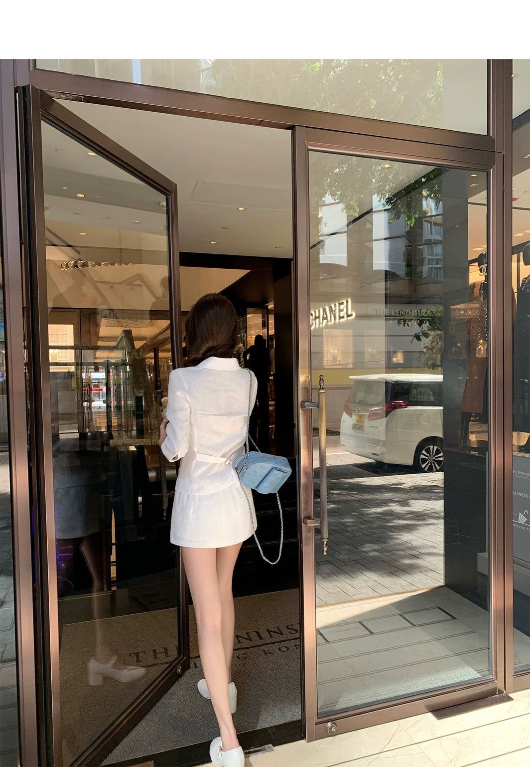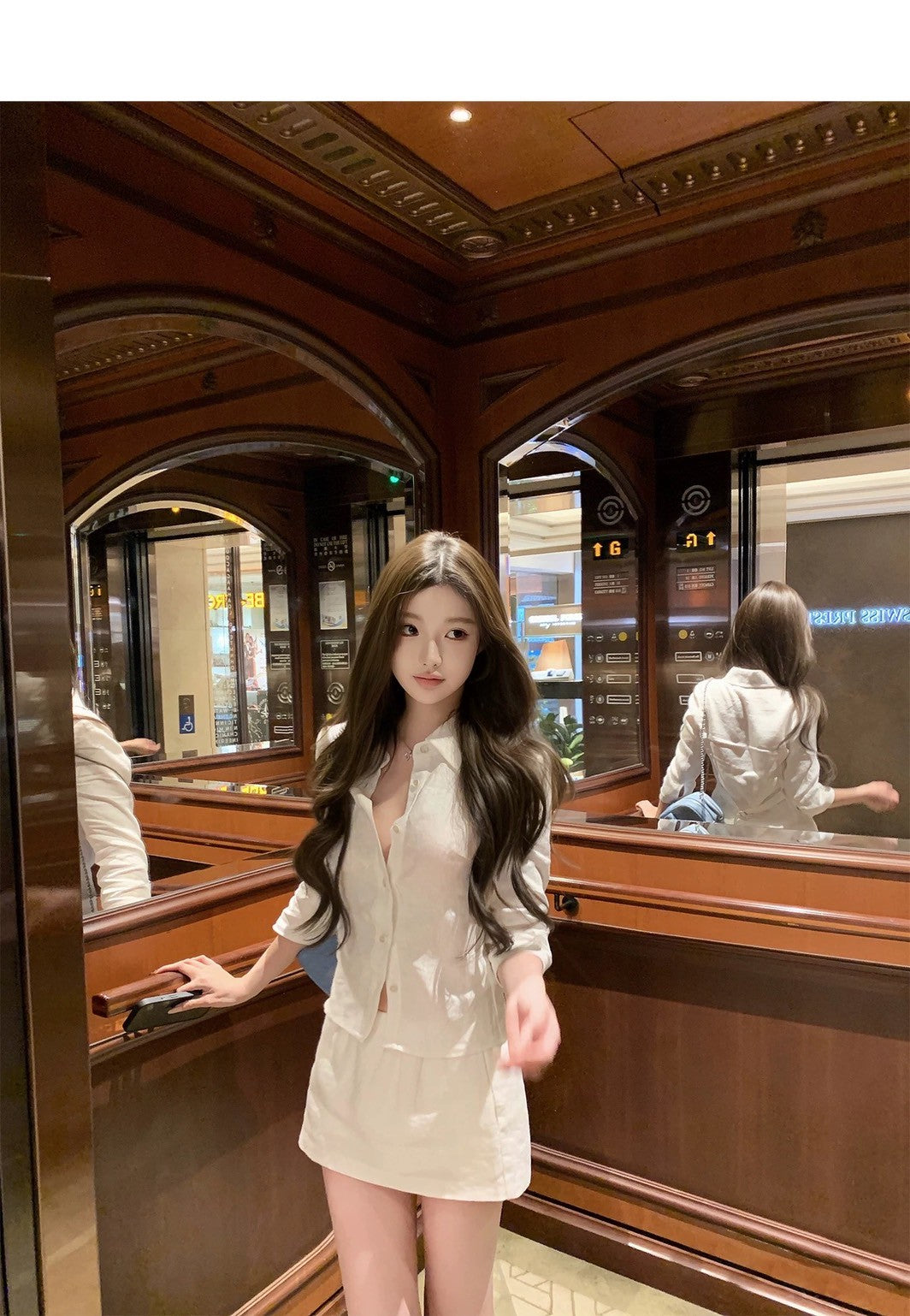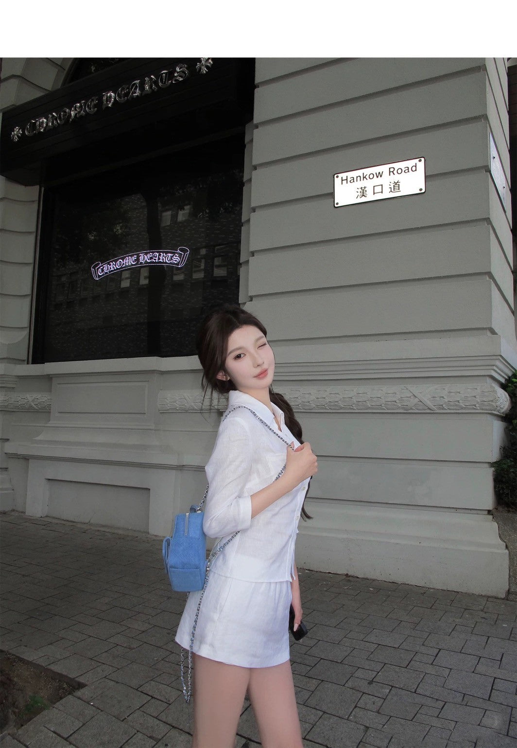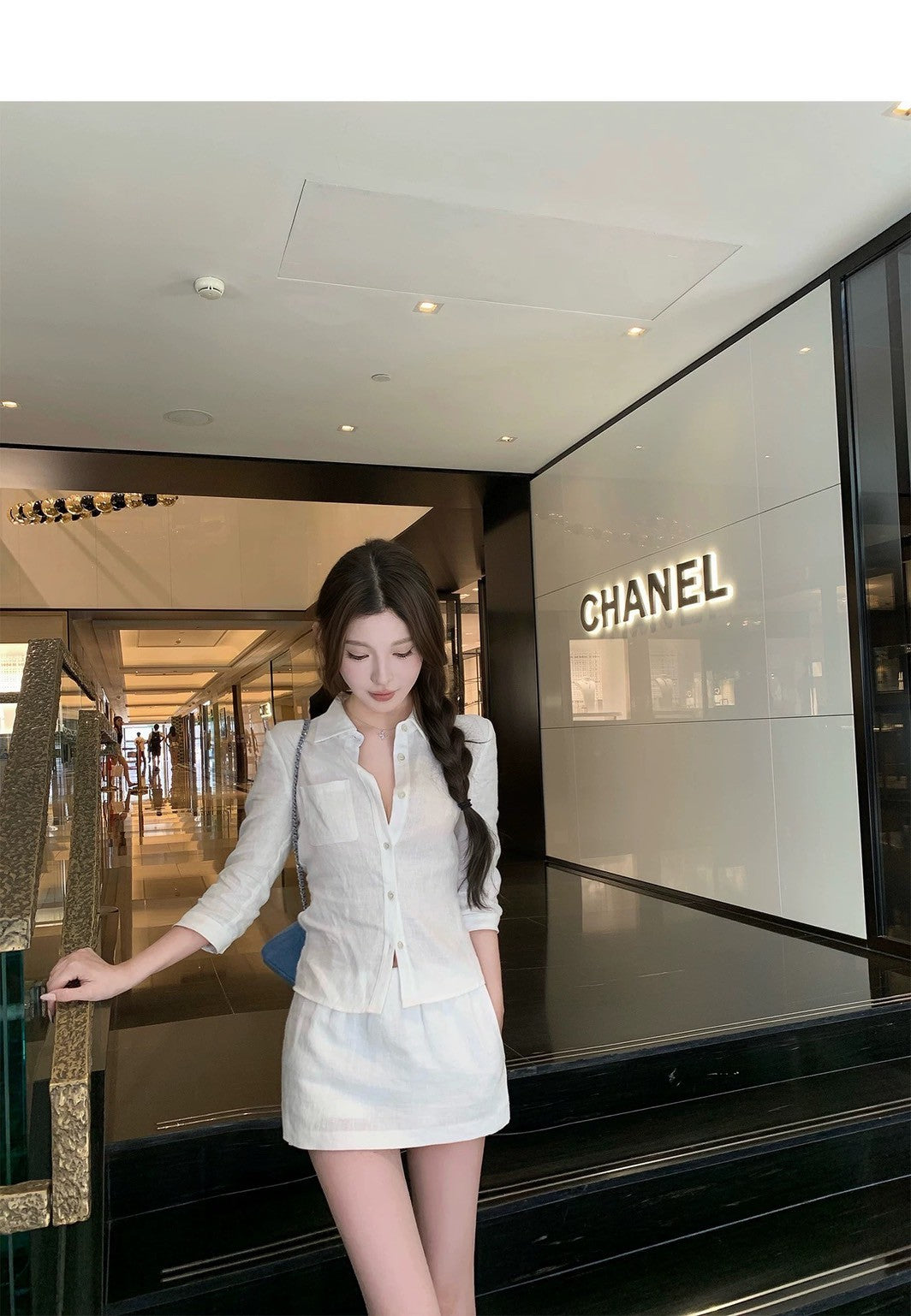 25Aug. 亞麻物語簡約七分袖襯衫低腰褲裙套裝 白色