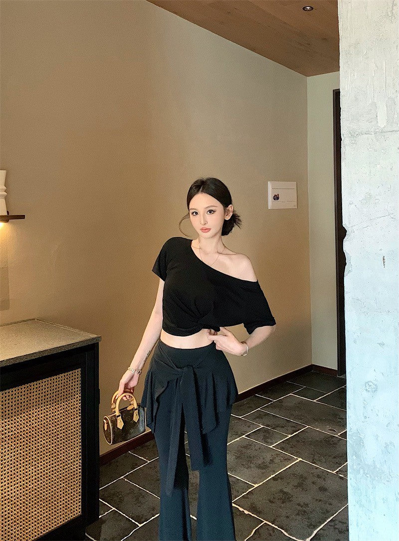 25Aug. 休閒簡約扭結收腰斜肩上衣 白/灰/黑