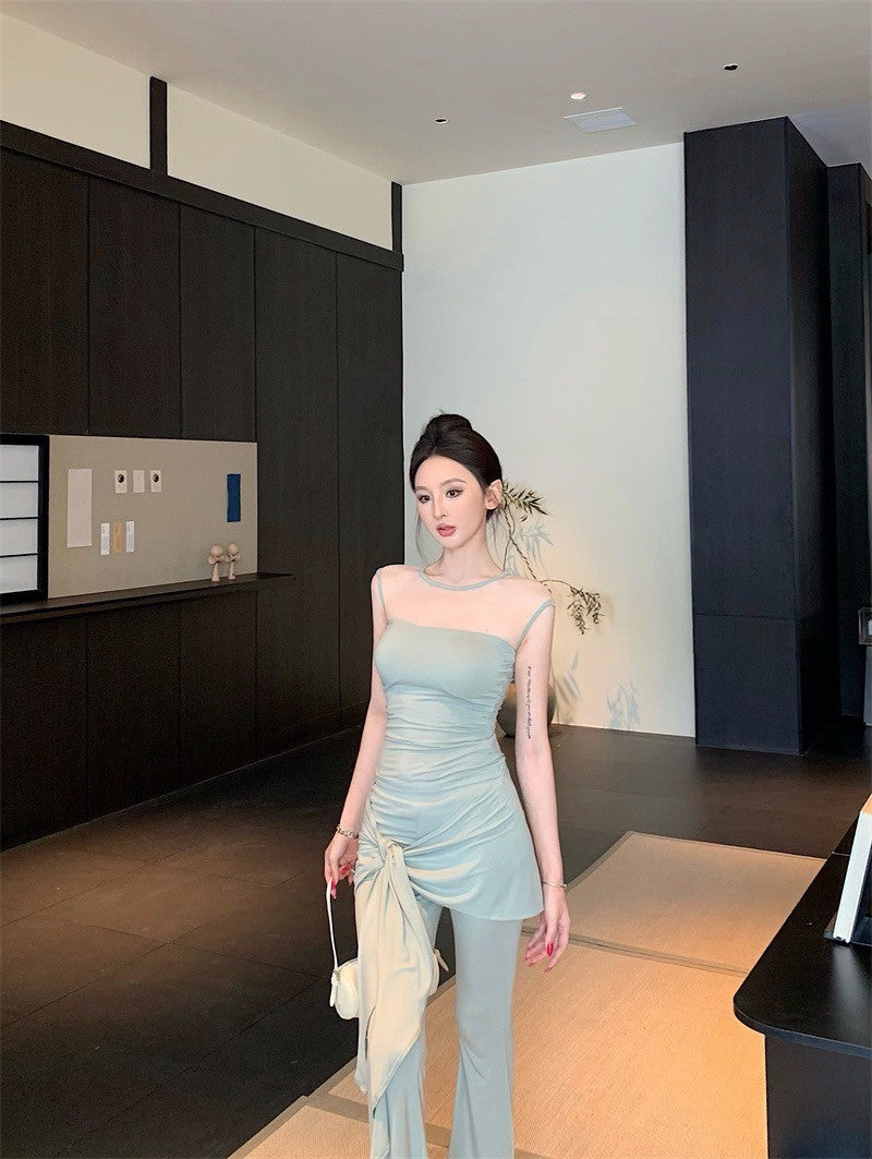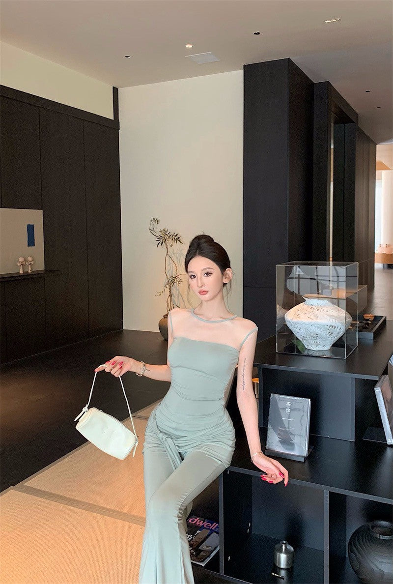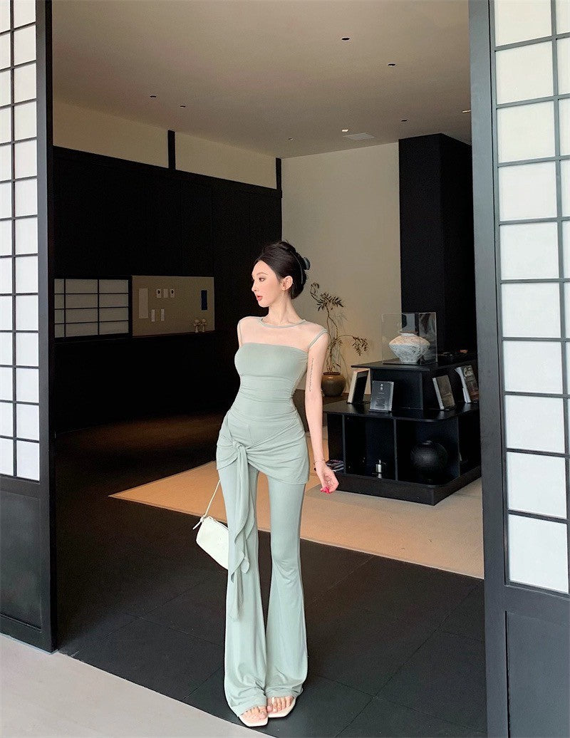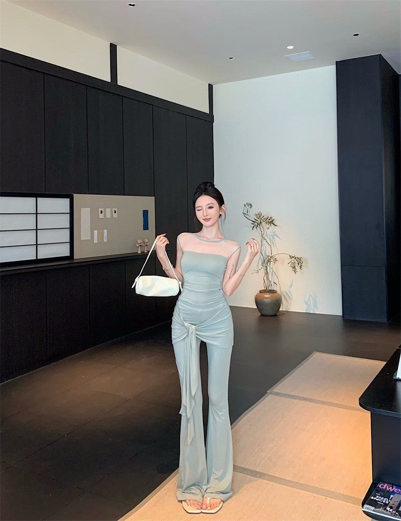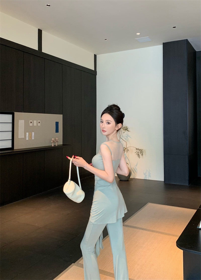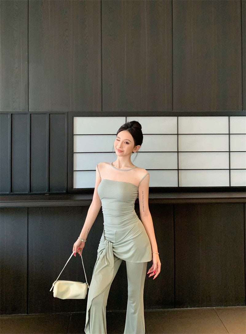 25Aug. 古典視覺網紗拼接上衣綁帶休閒褲套裝 豆沙綠