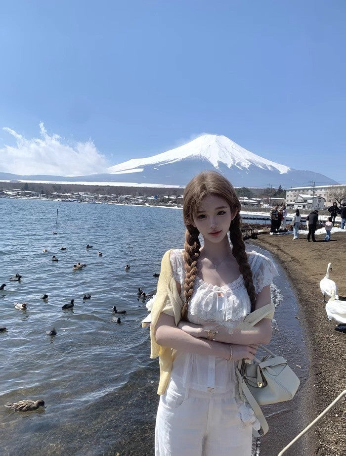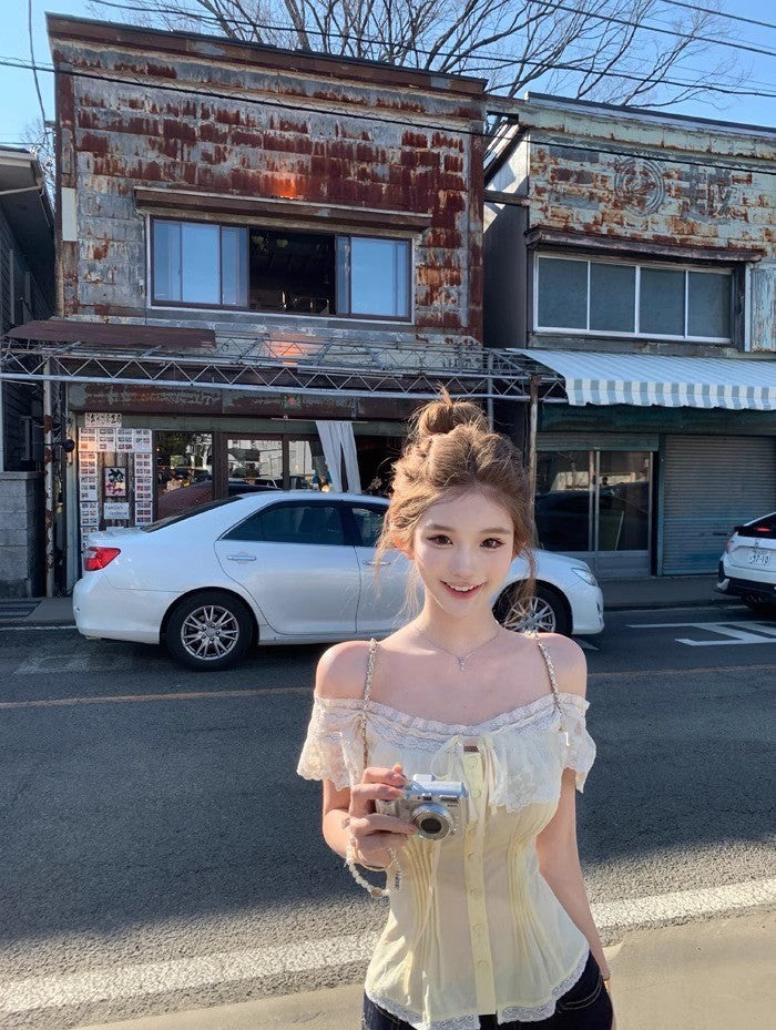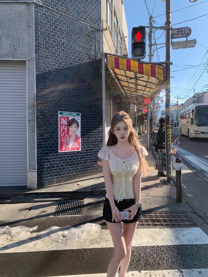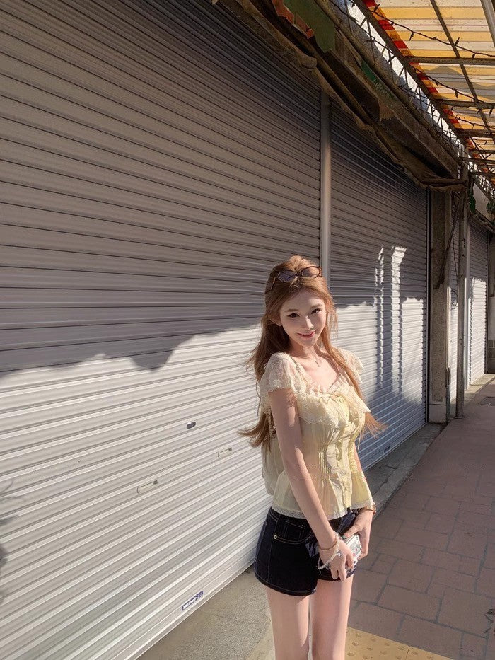 25Aug. 心動小白花微透視抽繩花上衣 白/黃