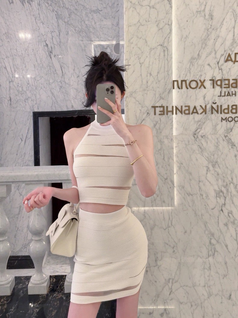 25Aug. 性感純欲嫵媚特殊工藝針織背心半身裙套裝 白/黑