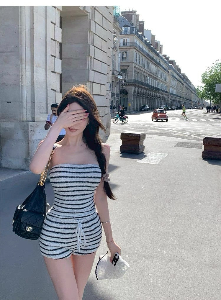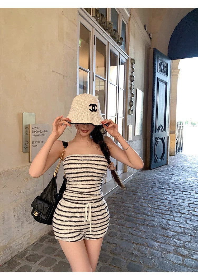 25Aug. 法香特殊織機紡藝條紋抹胸短褲套裝
