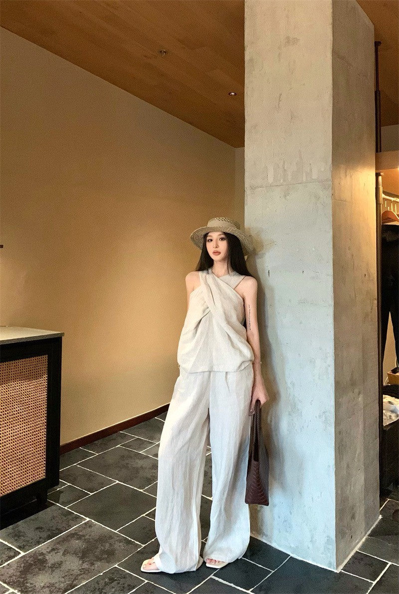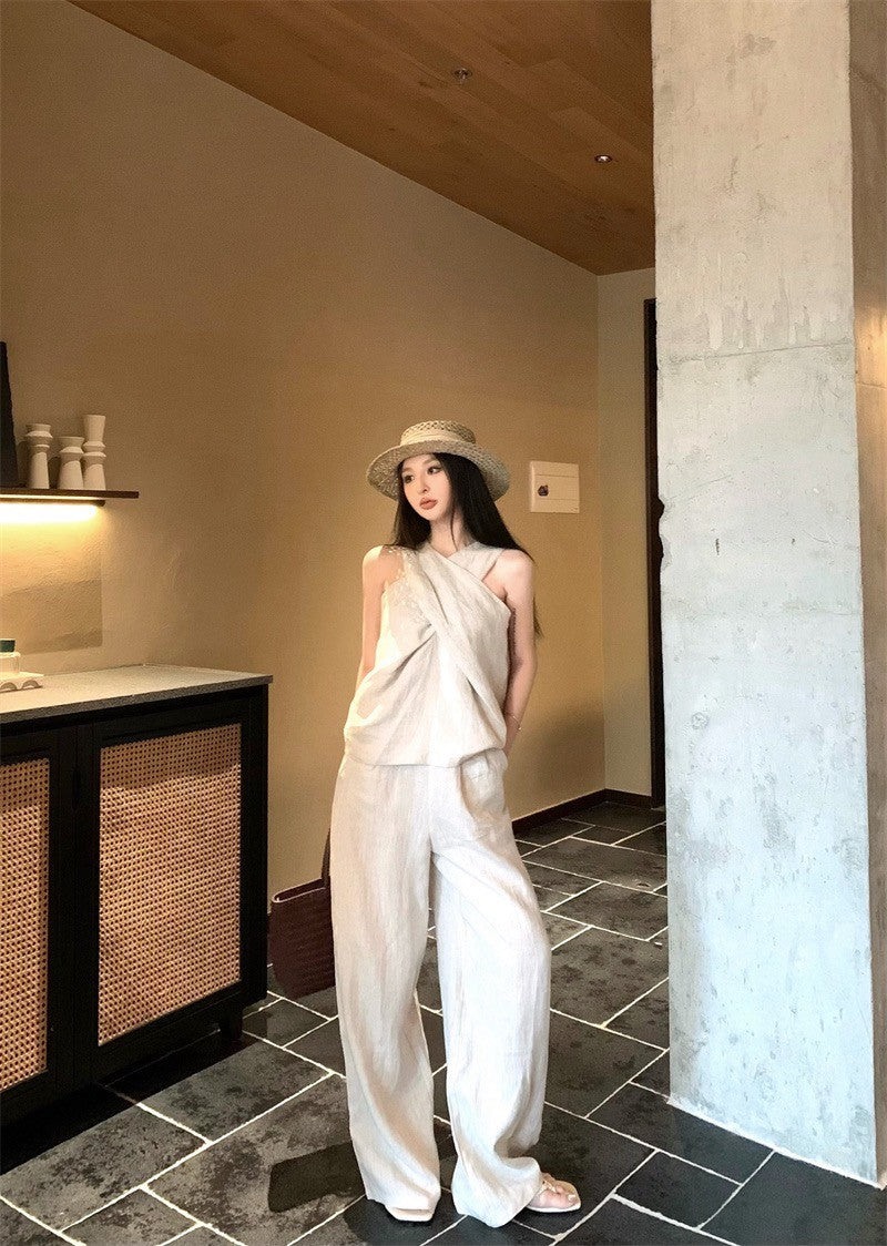 25Aug. 老錢鬆弛不費力交叉設計背心闊腿褲套裝 亞麻色