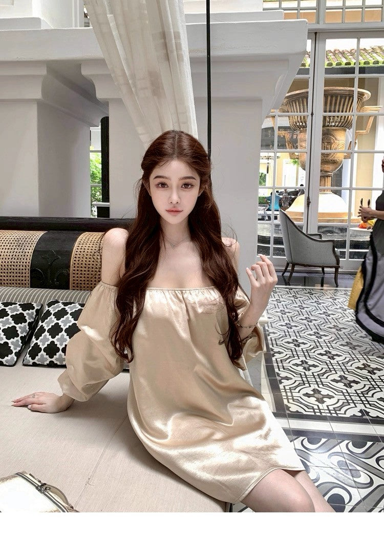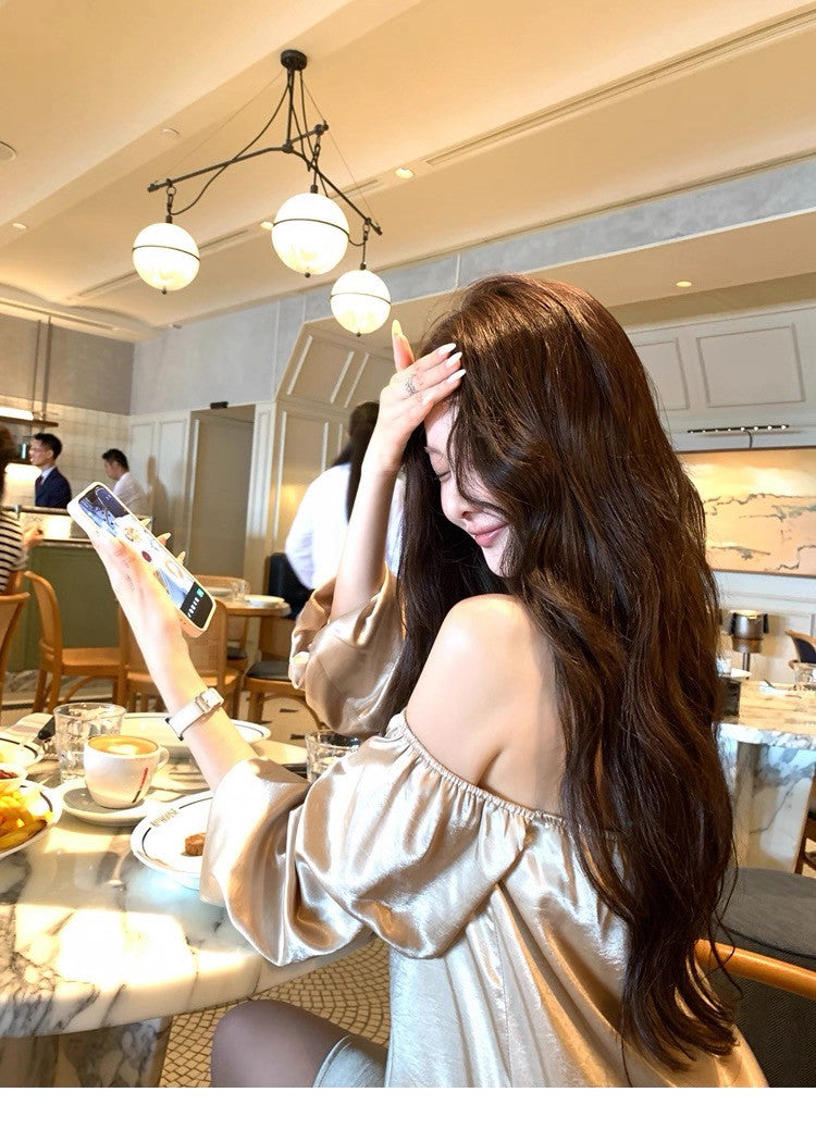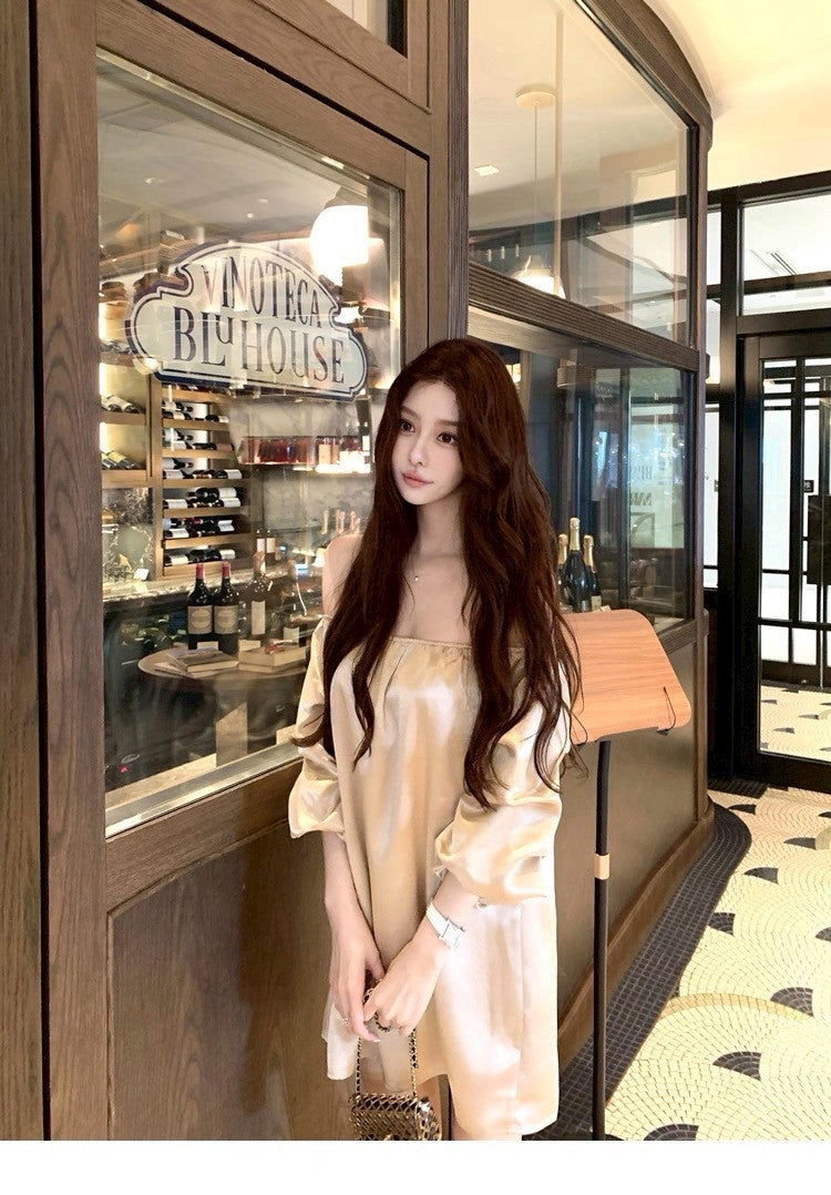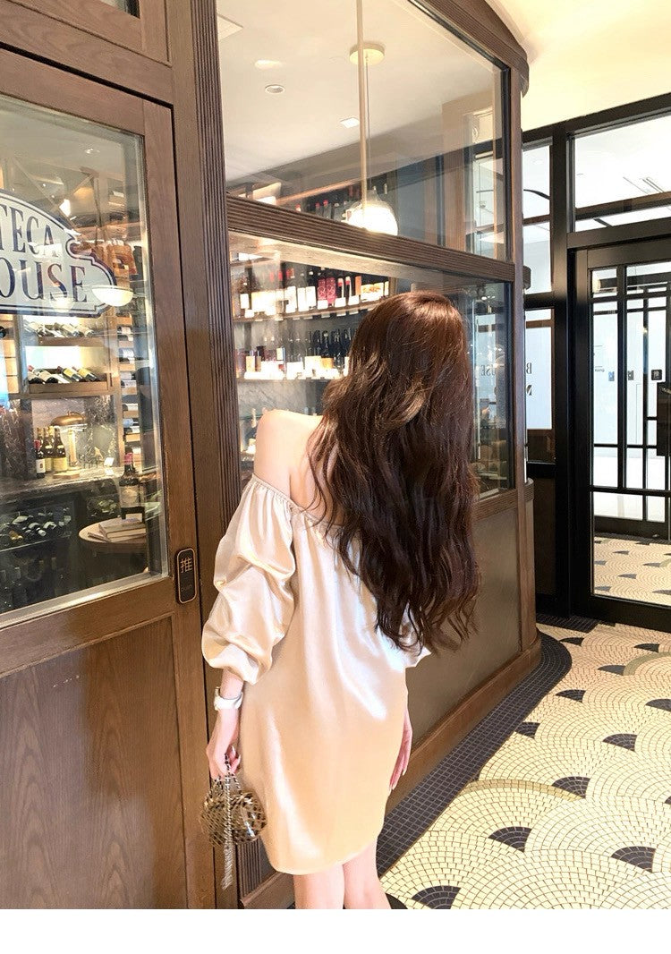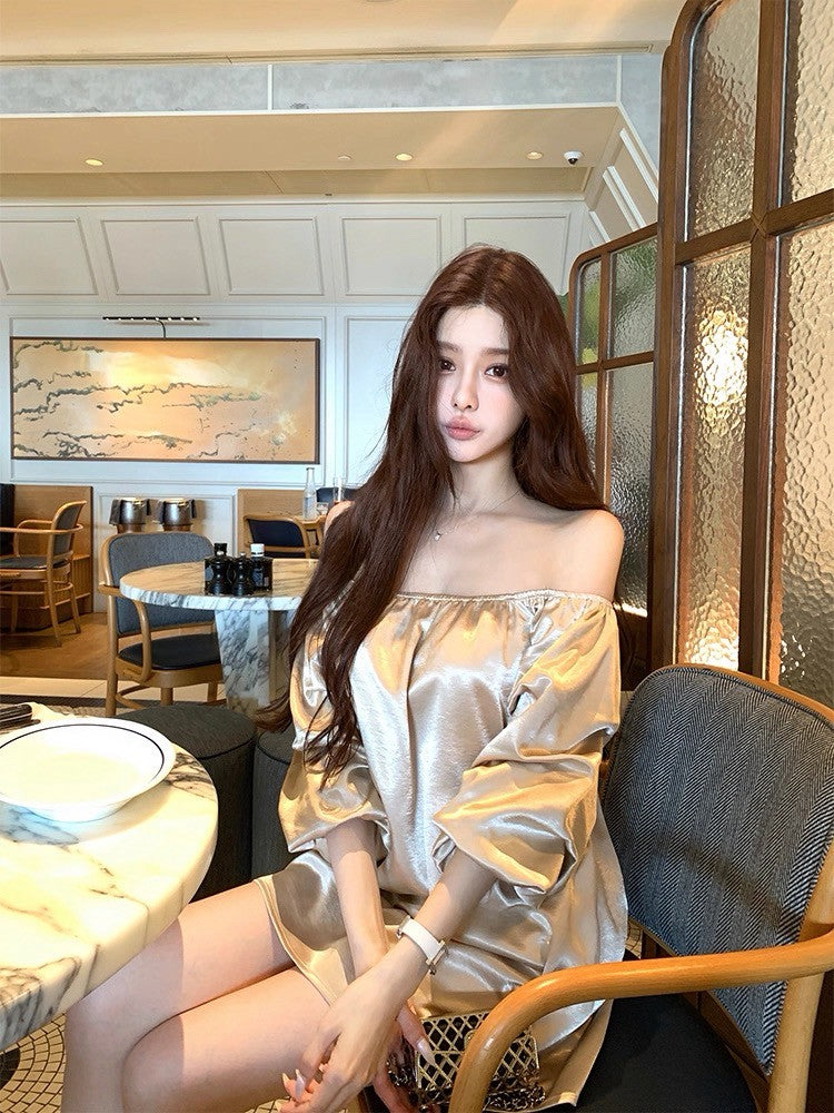 25Aug. 鎏金缎 水波紋高雅兩穿一字領連身裙