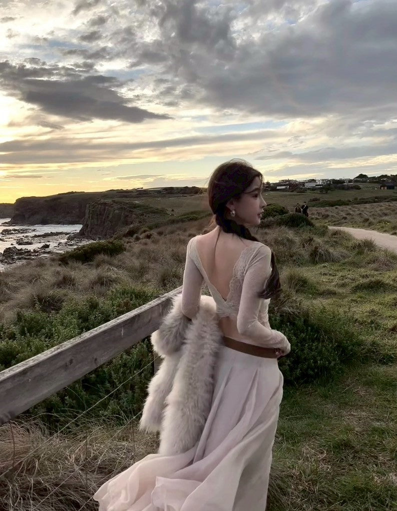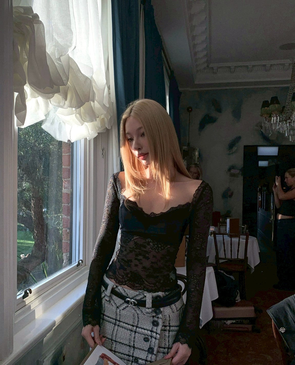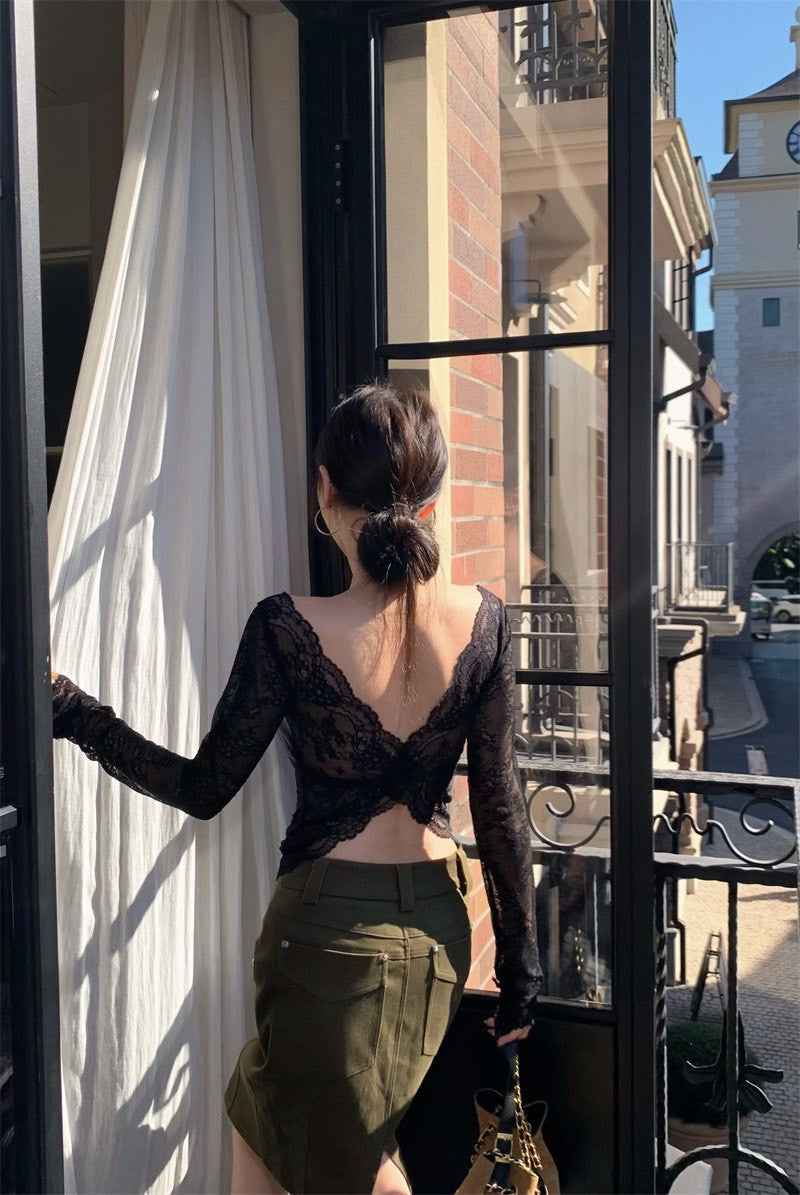 25Dec. 性感掛捕夢蕾絲拼接高彈美背上衣 杏/黑