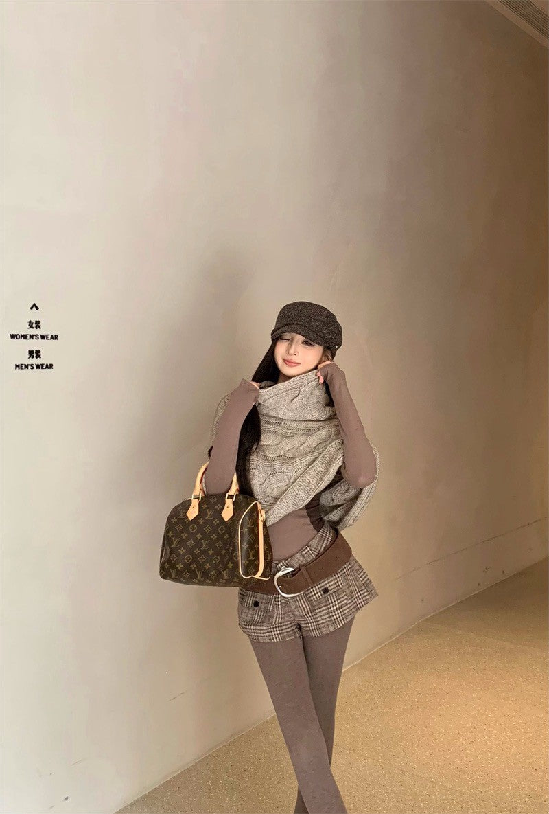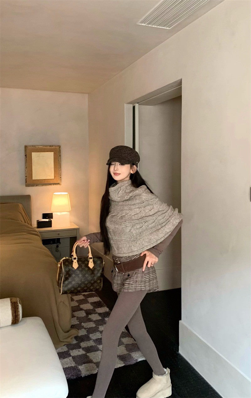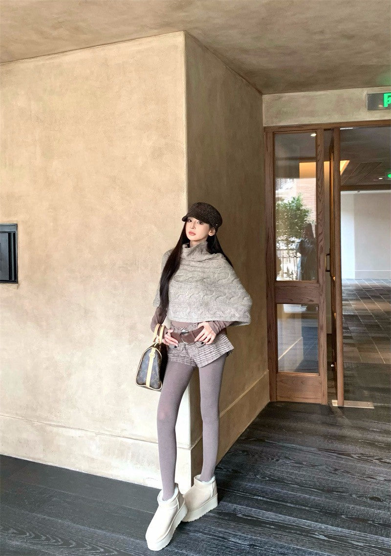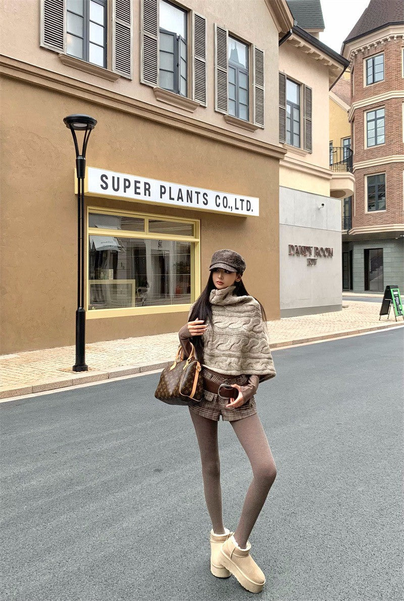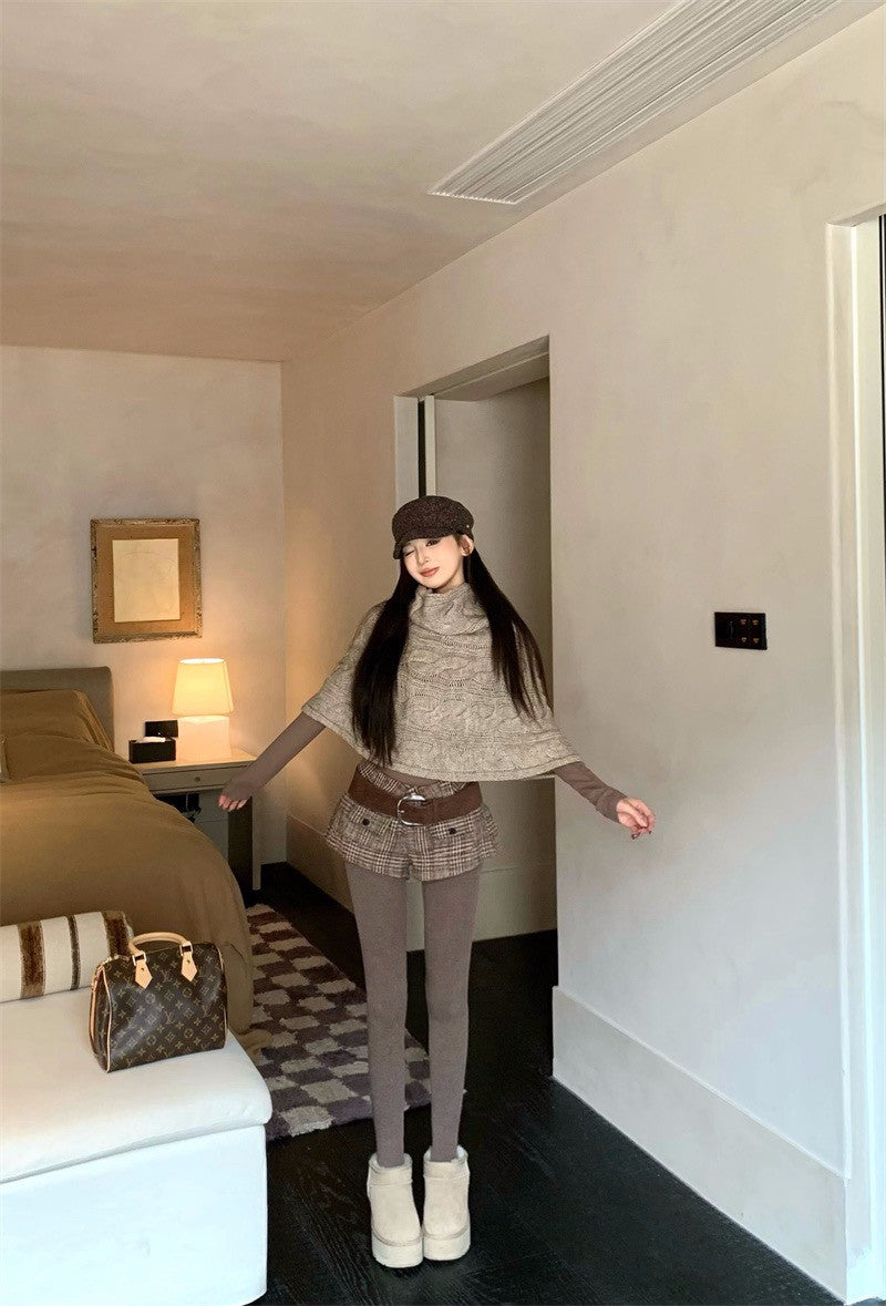 25Dec. 斗篷均碼多用法式花紗針織/英格蘭復古格紋短褲 卡其色系