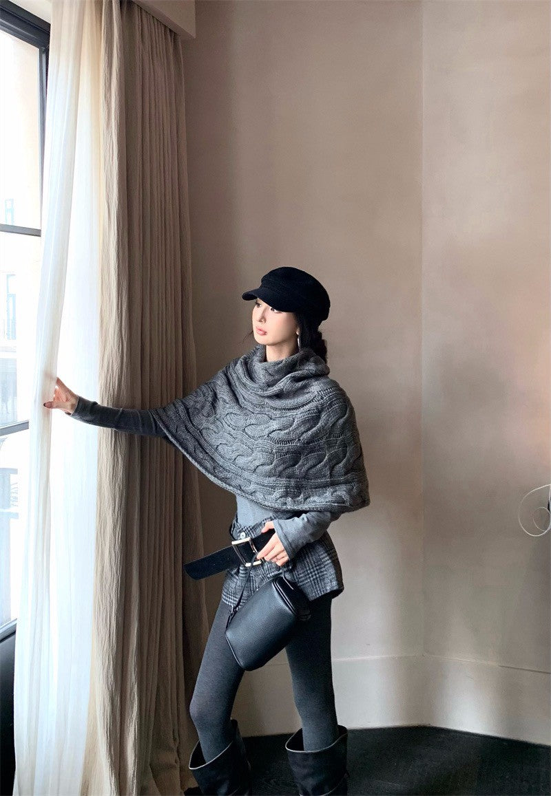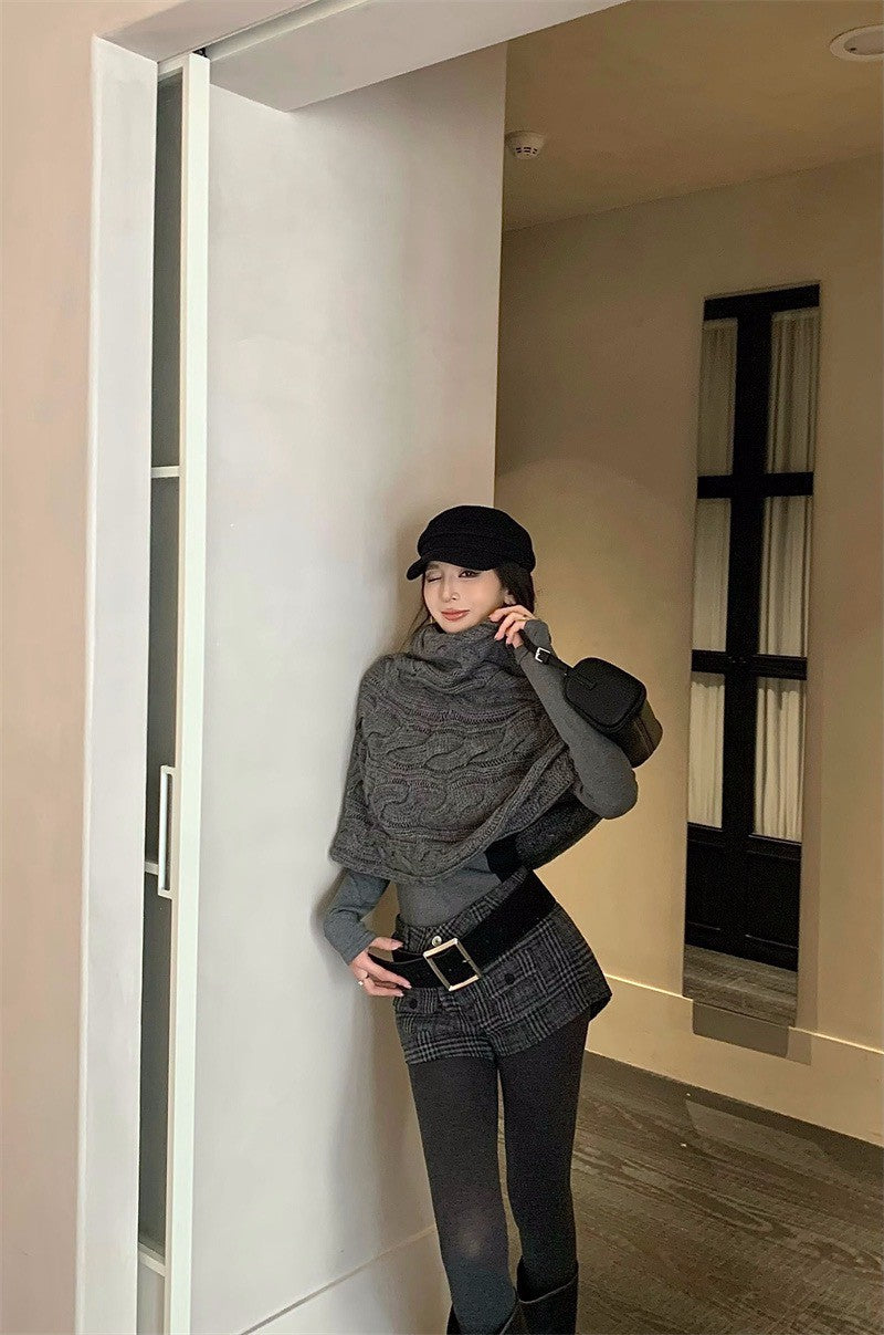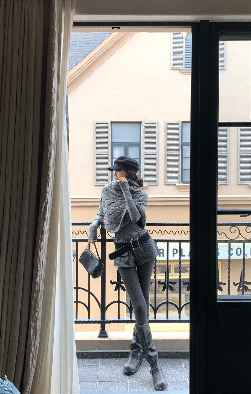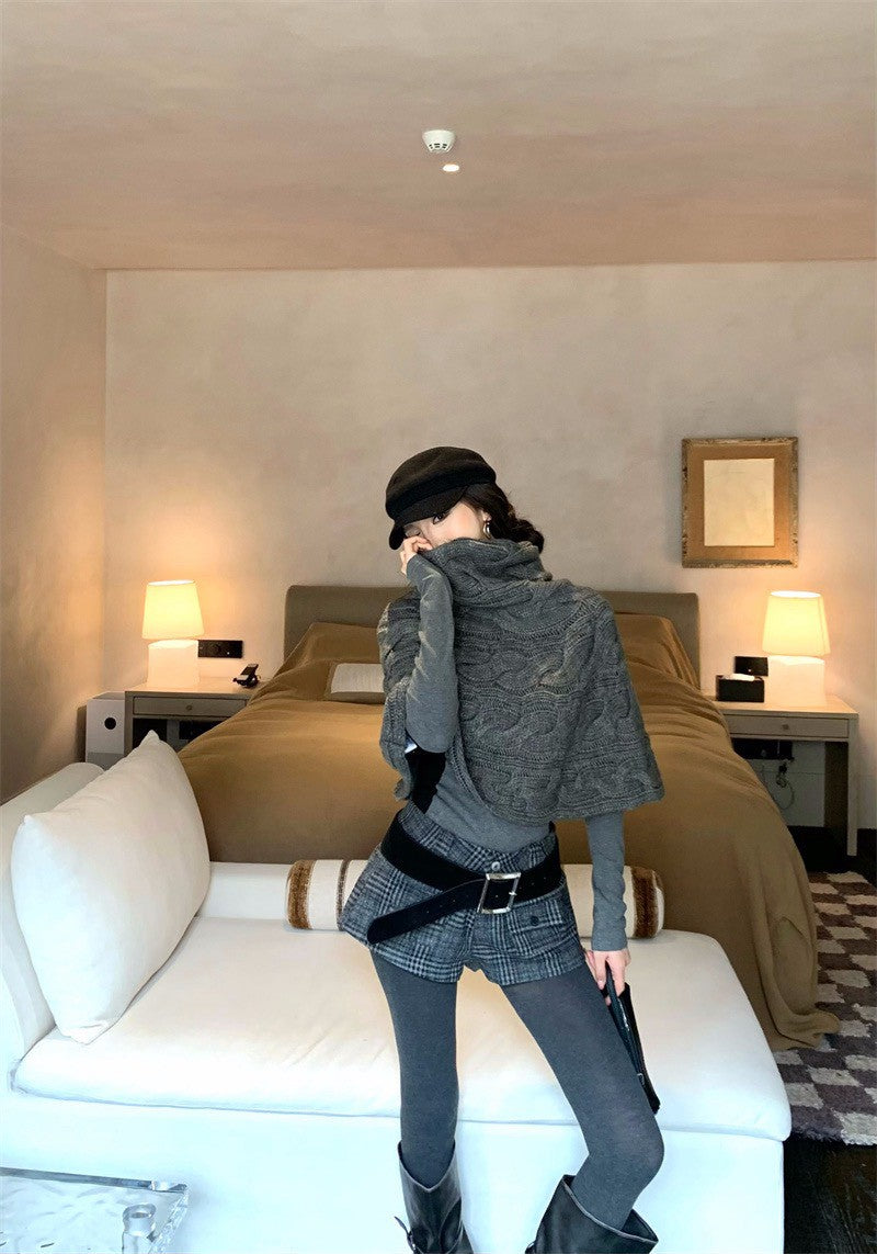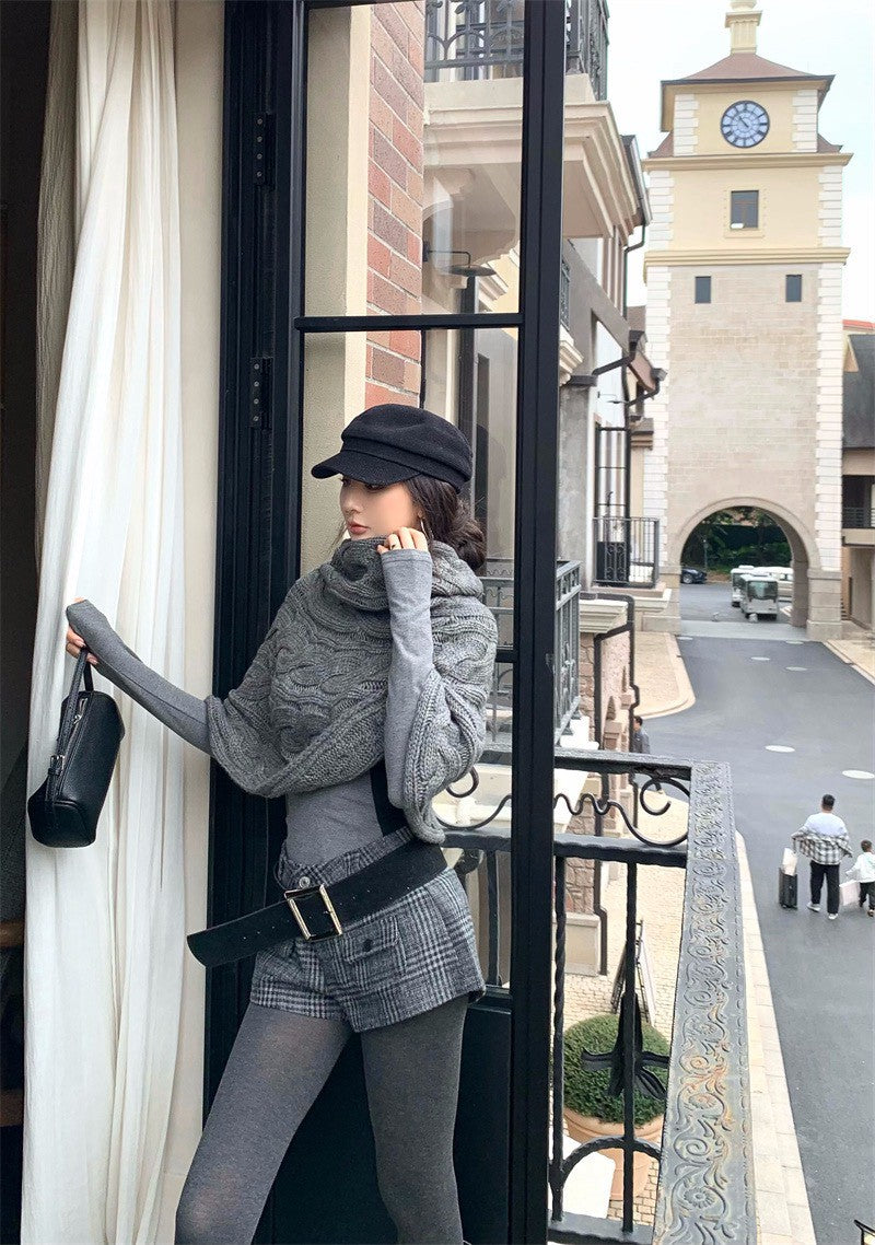 25Dec. 斗篷均碼多用法式花紗針織/英格蘭復古格紋短褲 灰色系
