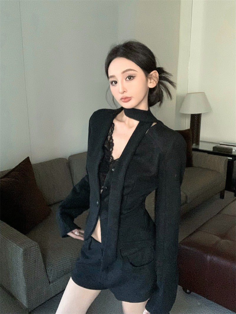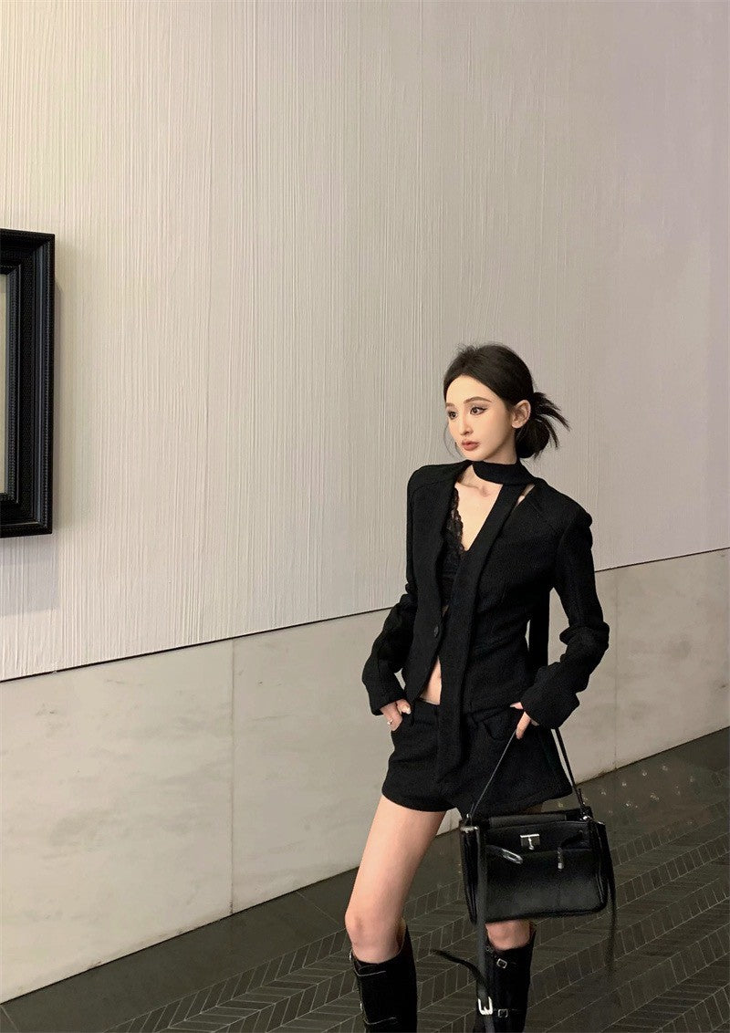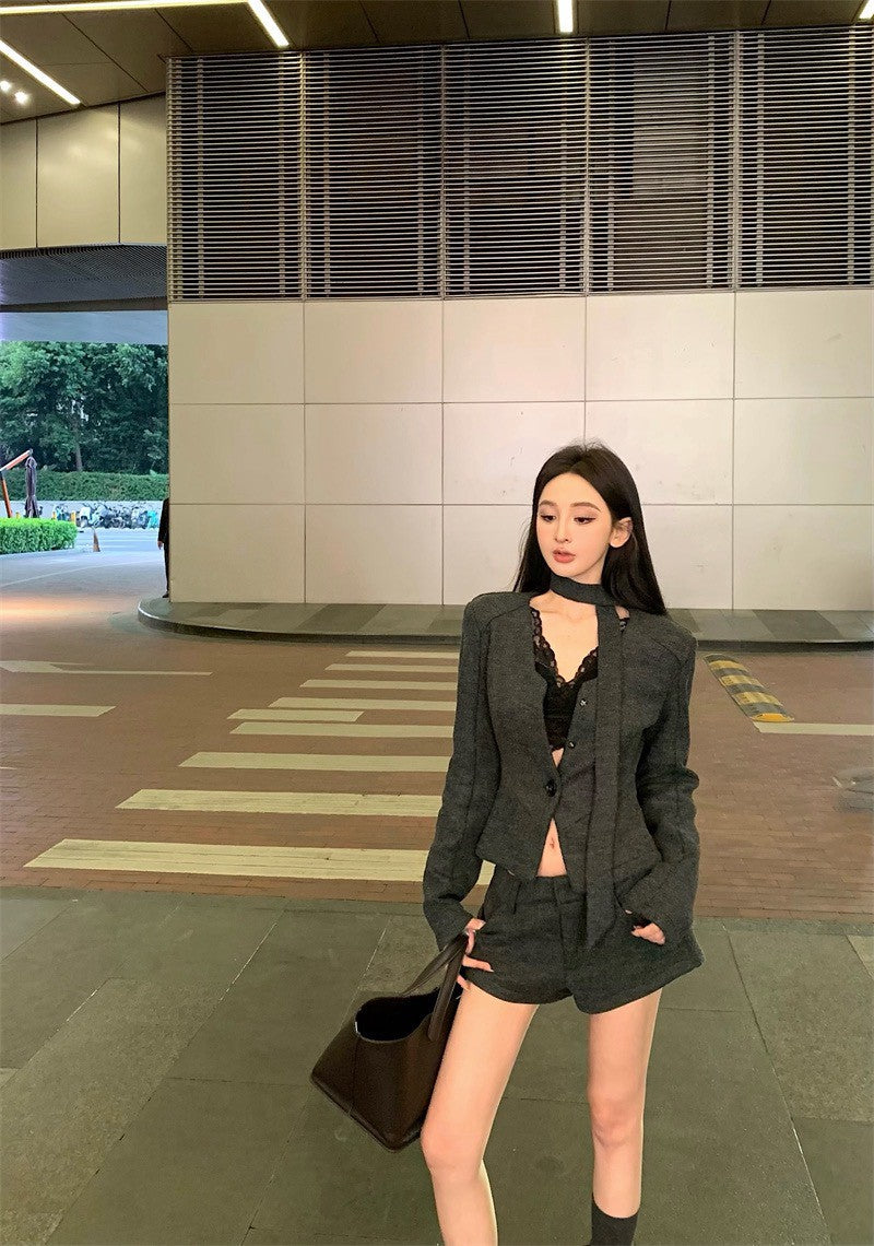 26Jan. 復古收腰西裝飄帶低腰短褲套裝 灰/黑