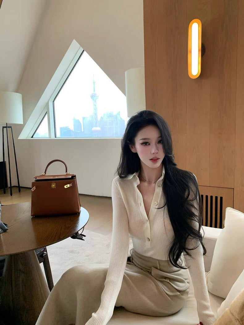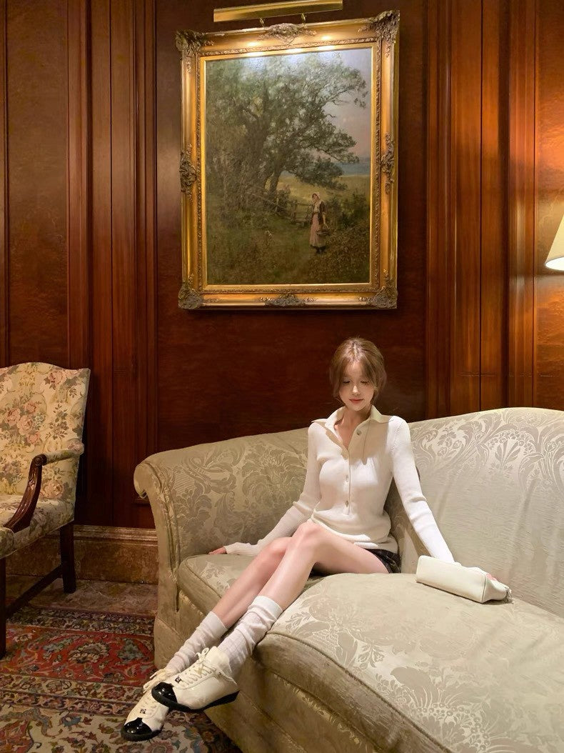 26Jan. 法式老錢 細膩polo排扣針織長袖上衣 白/藍