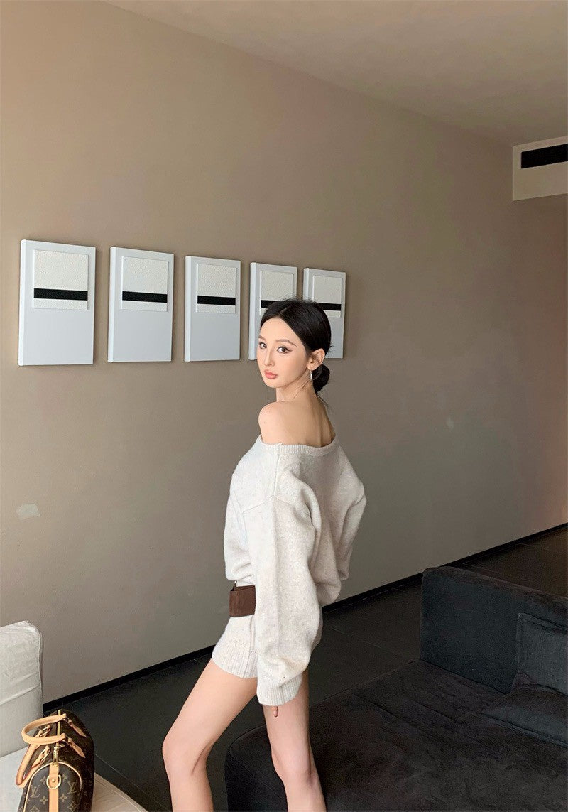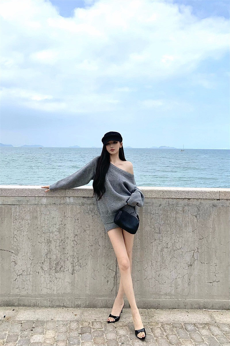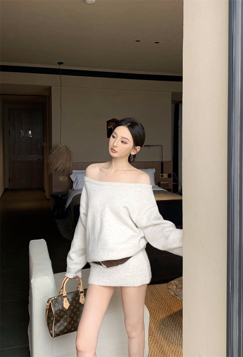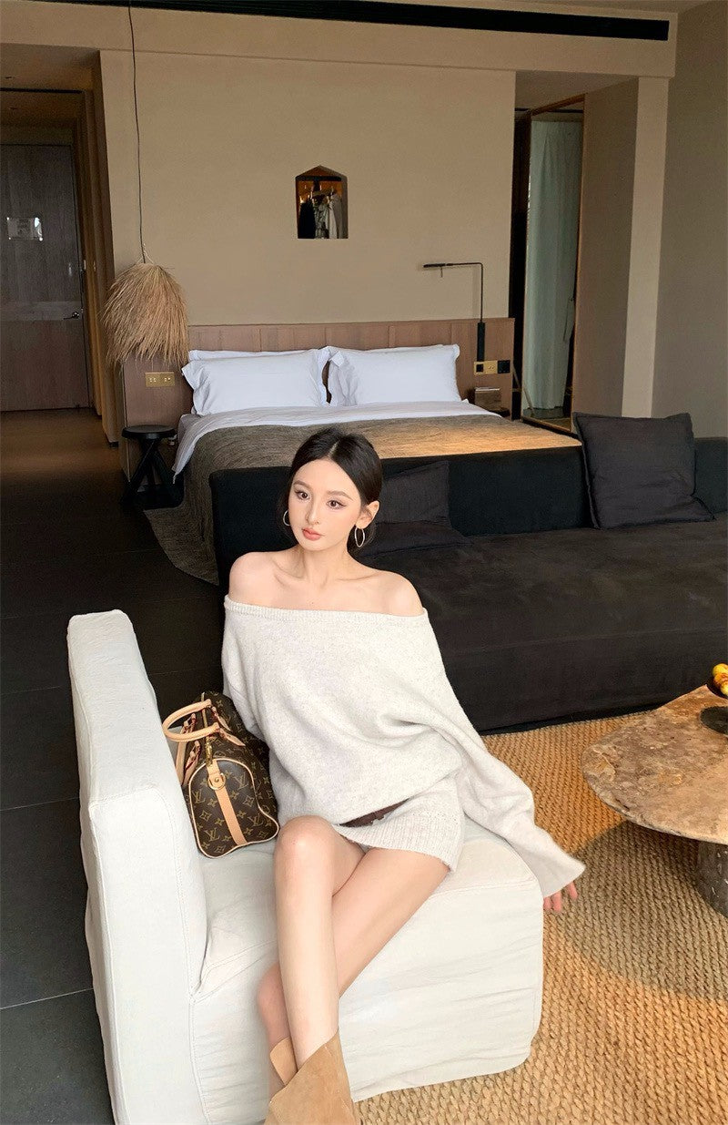 26Jan. 溫柔復古一字領連身針織裙套裝 灰/杏