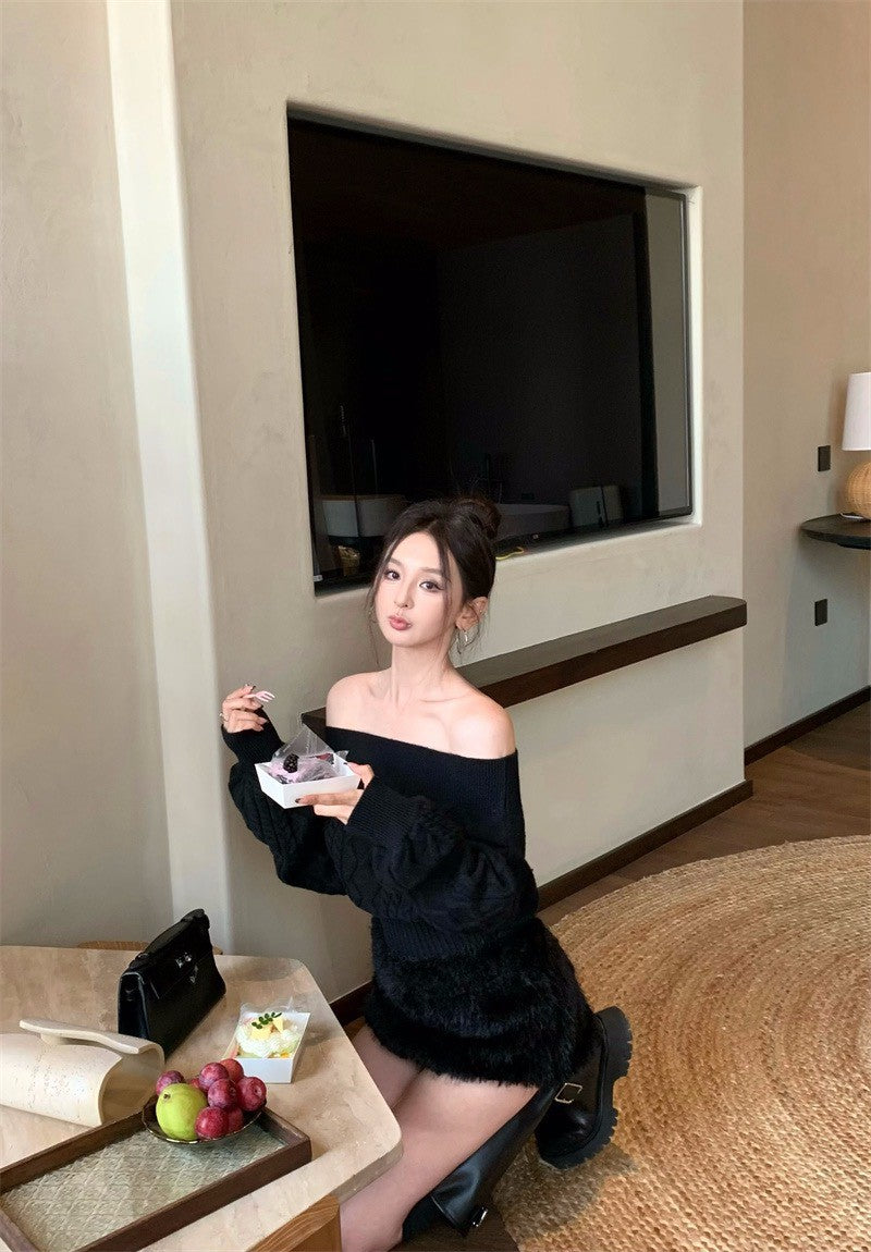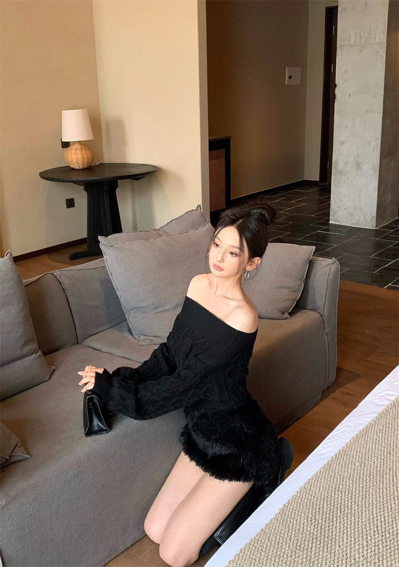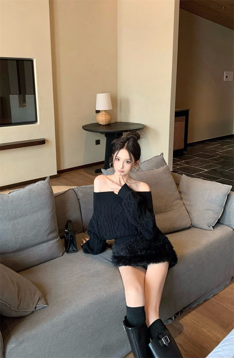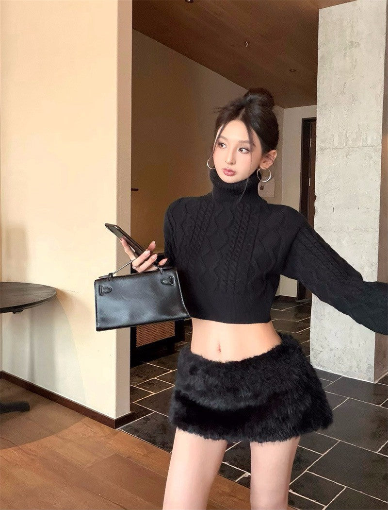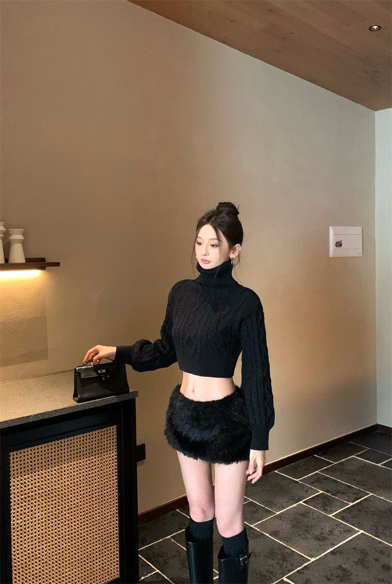 26Jan.精緻姐姐兩穿高彈麻花針織上衣 辣妹毛毛褲裙 黑