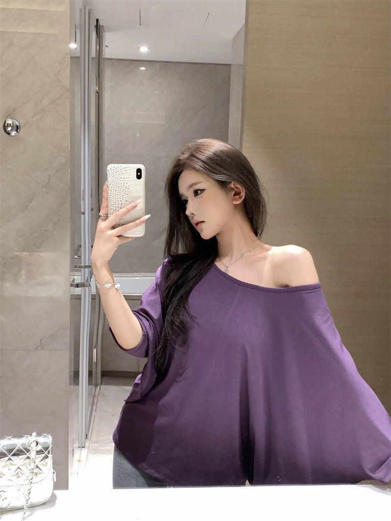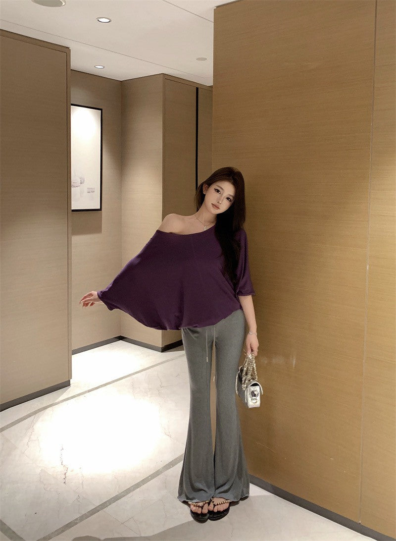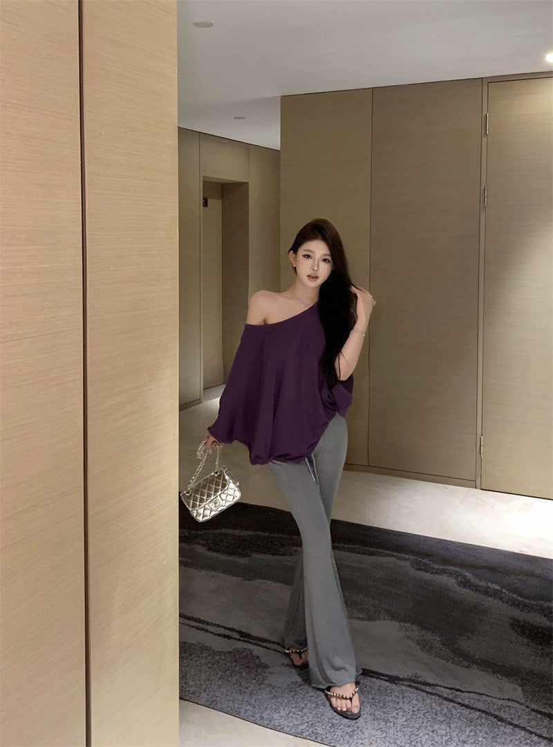 26Jan. 隨性休閒蝙蝠袖斜領紫色上衣 彈力休閒灰色喇叭褲