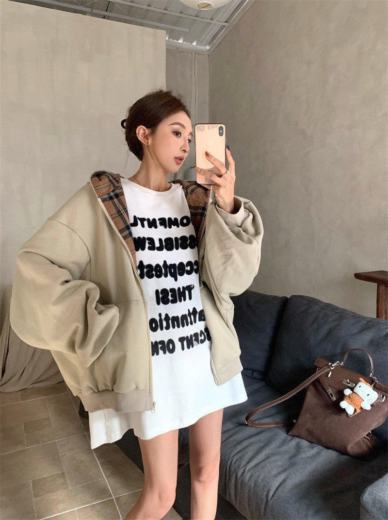 25Jul. 休閒時髦精 格紋拼接連帽外套 杏卡