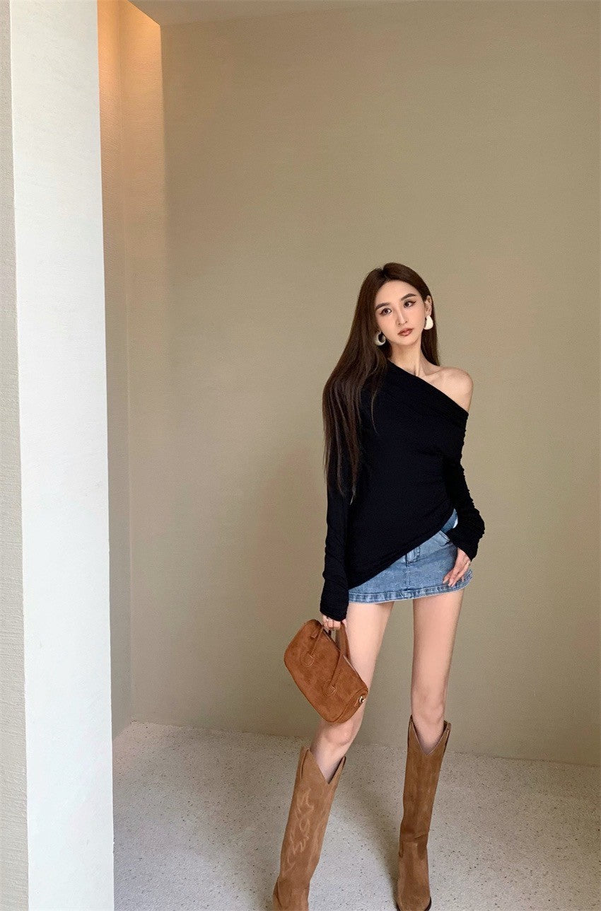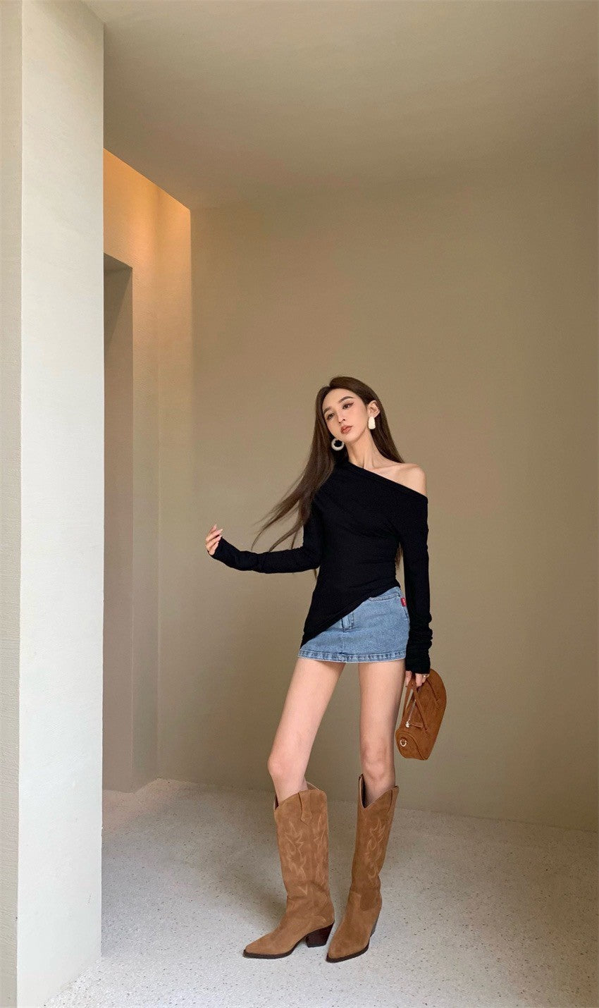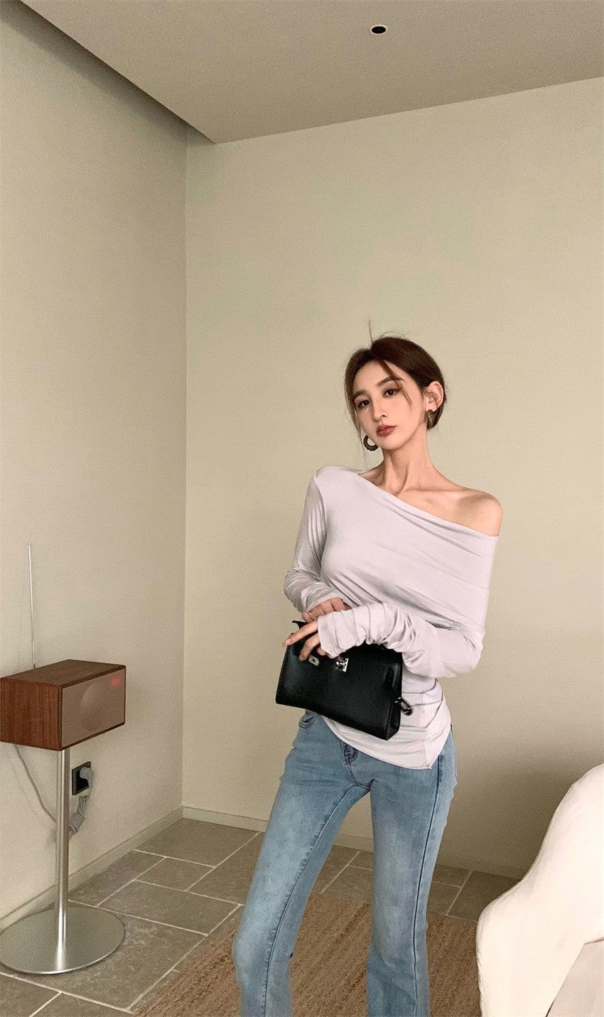 25Jul. 復古熱潮 斜肩彈力面膜踢 淺灰/黑