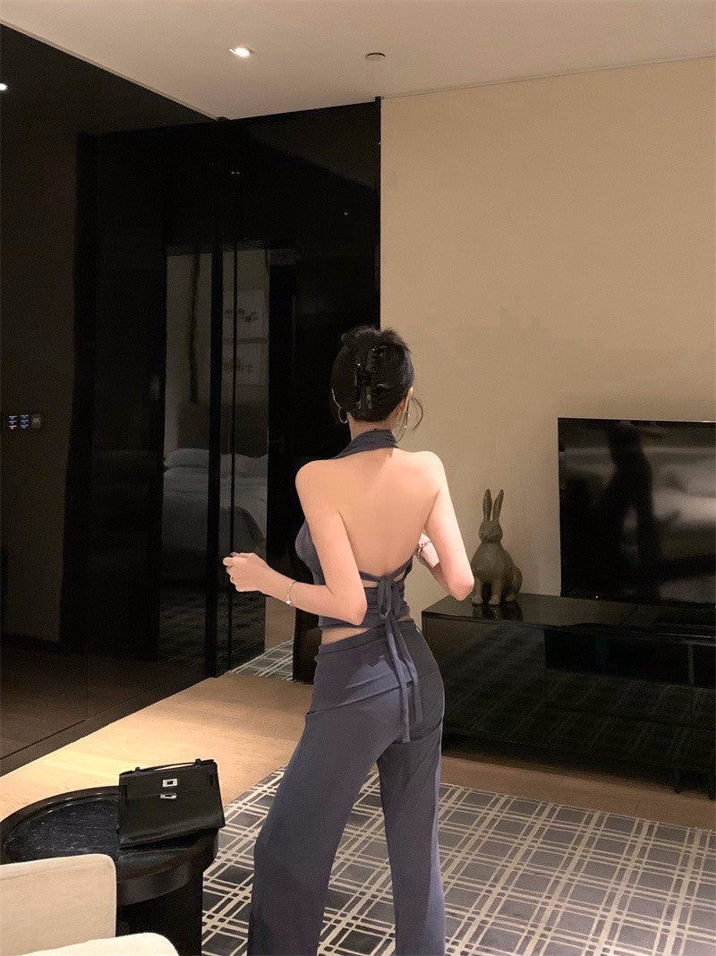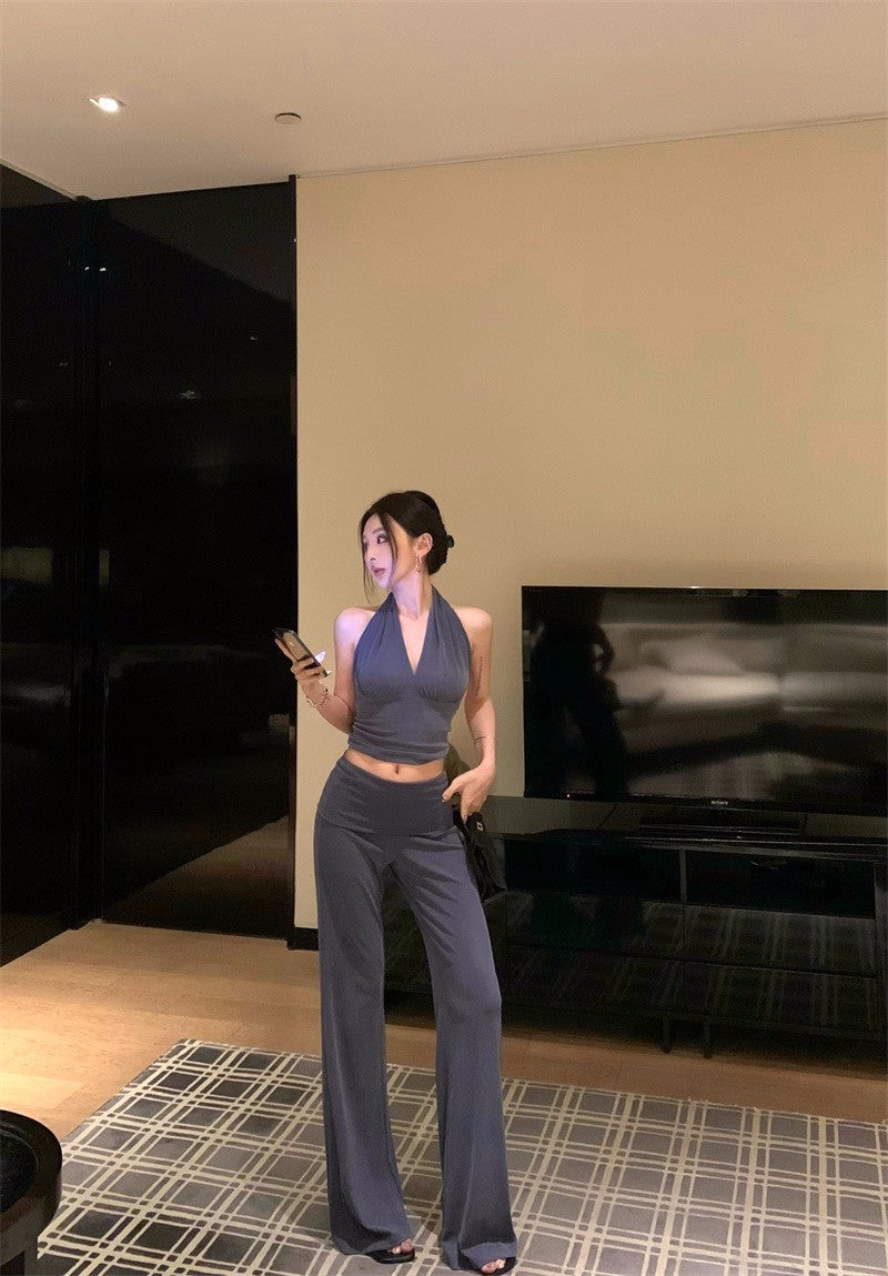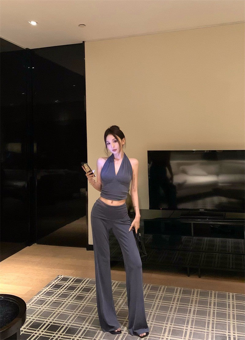 25Jul. 復古辣妹 掛脖V領收腰背心反折休閒褲套裝 藍