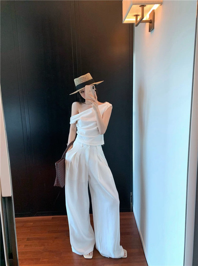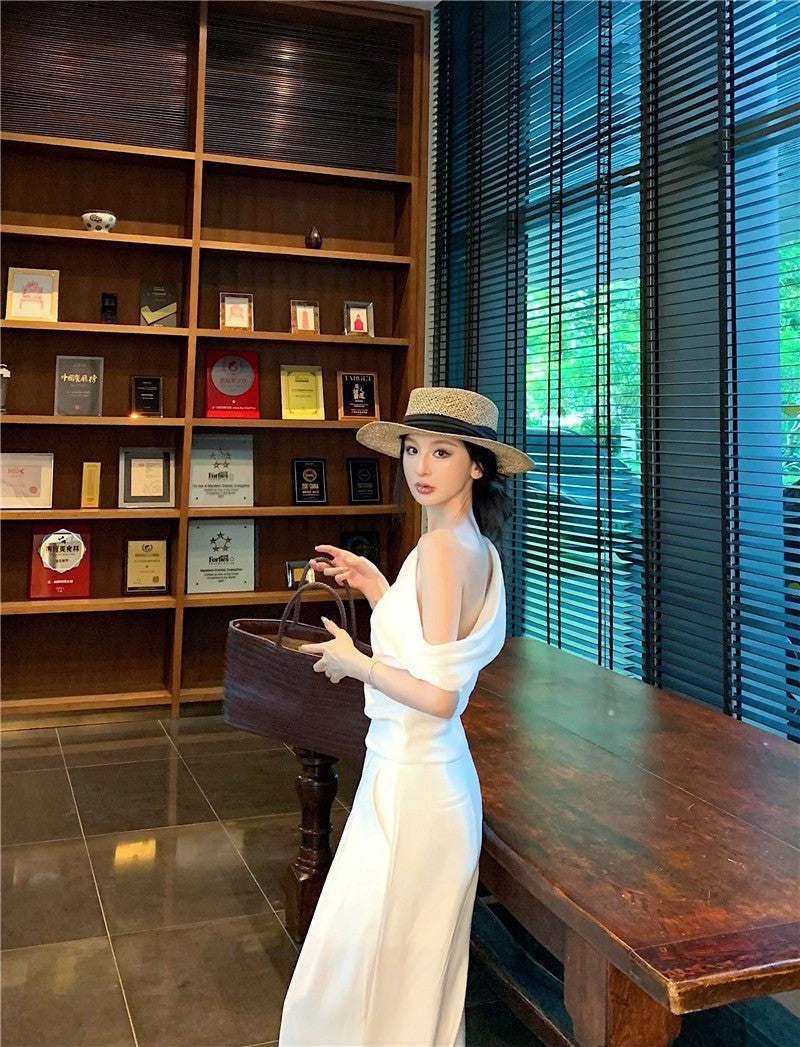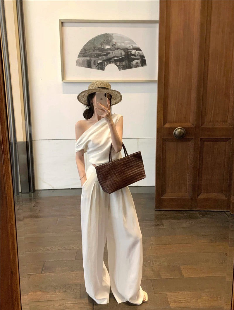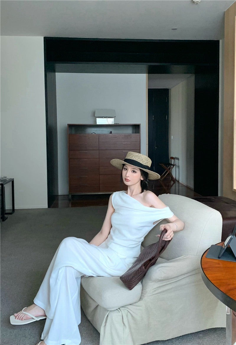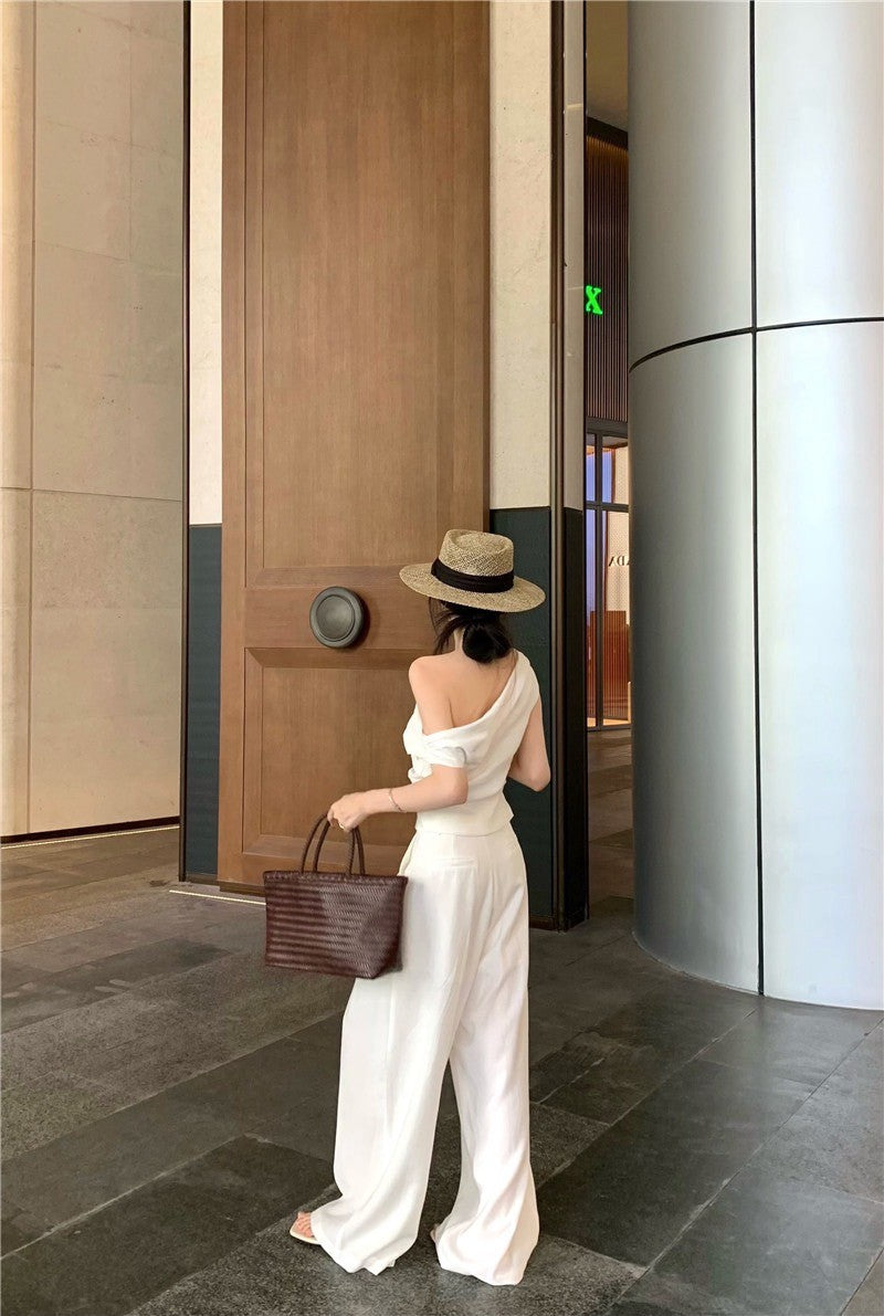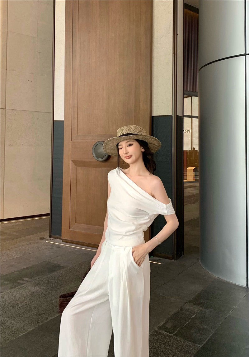 25Jul. 渡假老錢 新款清甜系斜肩褶皺上衣長褲套裝