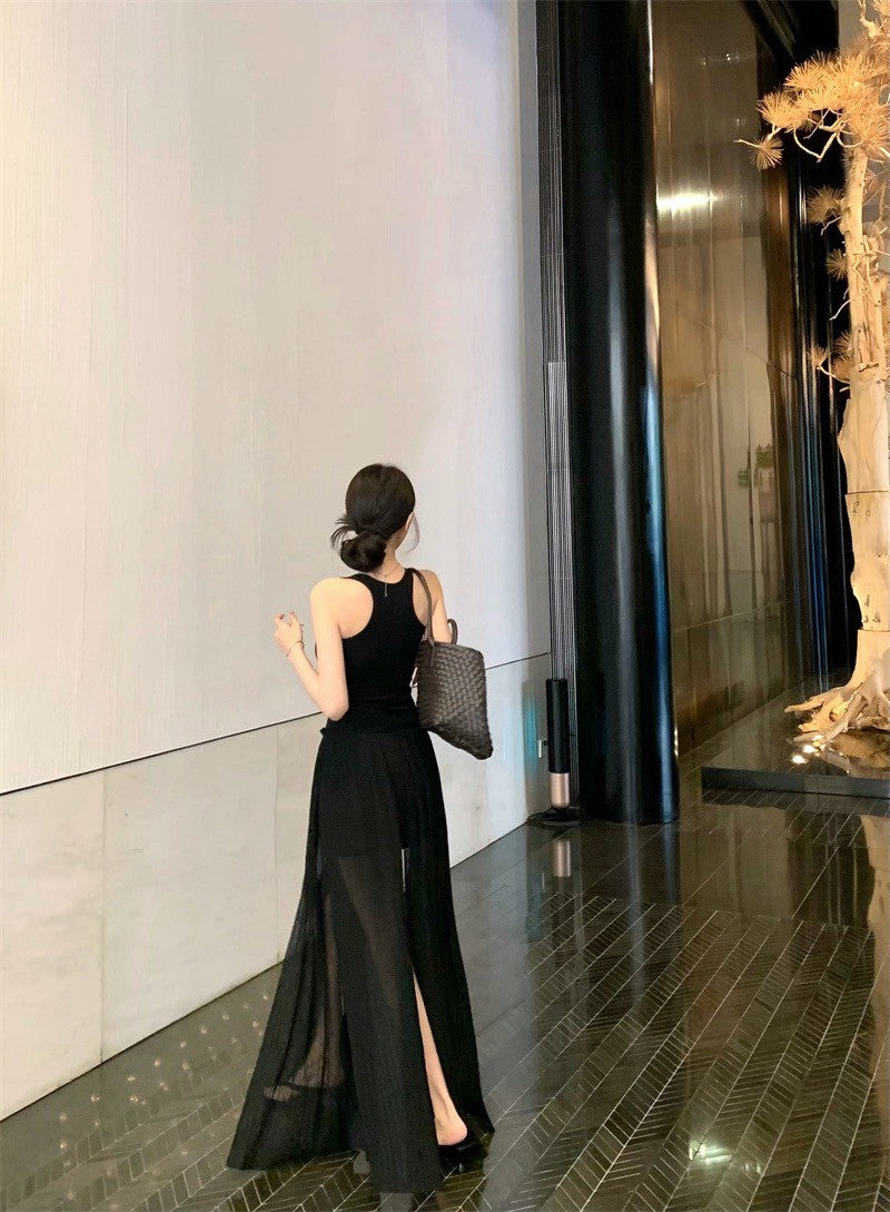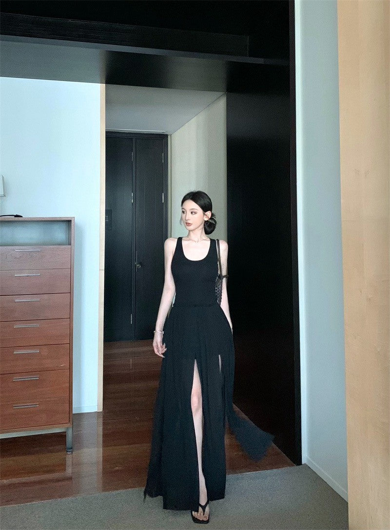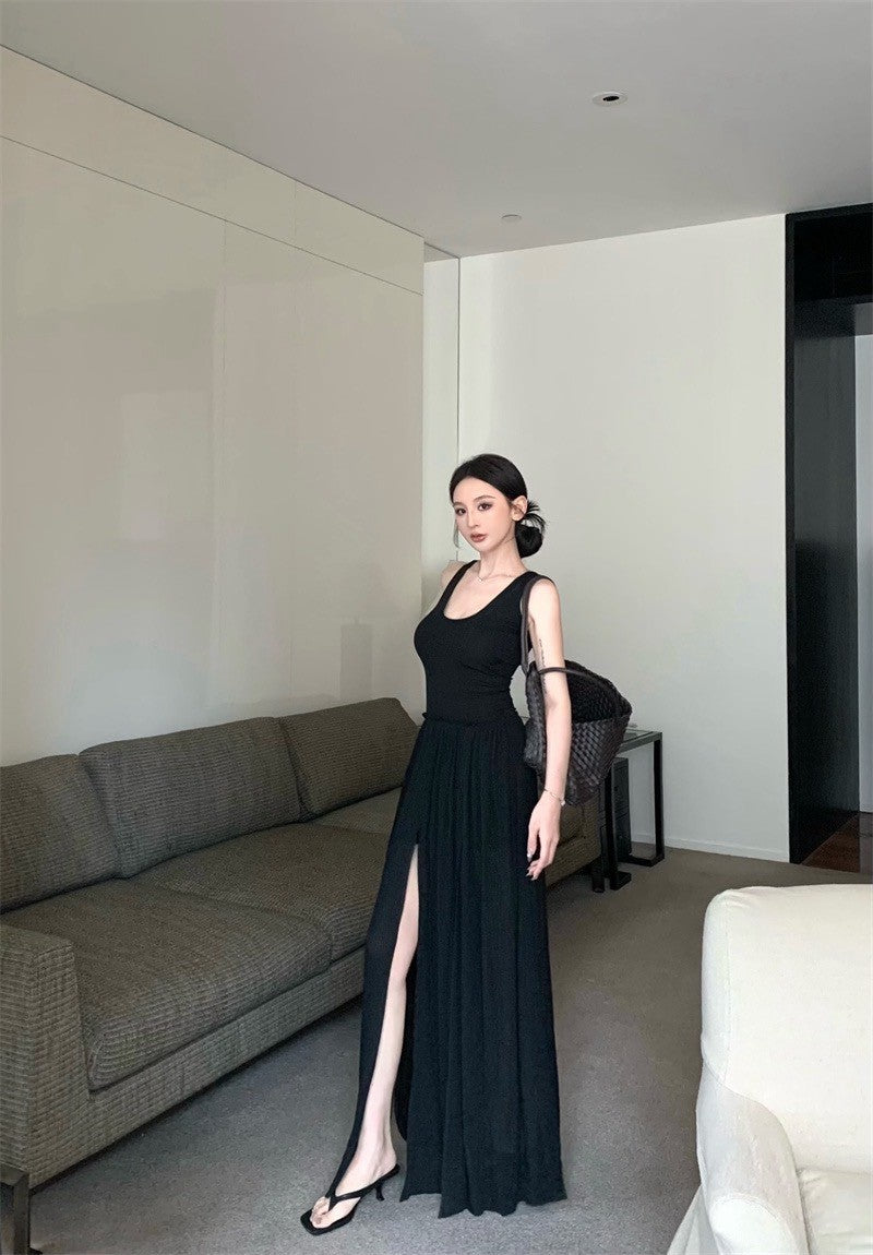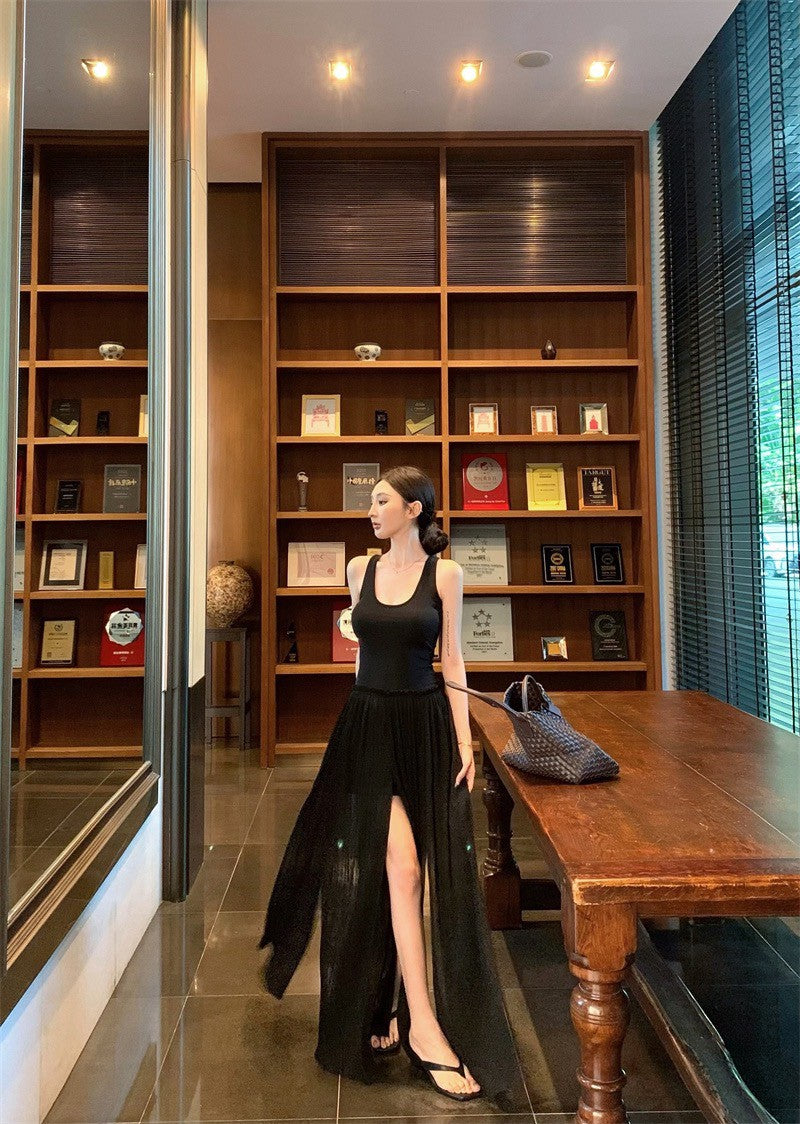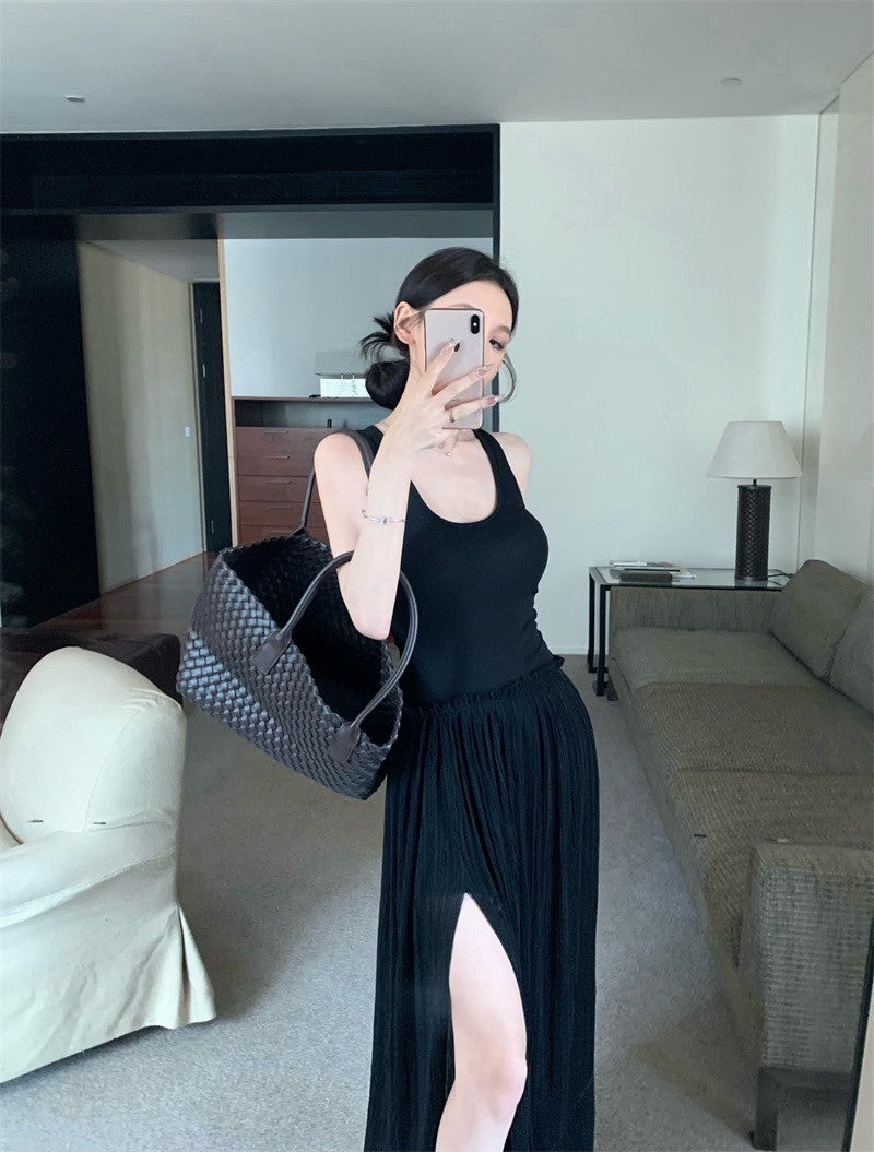 25Jul. 渡假輪廓 修身拼接背心開叉壓褶連身裙 黑