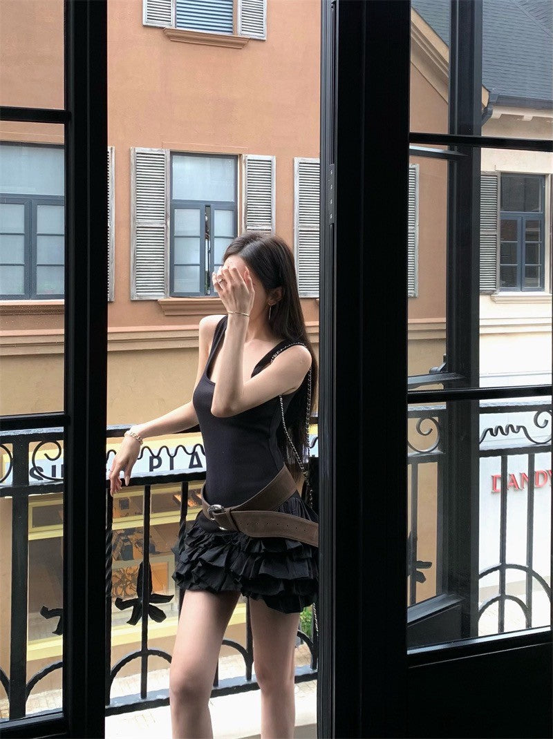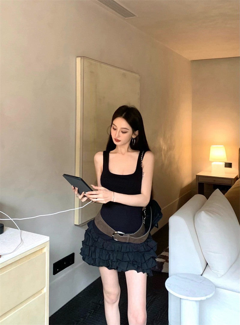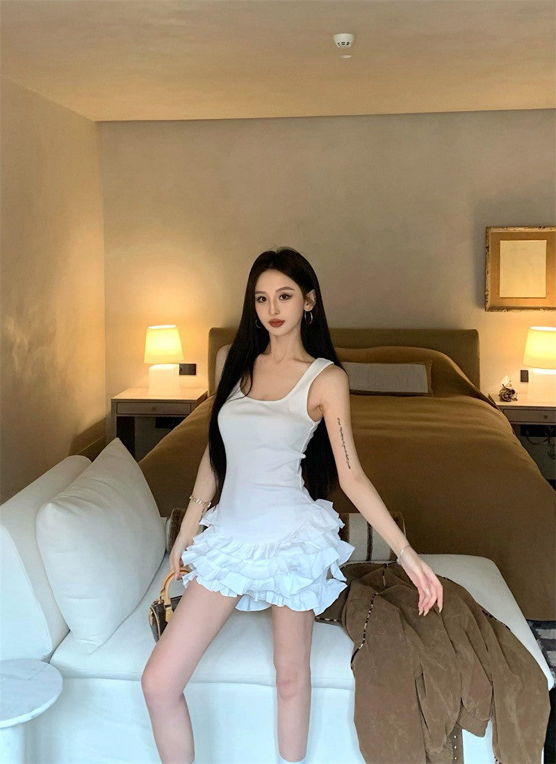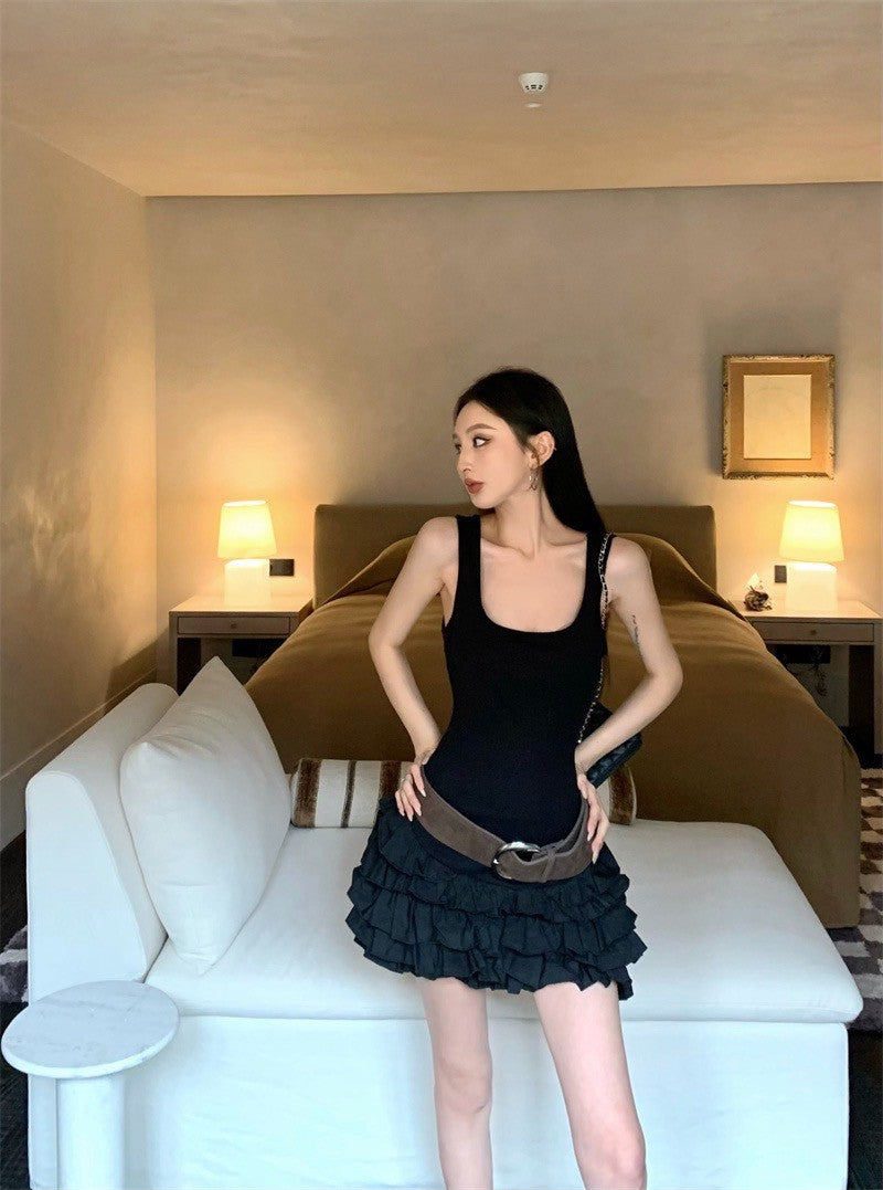 25Jul. 獨寵甜心 U領背心拼接花苞蛋糕裙 白/黑