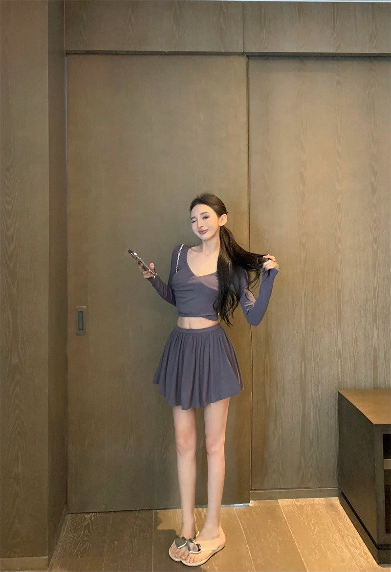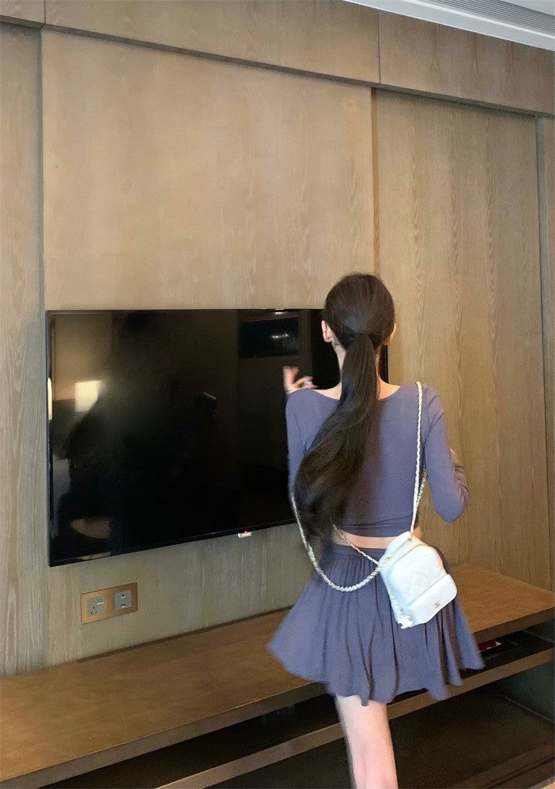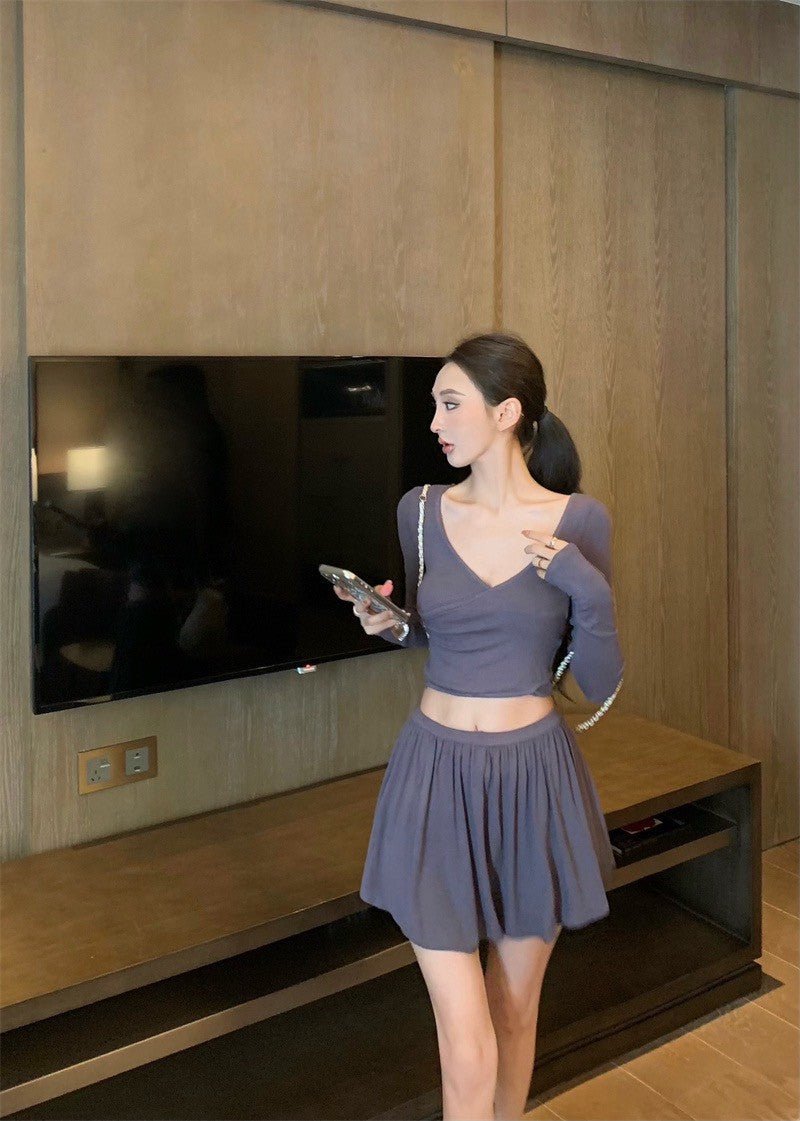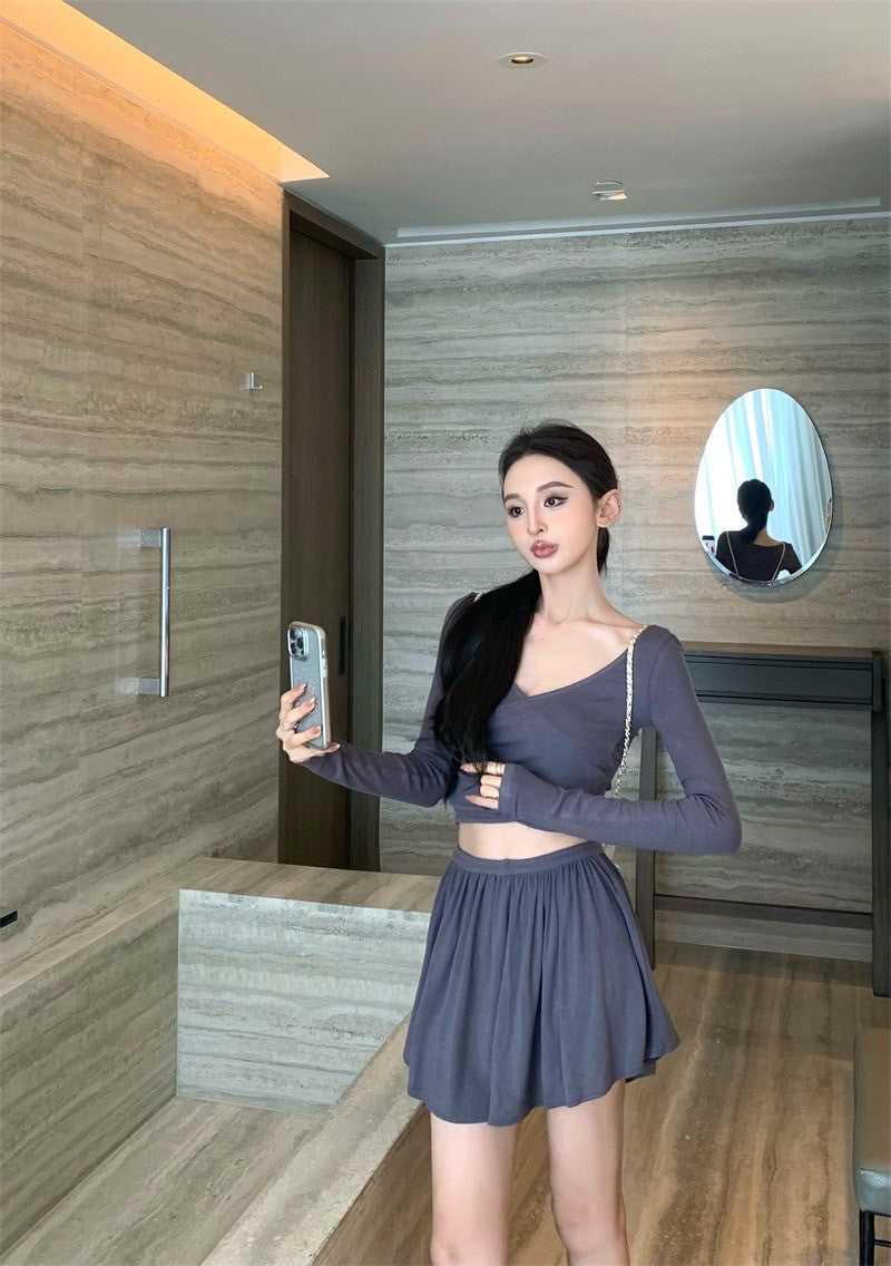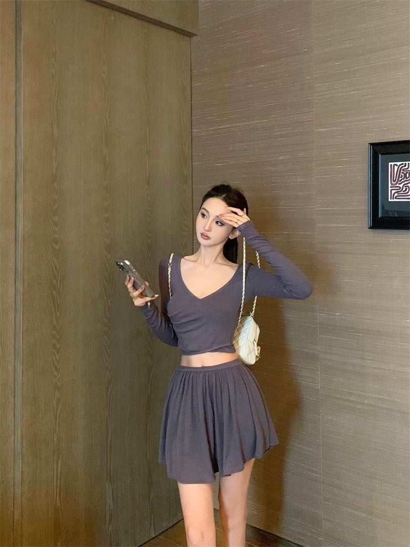 25Jul. 穿出鬆弛感 短款V領上衣 垂垂半身短裙 灰