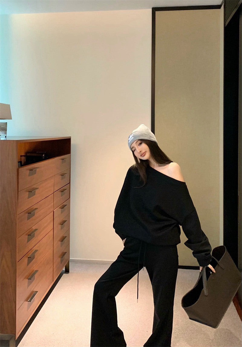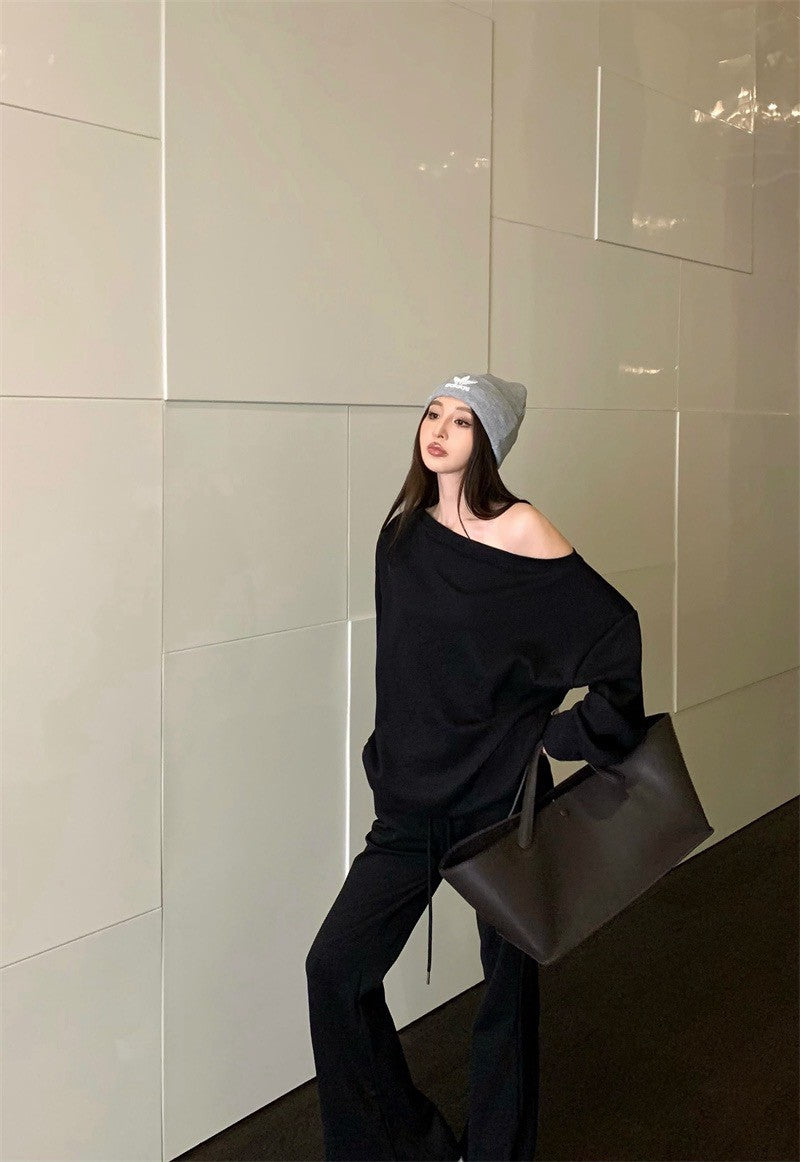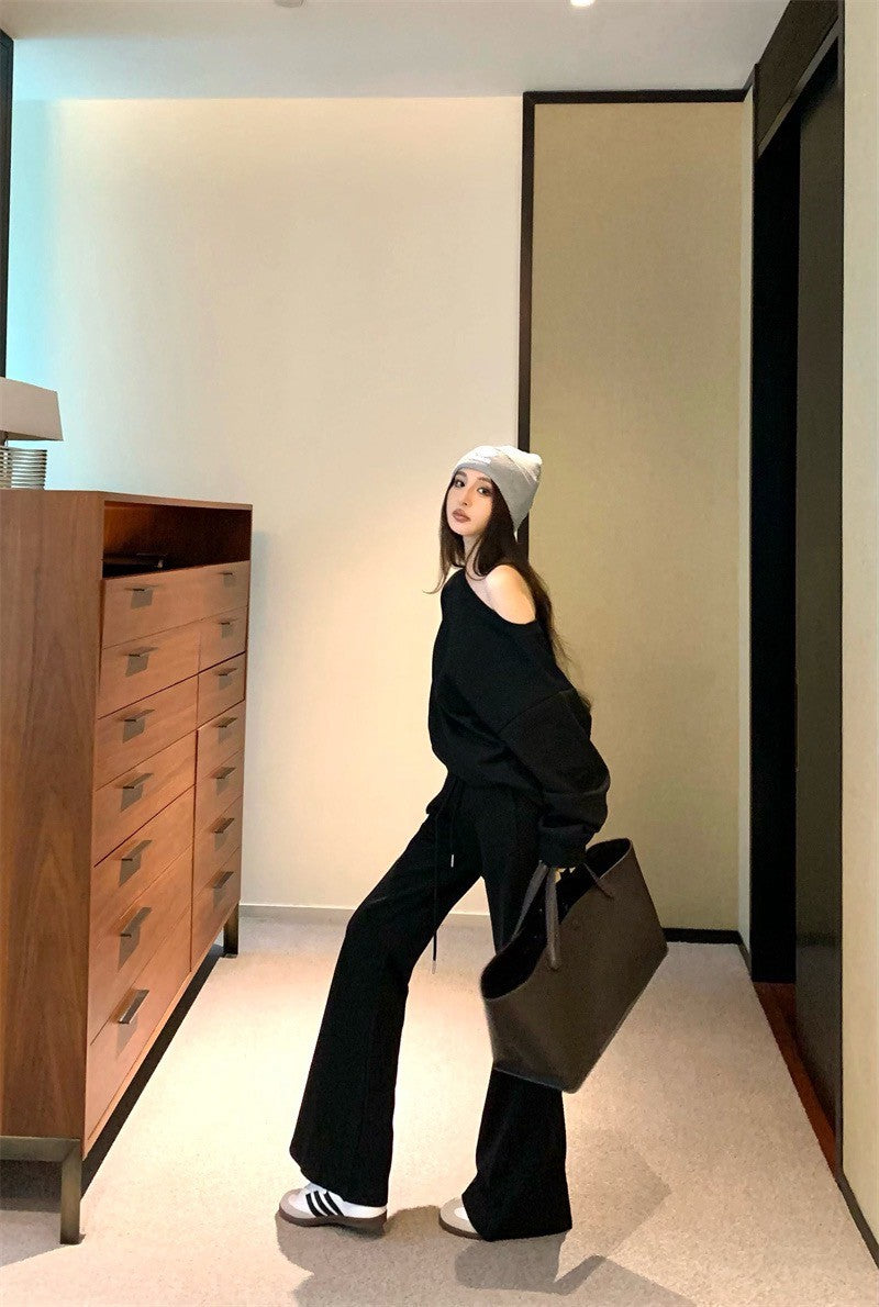 25Jul. 美式時髦穿 休閒純色上衣喇叭褲套裝 黑
