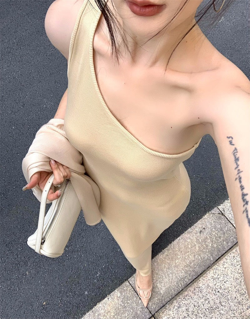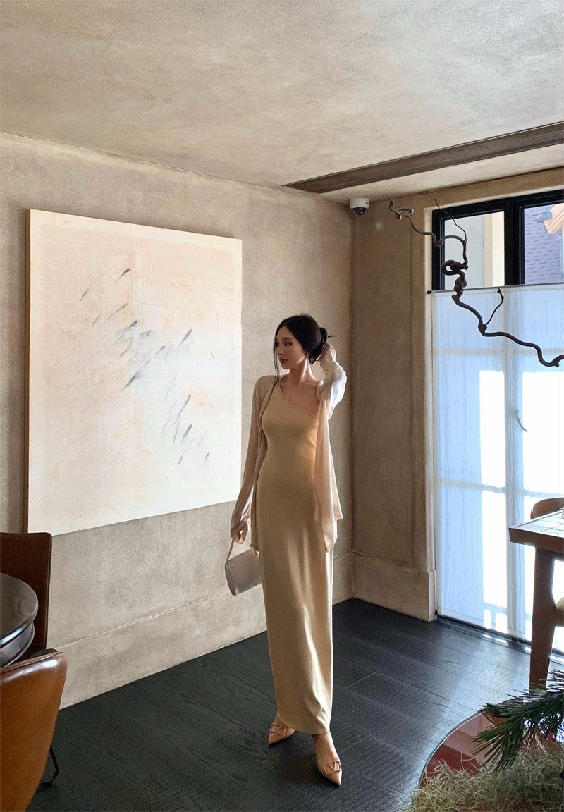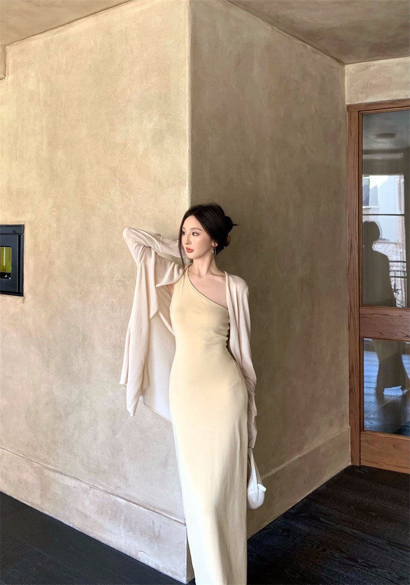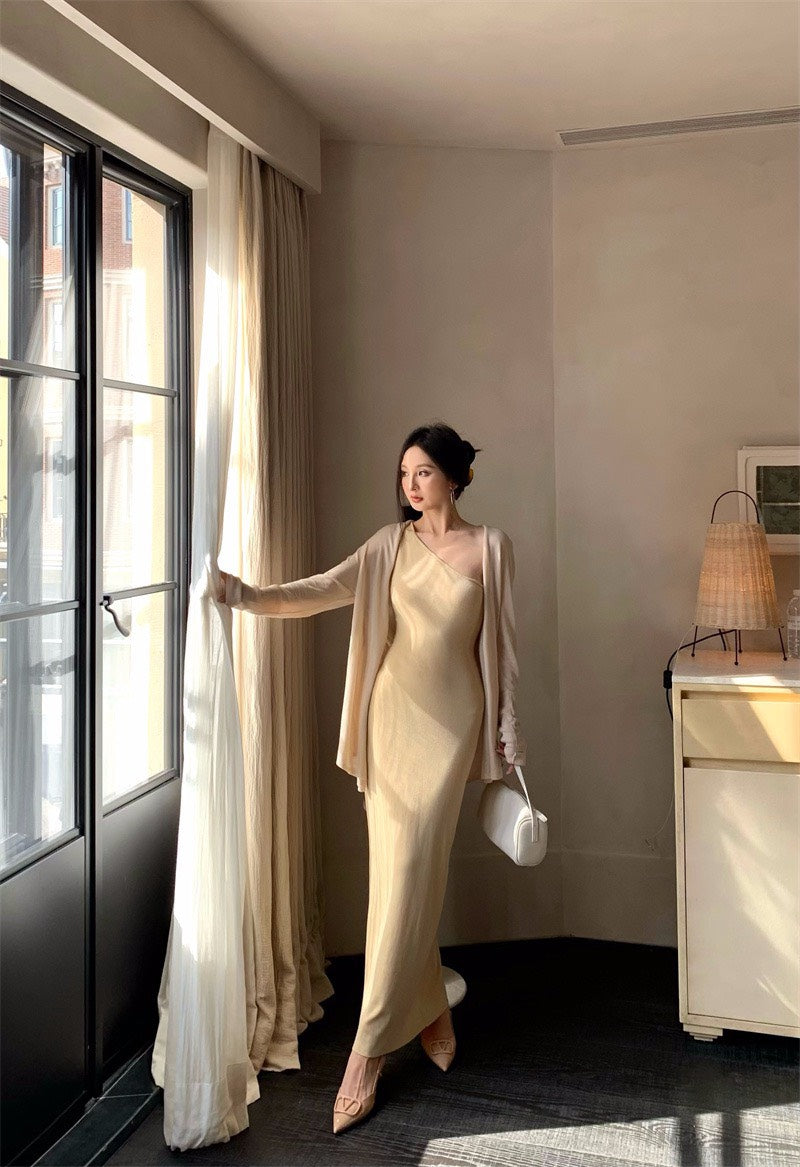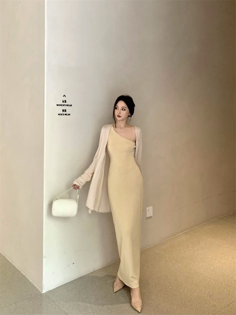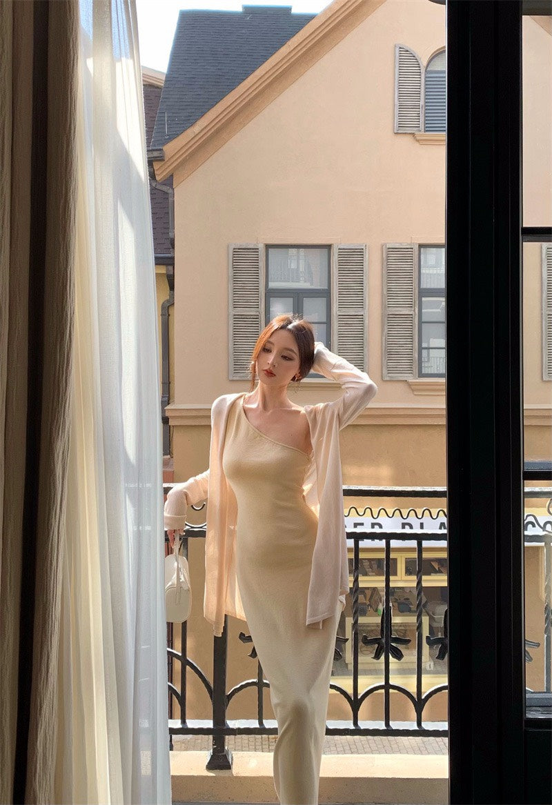 25Nov. 嫩奶黃氣質針織斜領連身裙 防曬開衫
