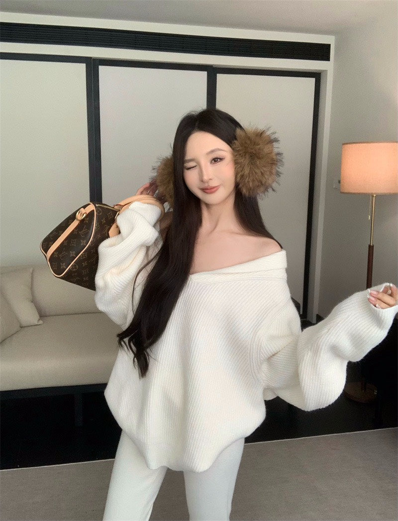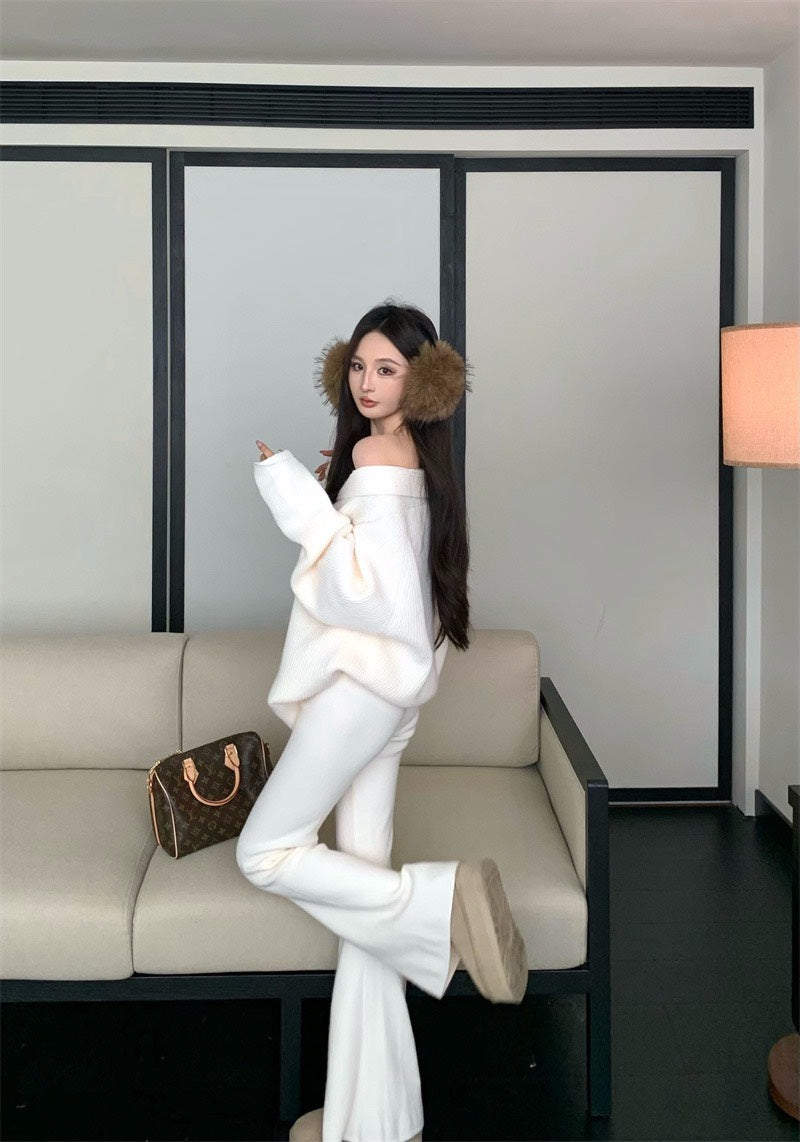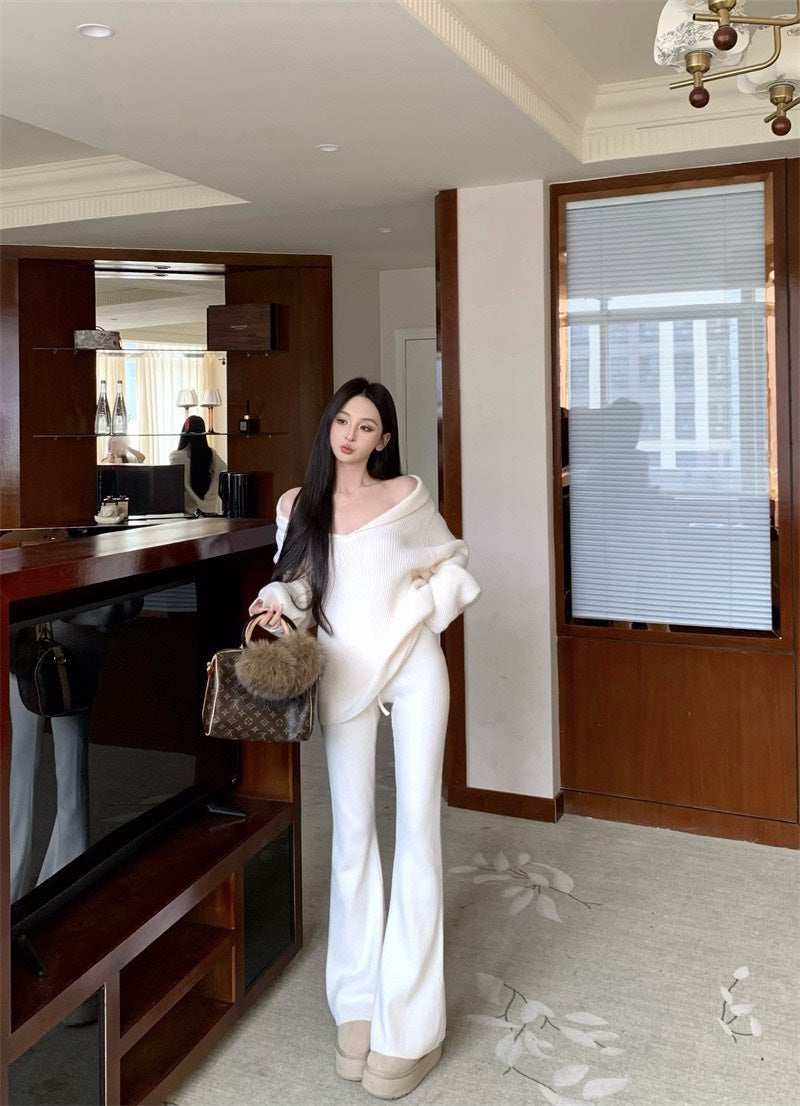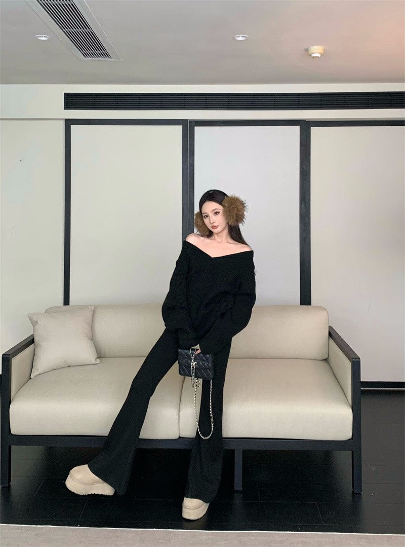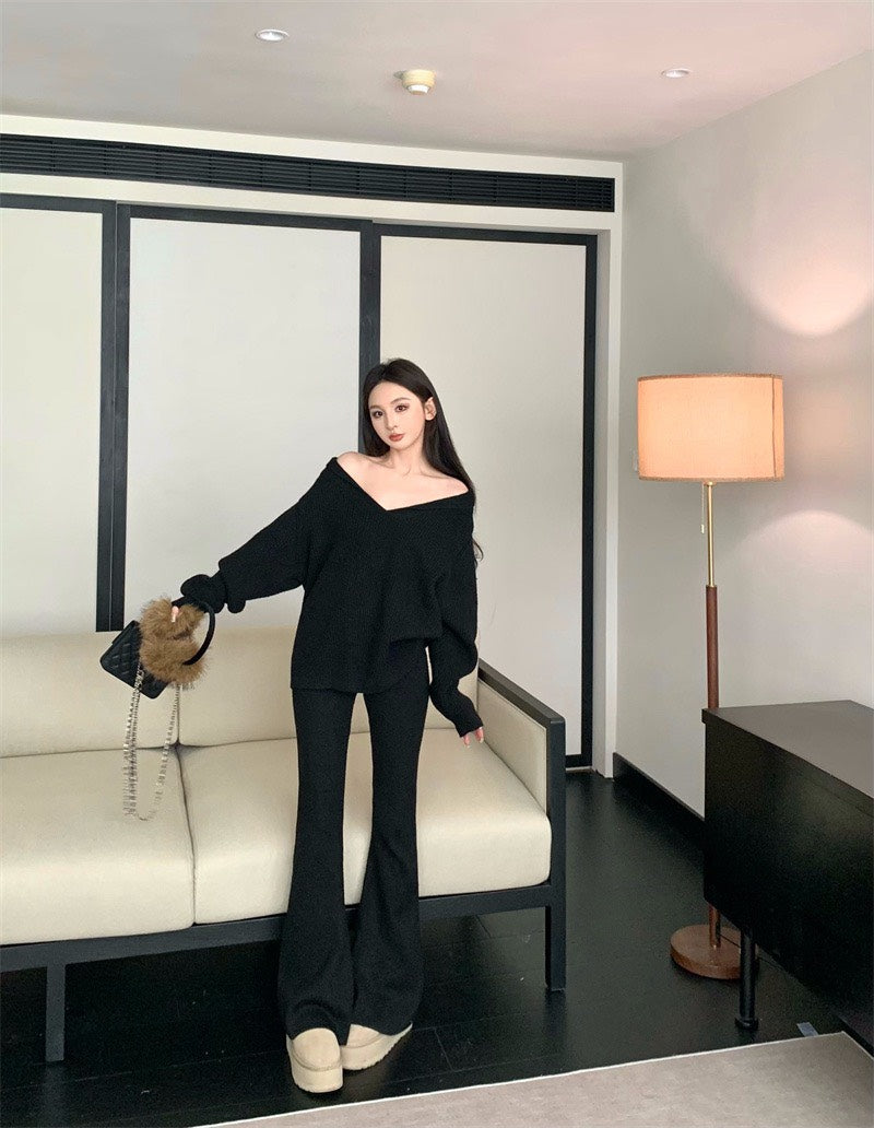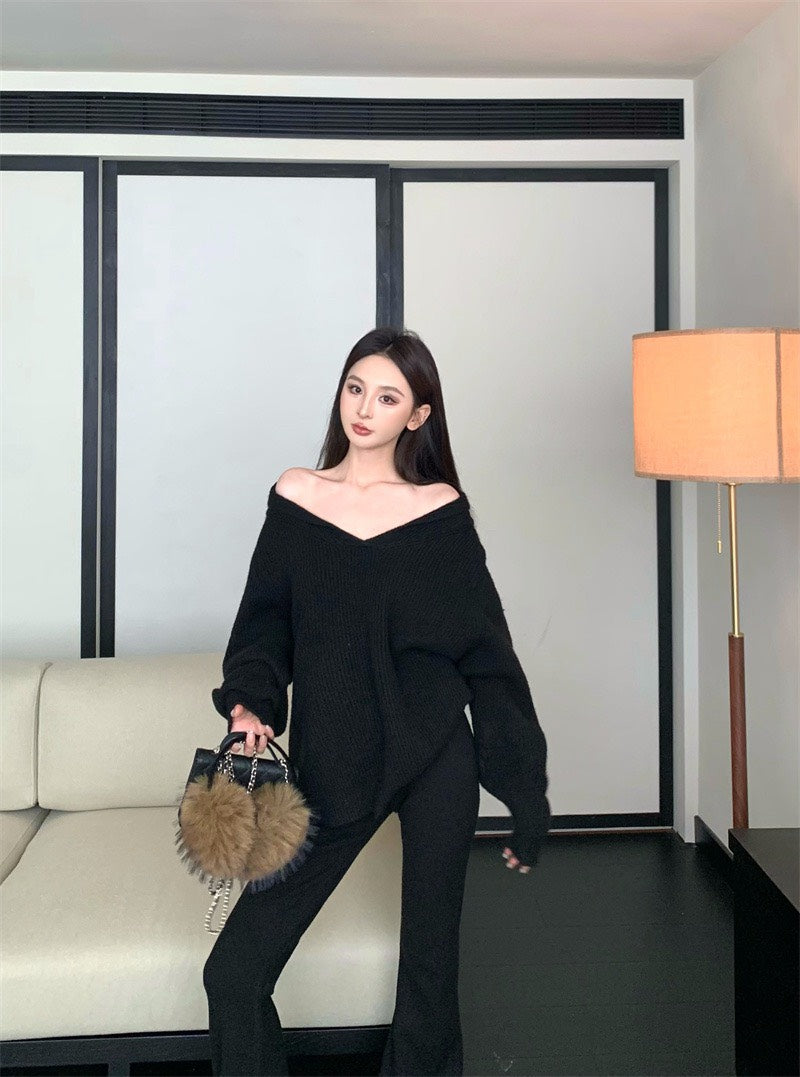25Nov. 慵懶配套V小翻領針織休閒褲套裝 白/黑
