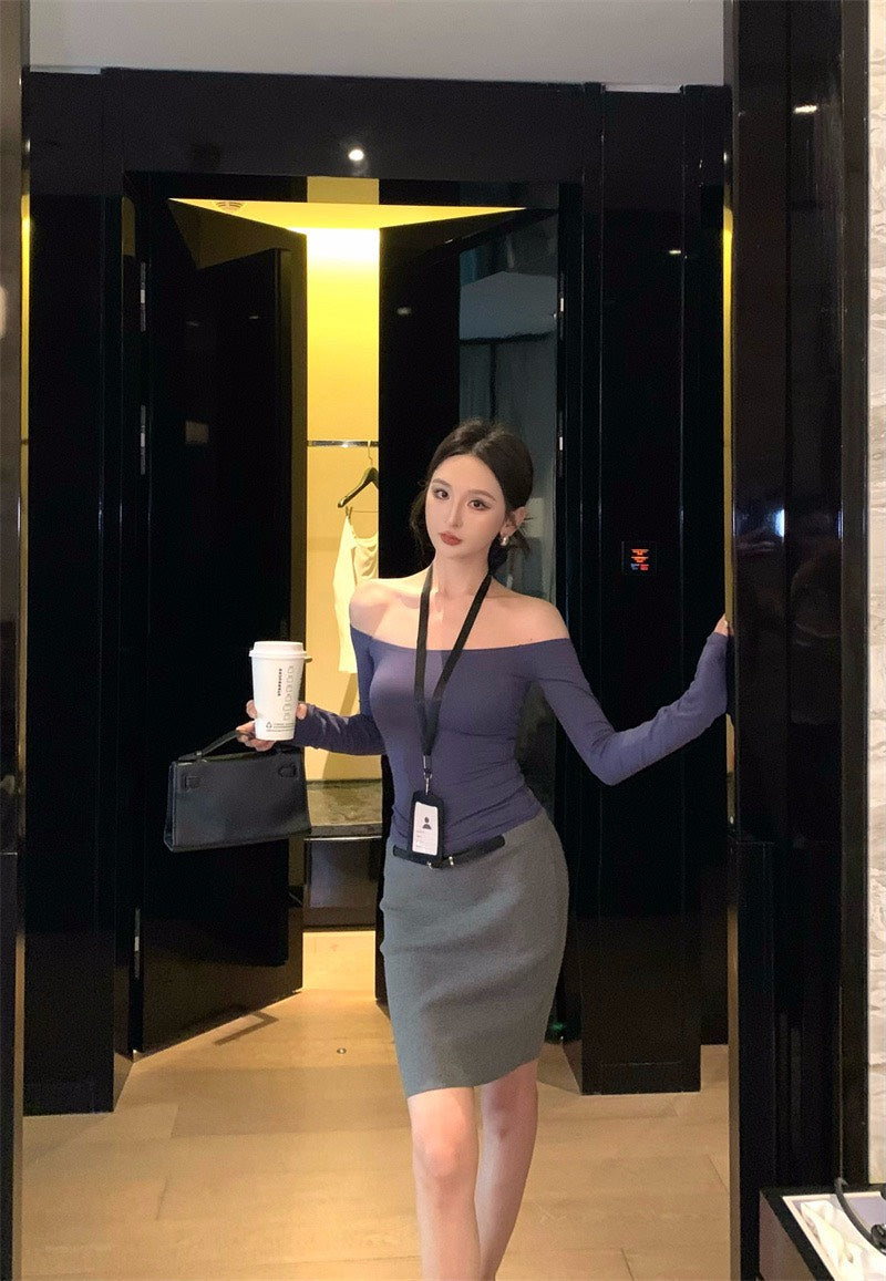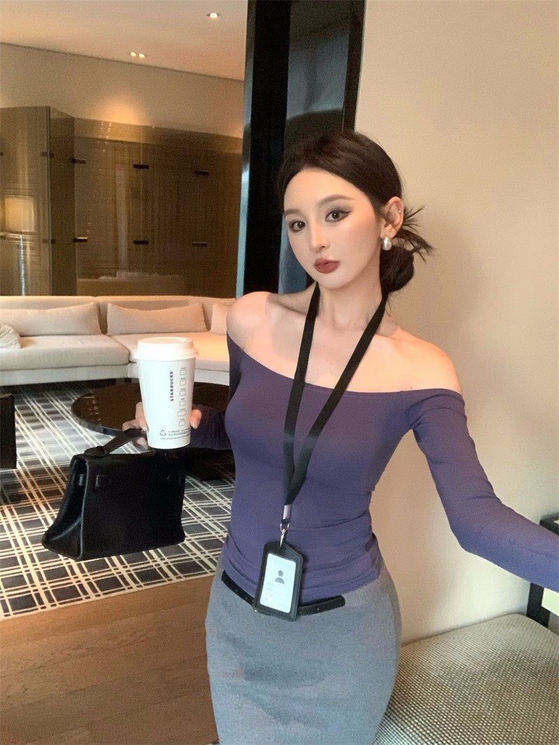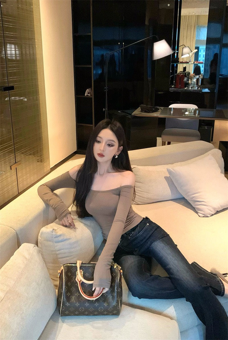 25Nov. 魅惑肩線一字領彈力長袖上衣 寶藍/卡其