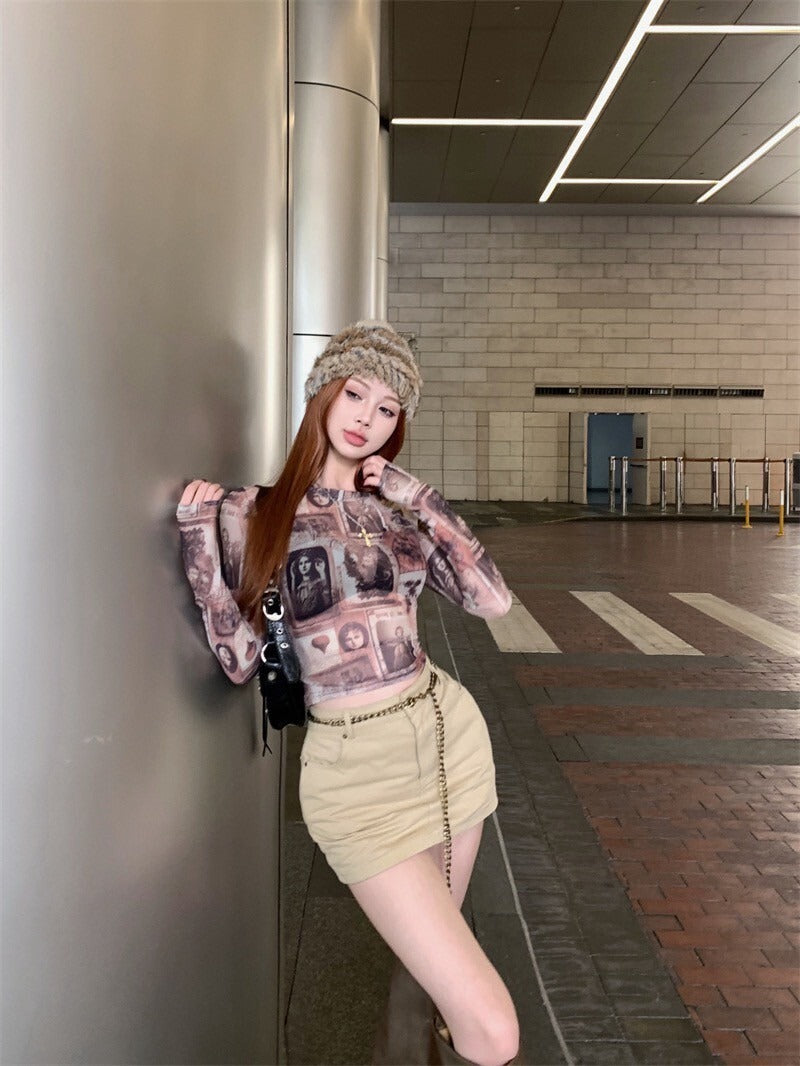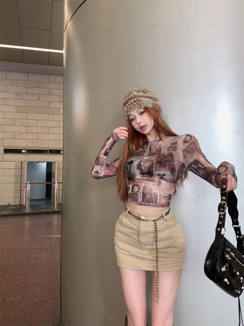 25Oct. 古巴辣妹 復古透紗印花打底上衣/卡其半身裙