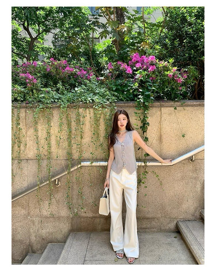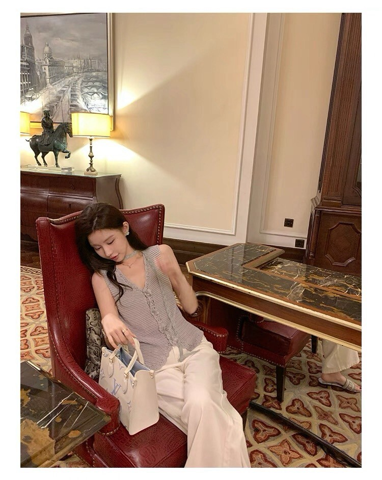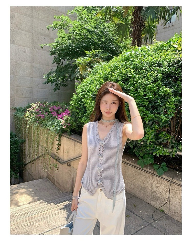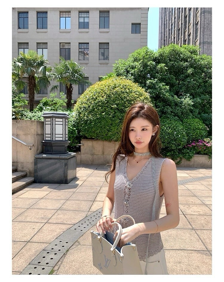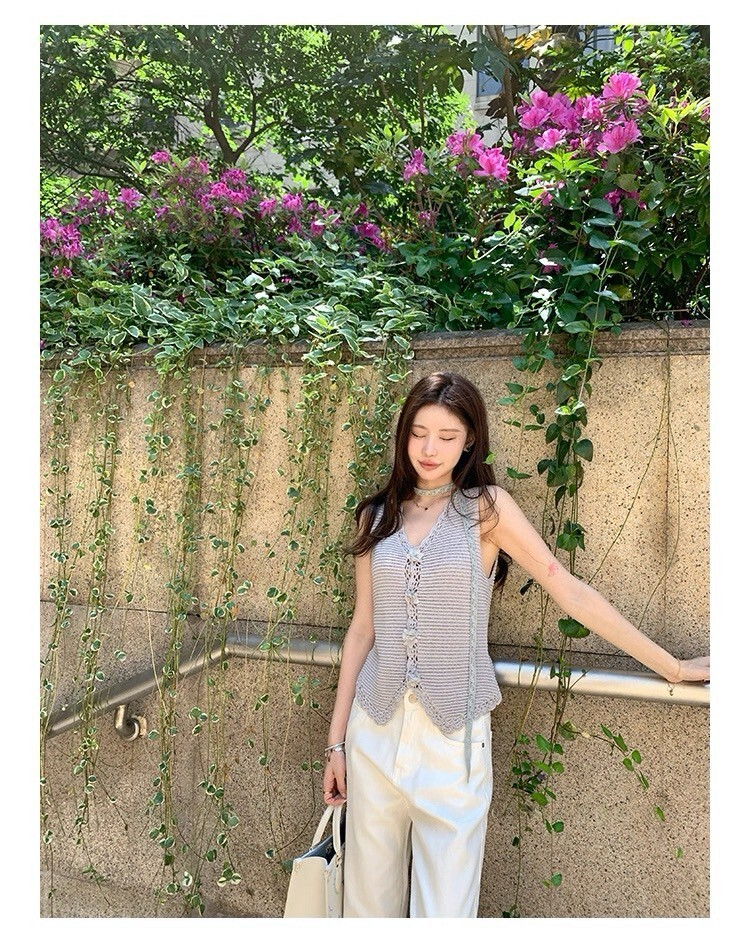 25Oct. 回頭率密碼韓系薄款針織飄帶背心 灰