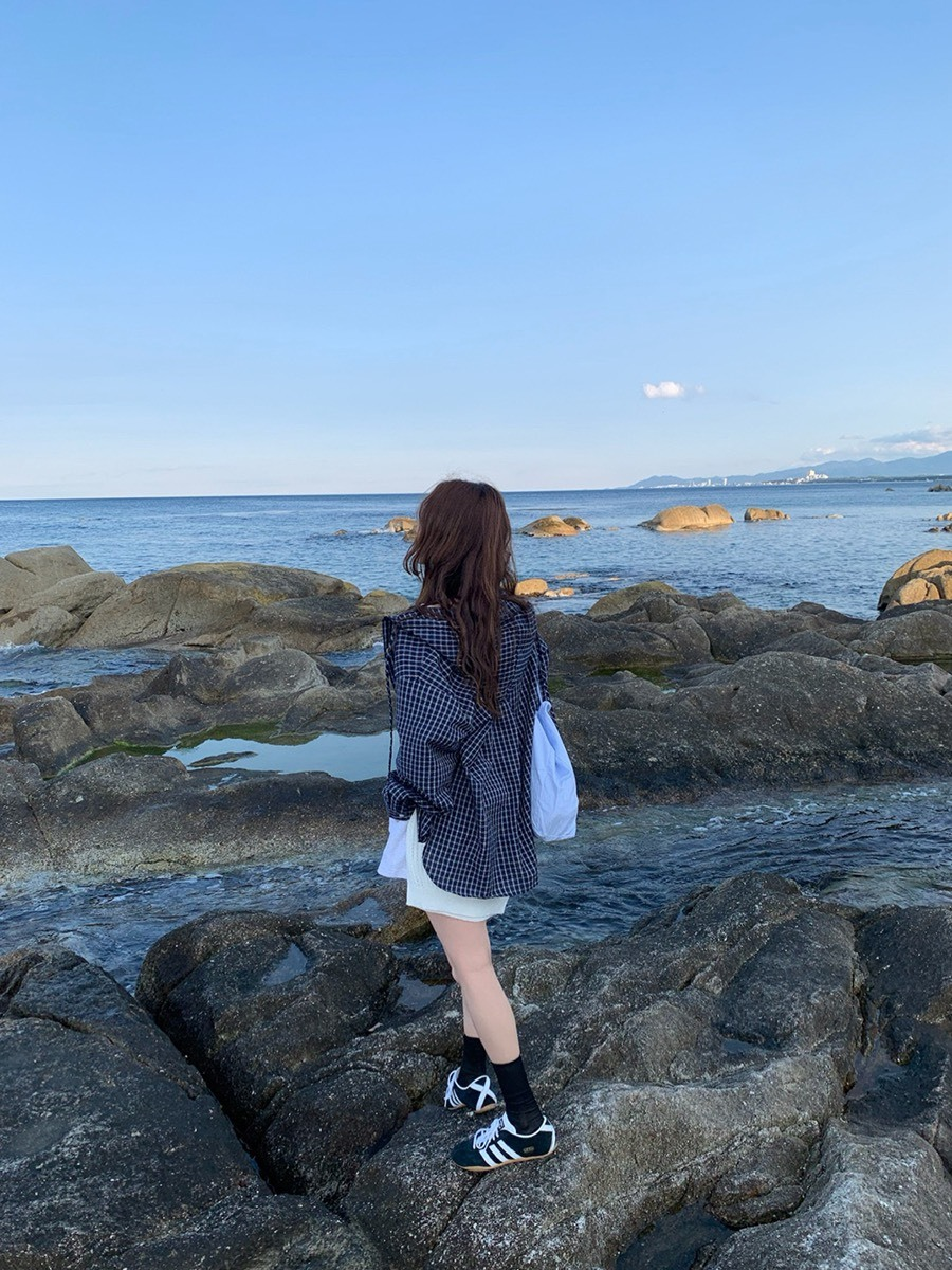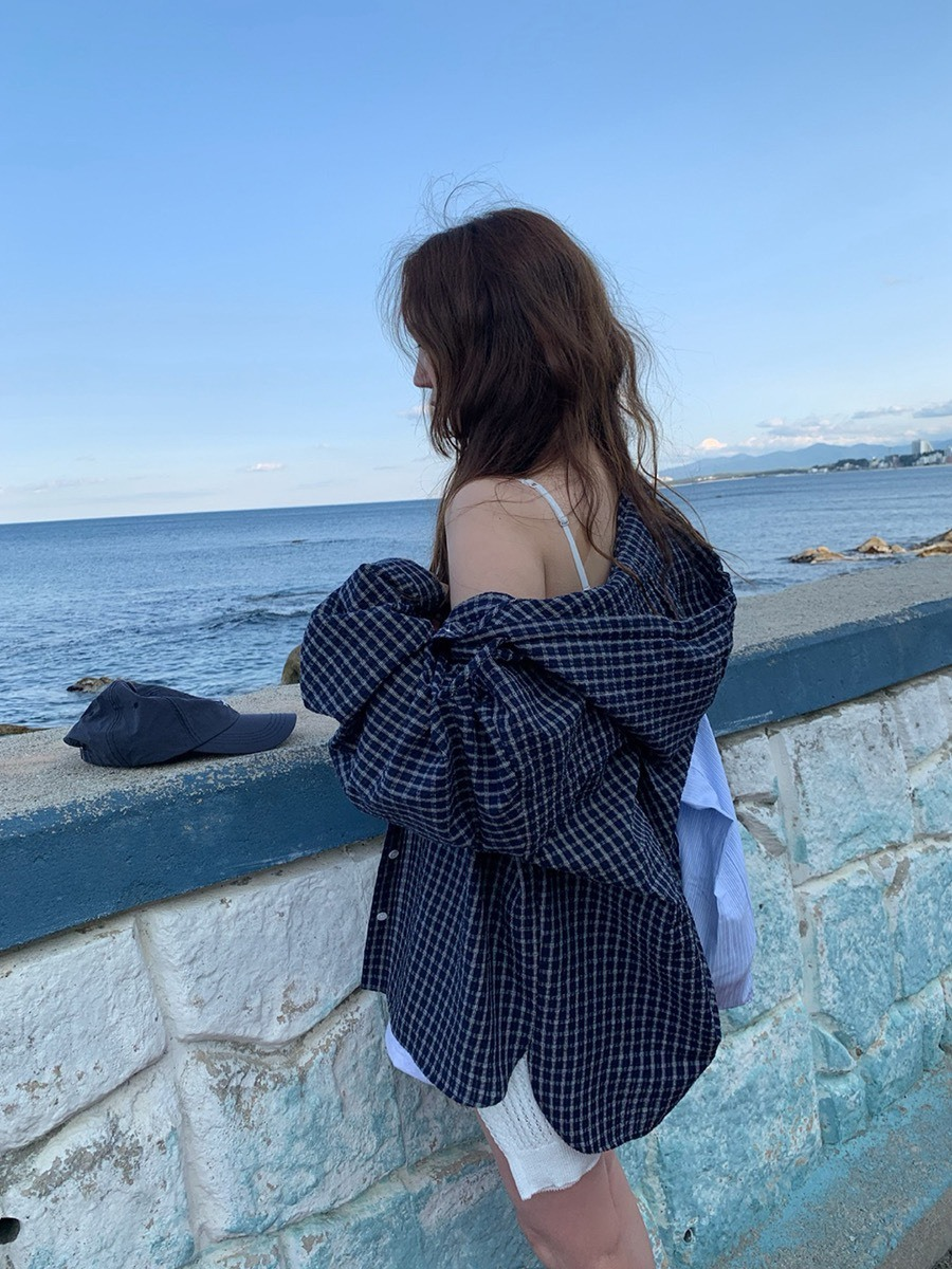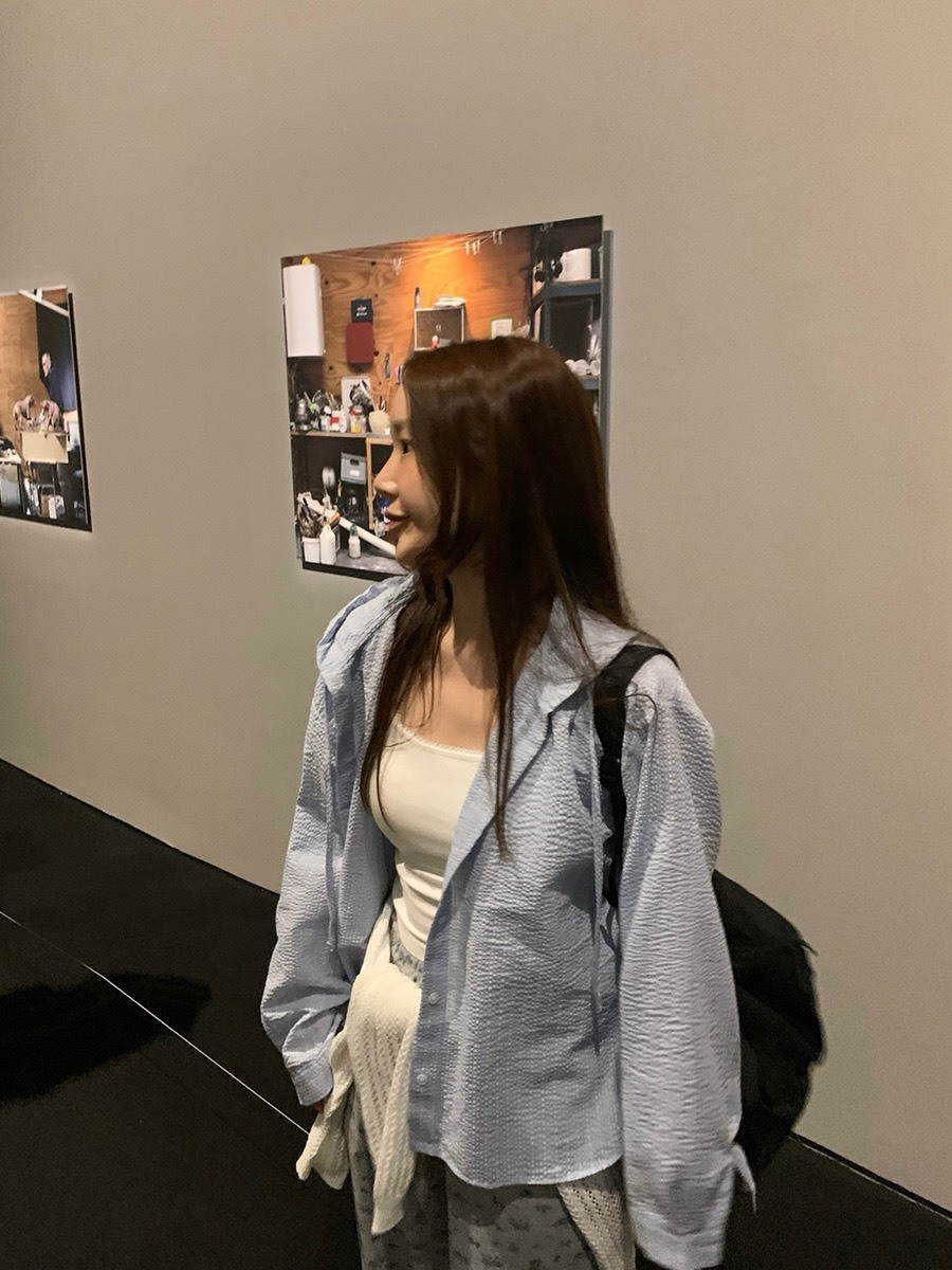 25Oct. 復古韓妞 撞色格紋連帽襯衫外套 淺藍/深藍