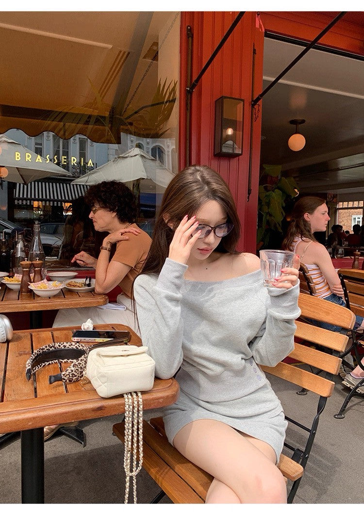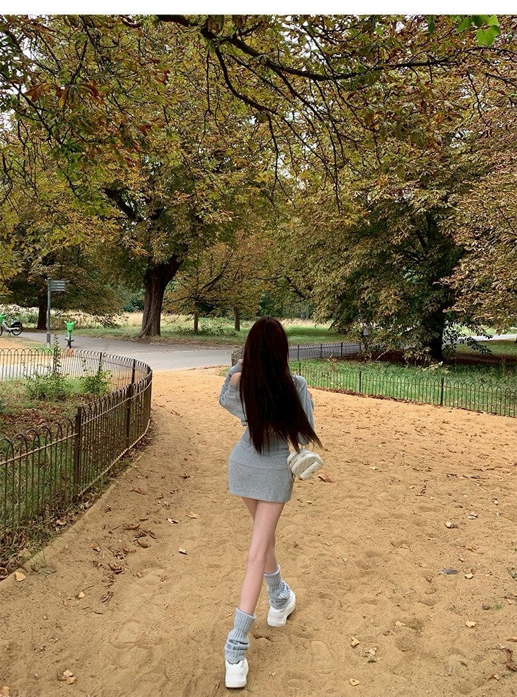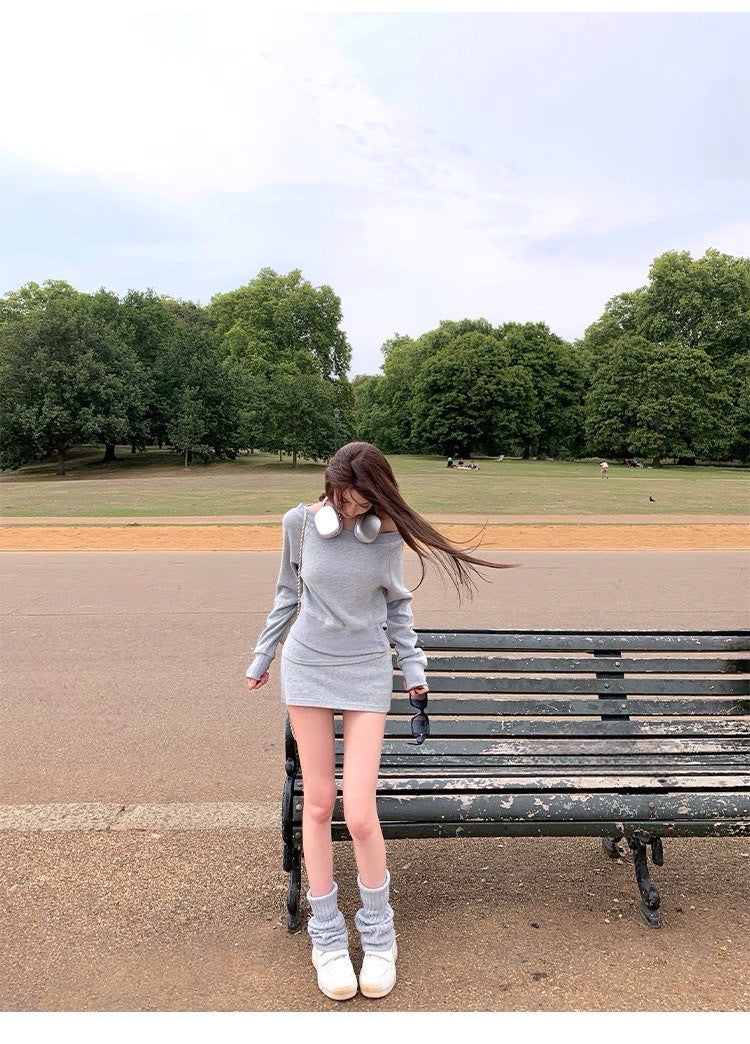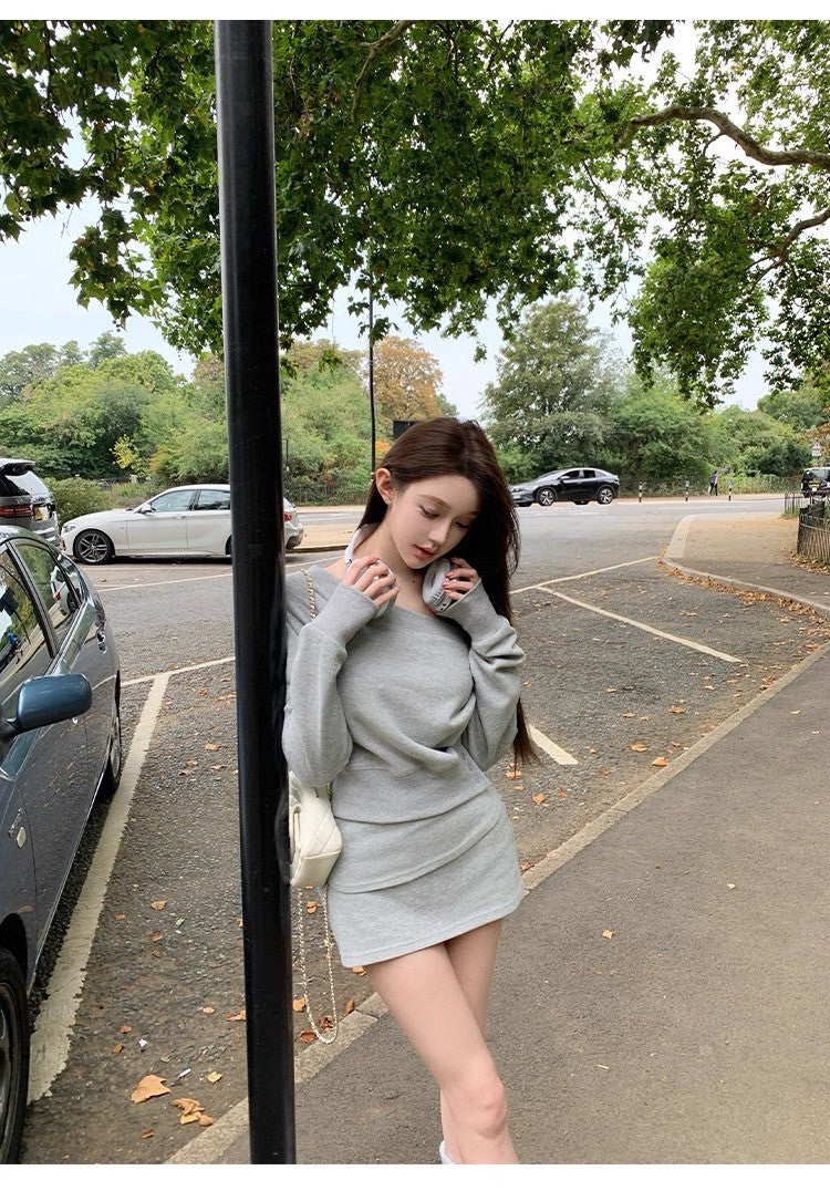 25Oct. 海德度假風 慵懶斜肩設計感半身裙套裝 灰