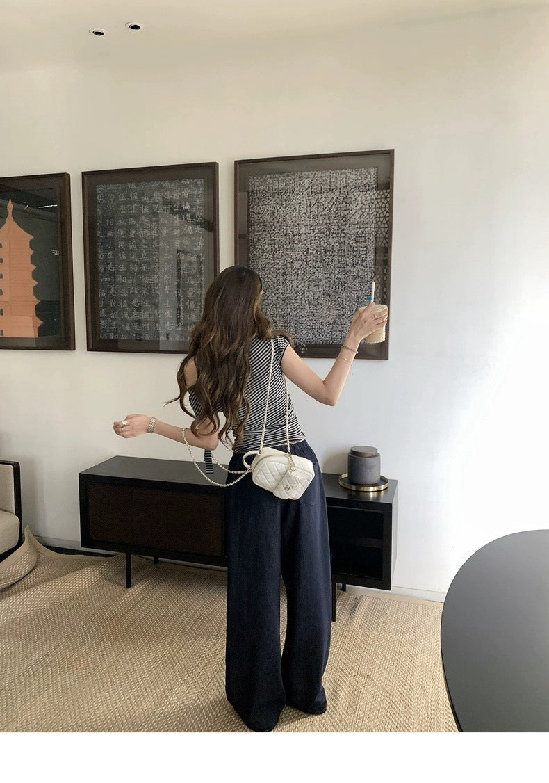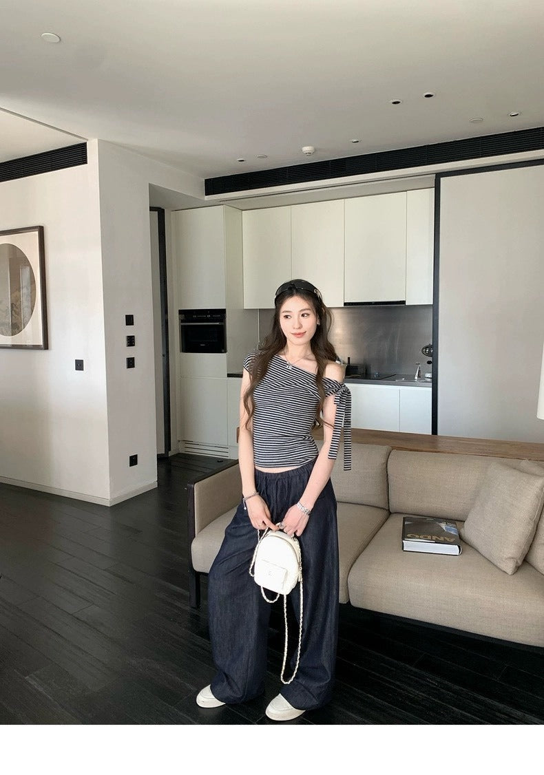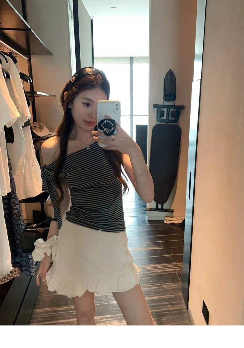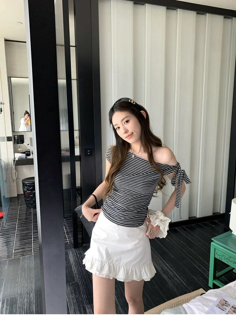 25Oct. 漢南洞時髦歐膩氣質斜肩綁帶上衣 條紋