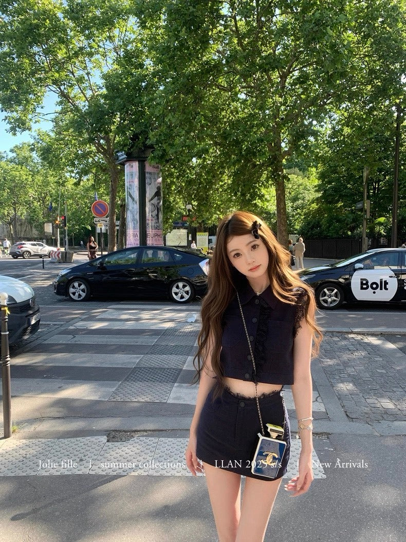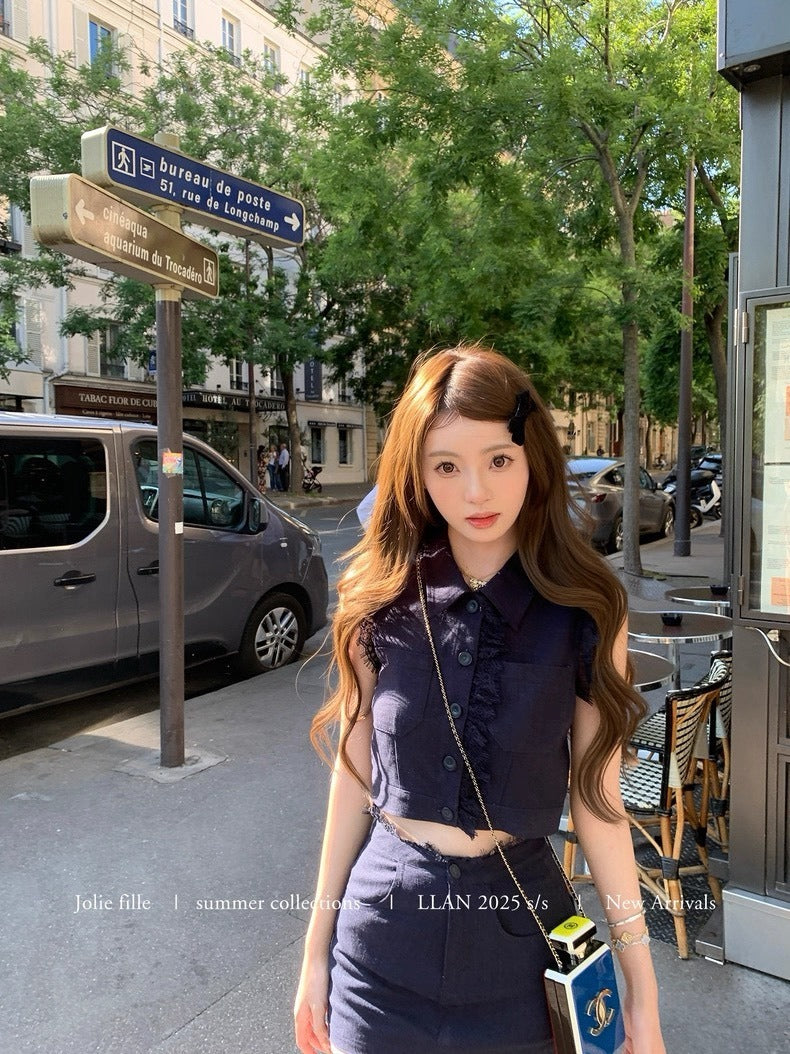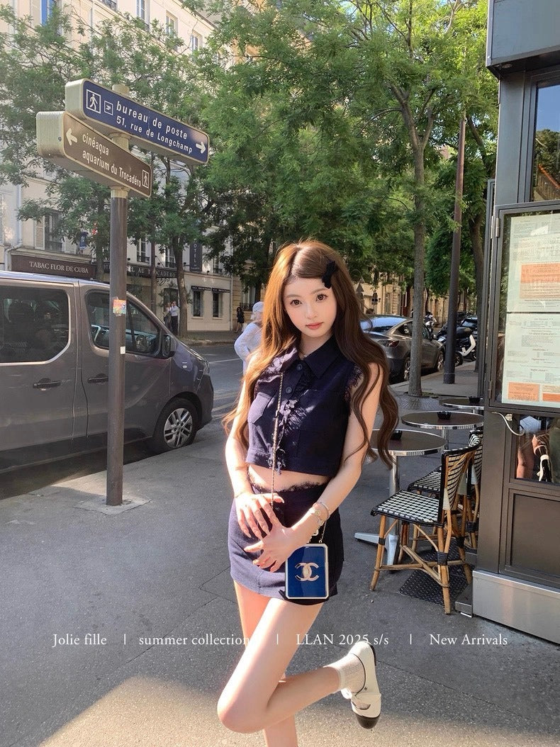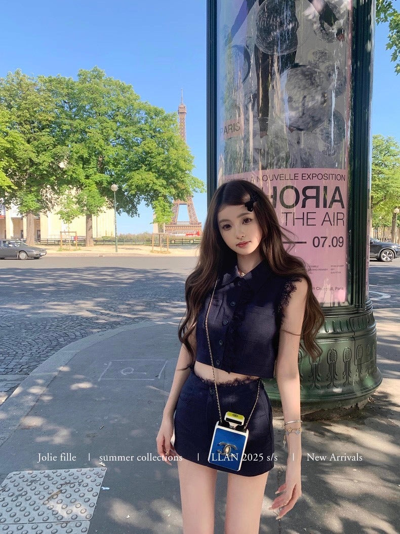 25Oct. 甜心香香VTG 復古蕾絲拼接亞麻套裝 藏藍