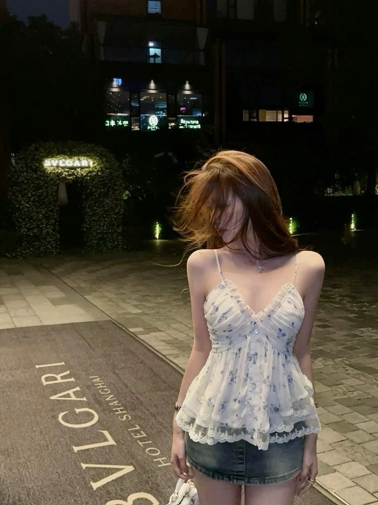 25Oct. 純慾碎花蕾絲 V領褶皺雪紡背心