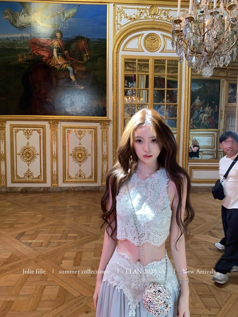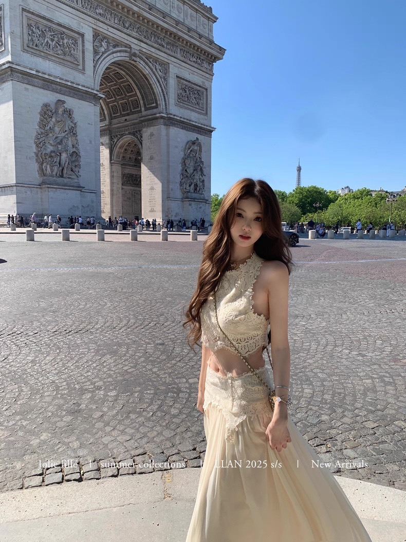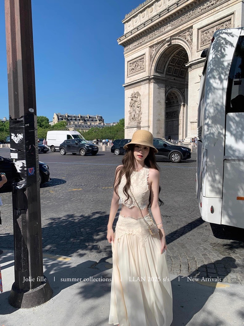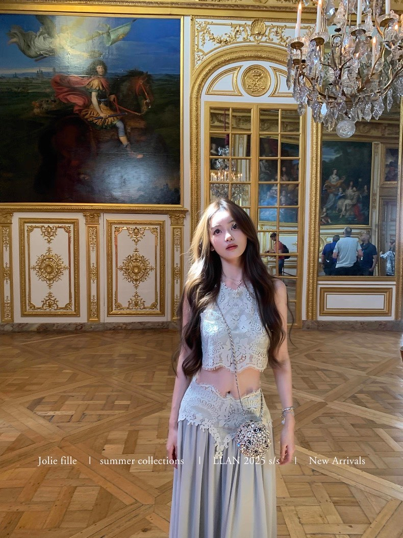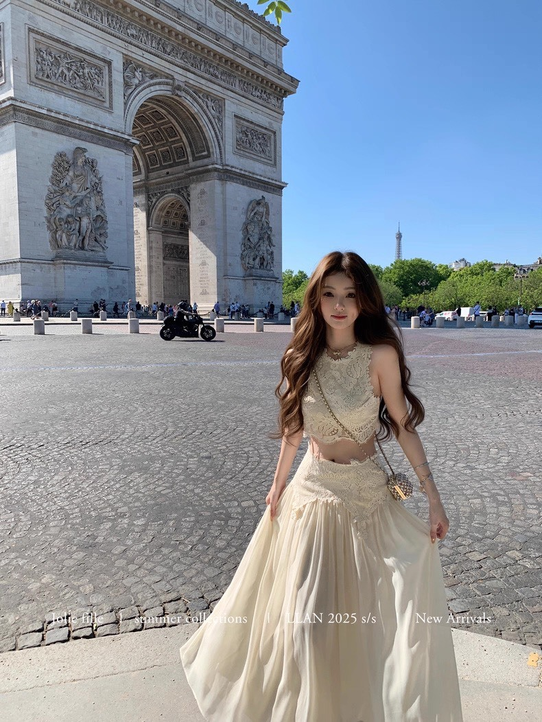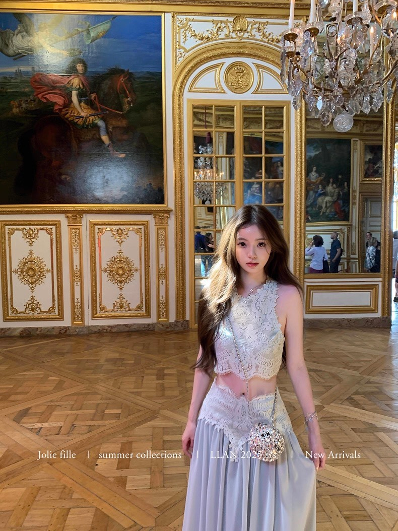 25Oct. 羅浮宮博物 夢幻甜美雕花背心半身裙套裝 梔子色/水藍