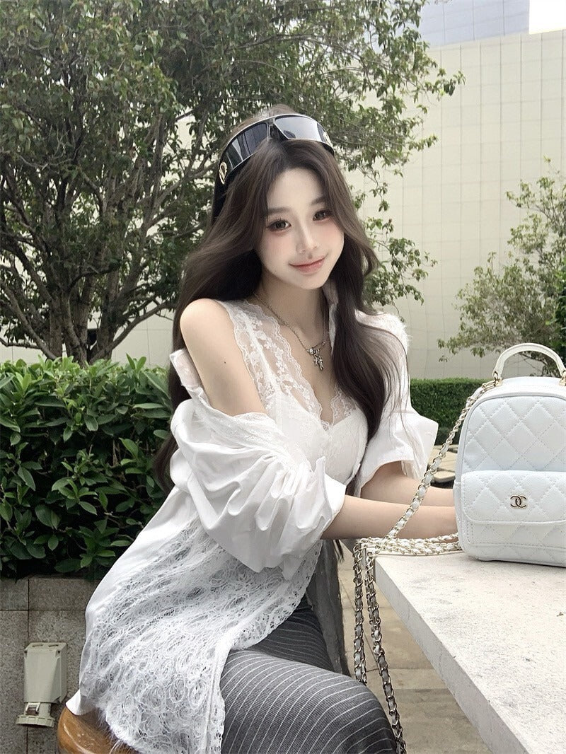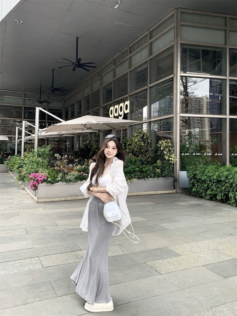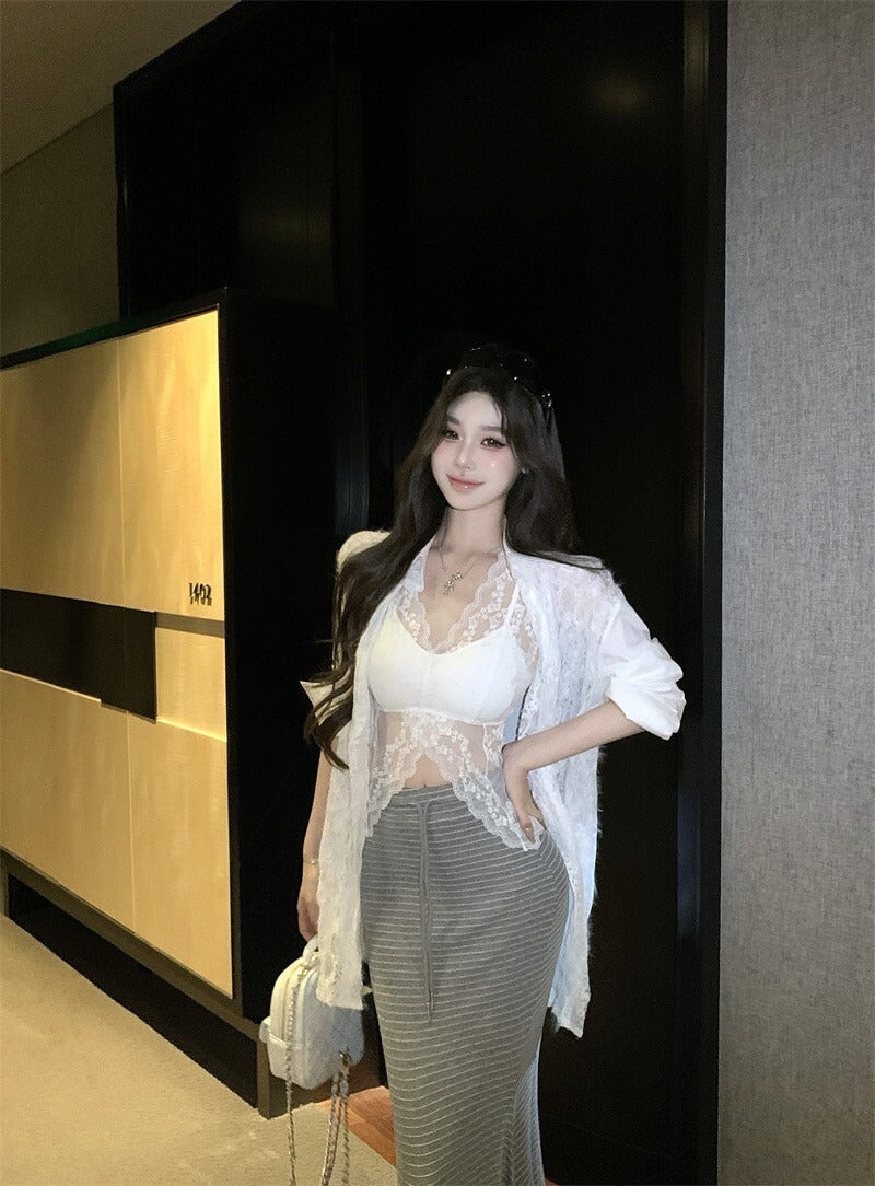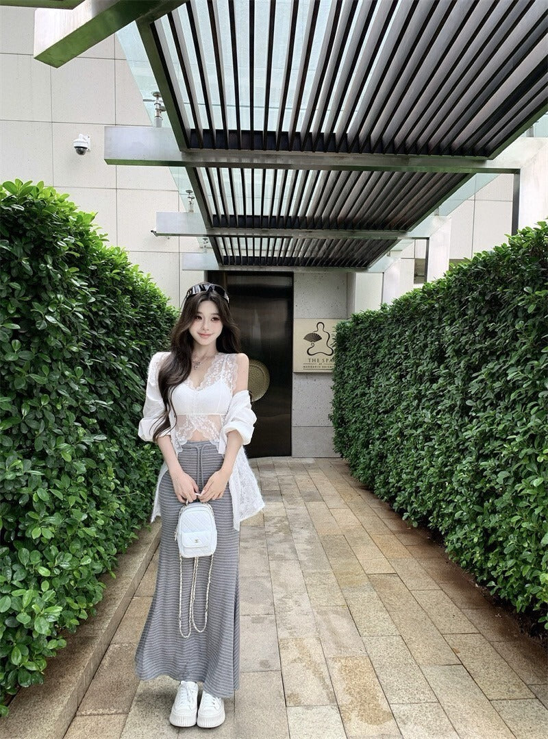 25Oct. 通勤首領 微透蕾絲拼接襯衫/條紋抽繩半身裙