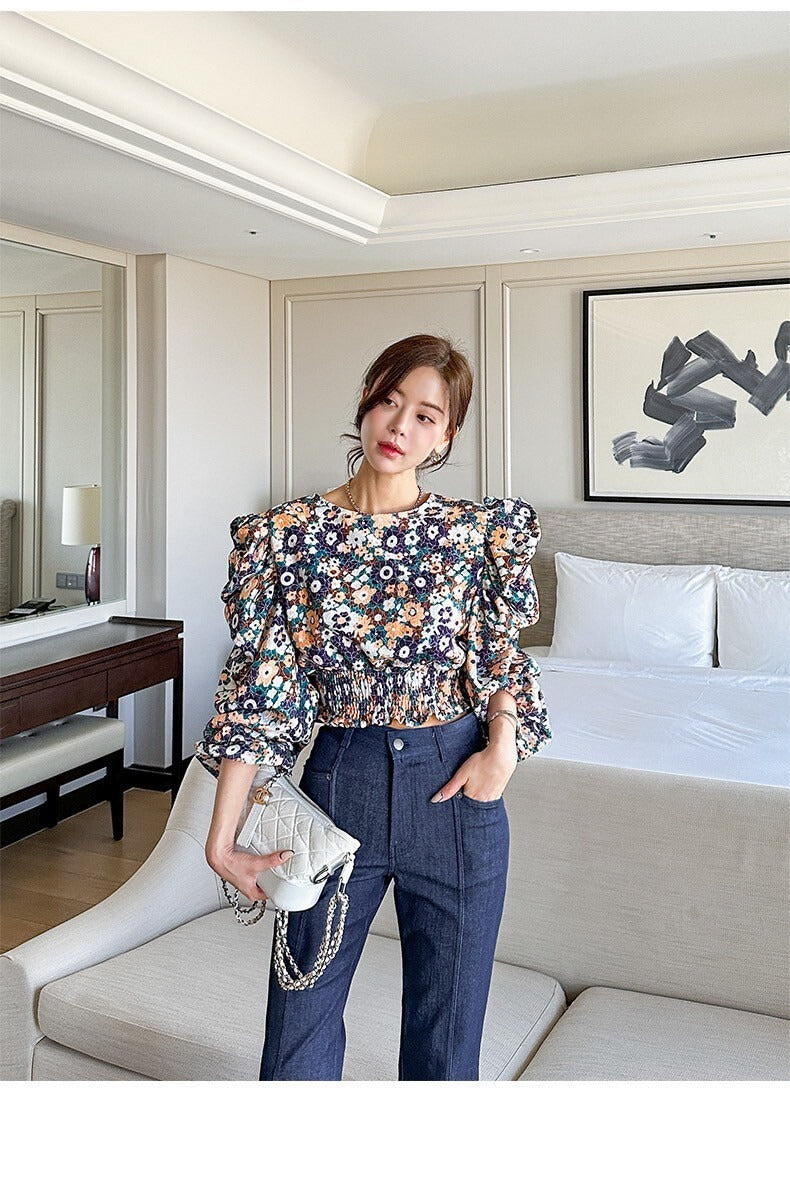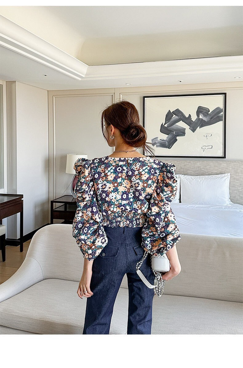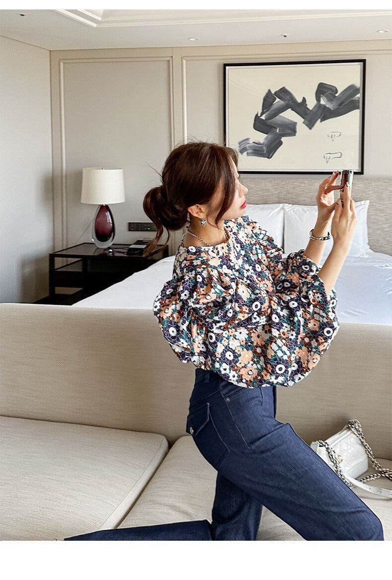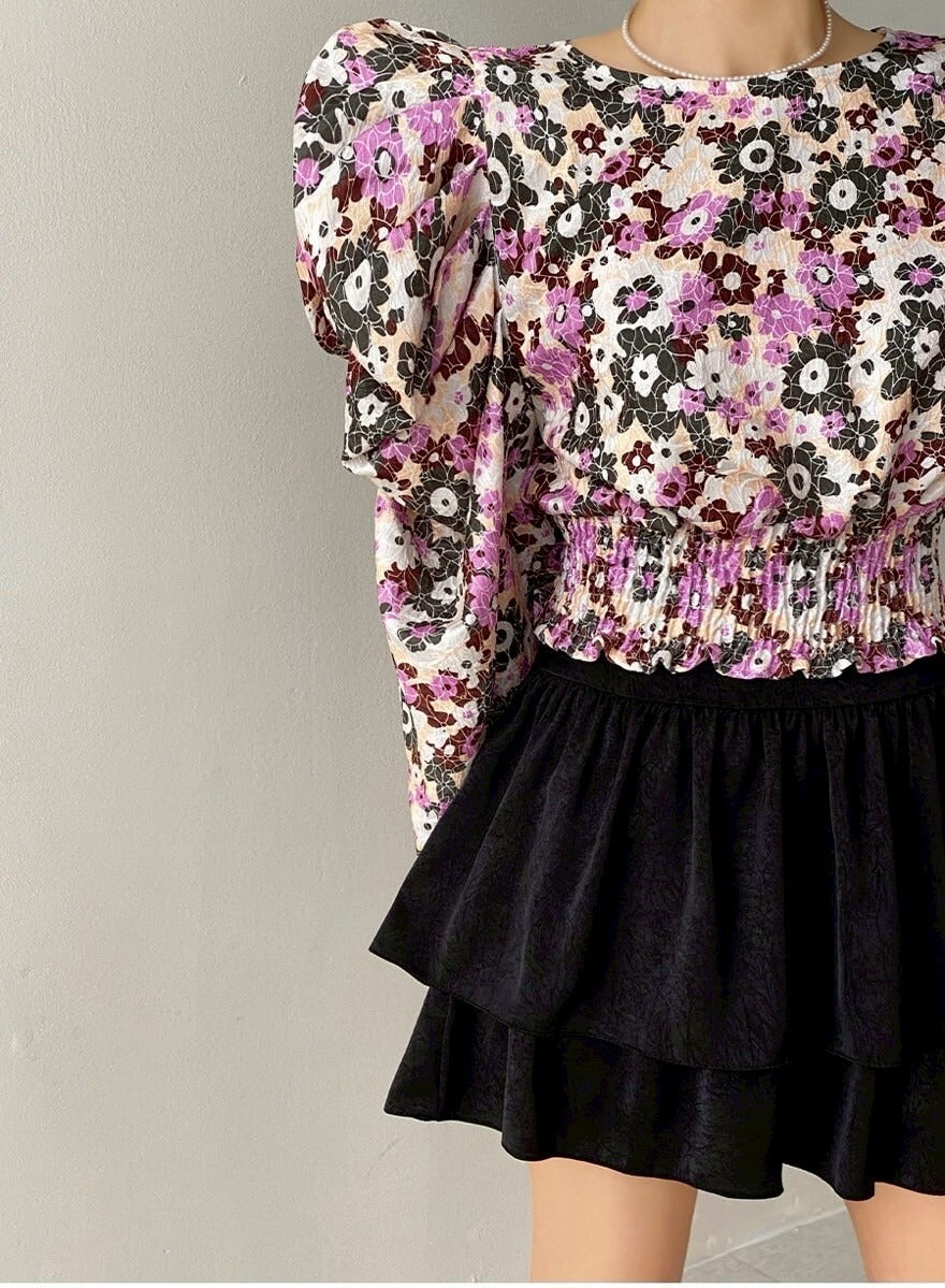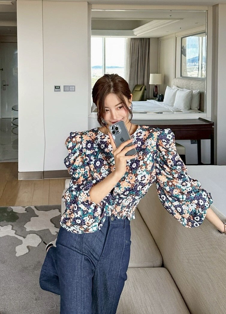 25Sep. 夢迴碎花 堆堆袖收腰長袖上衣 粉/菊藍