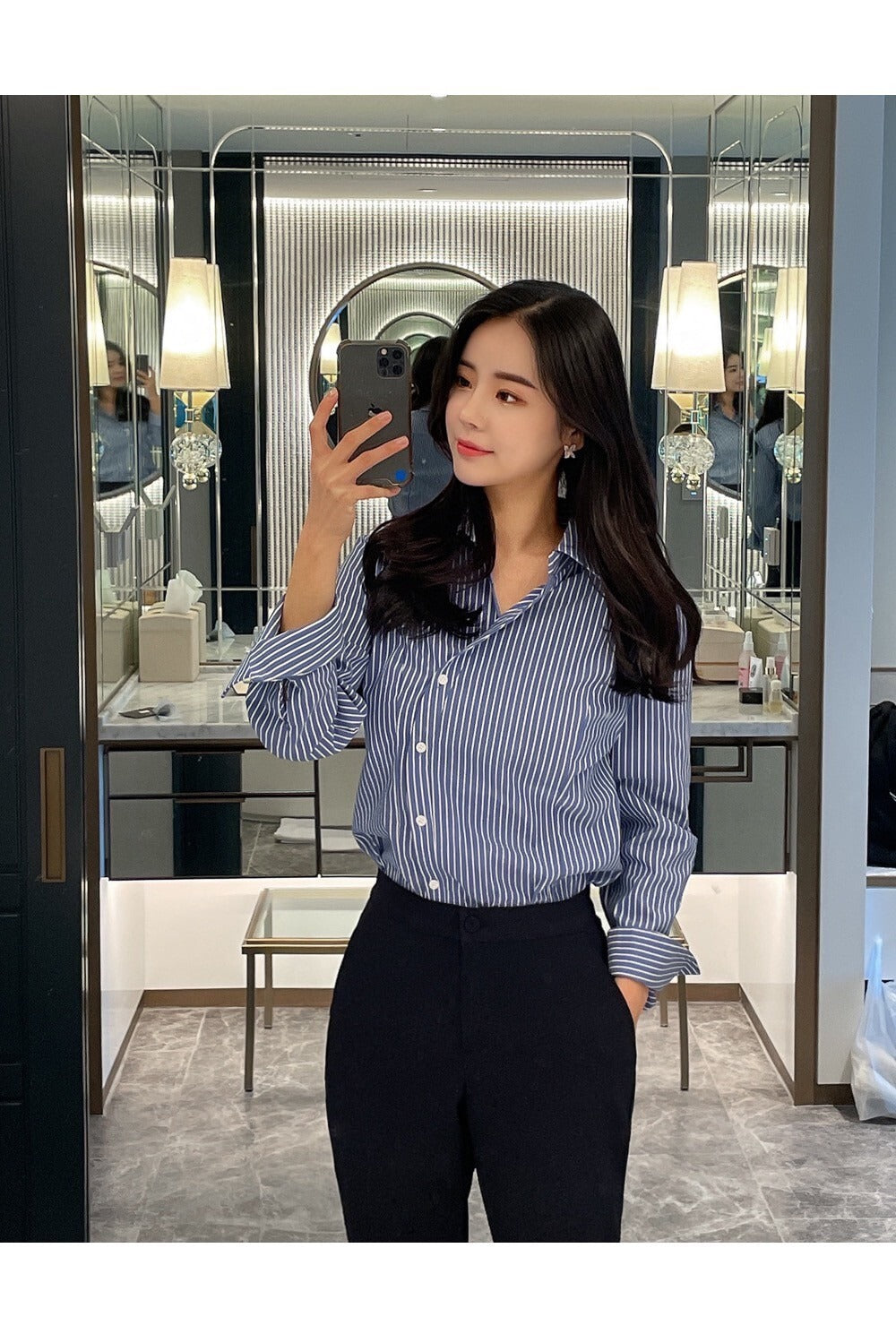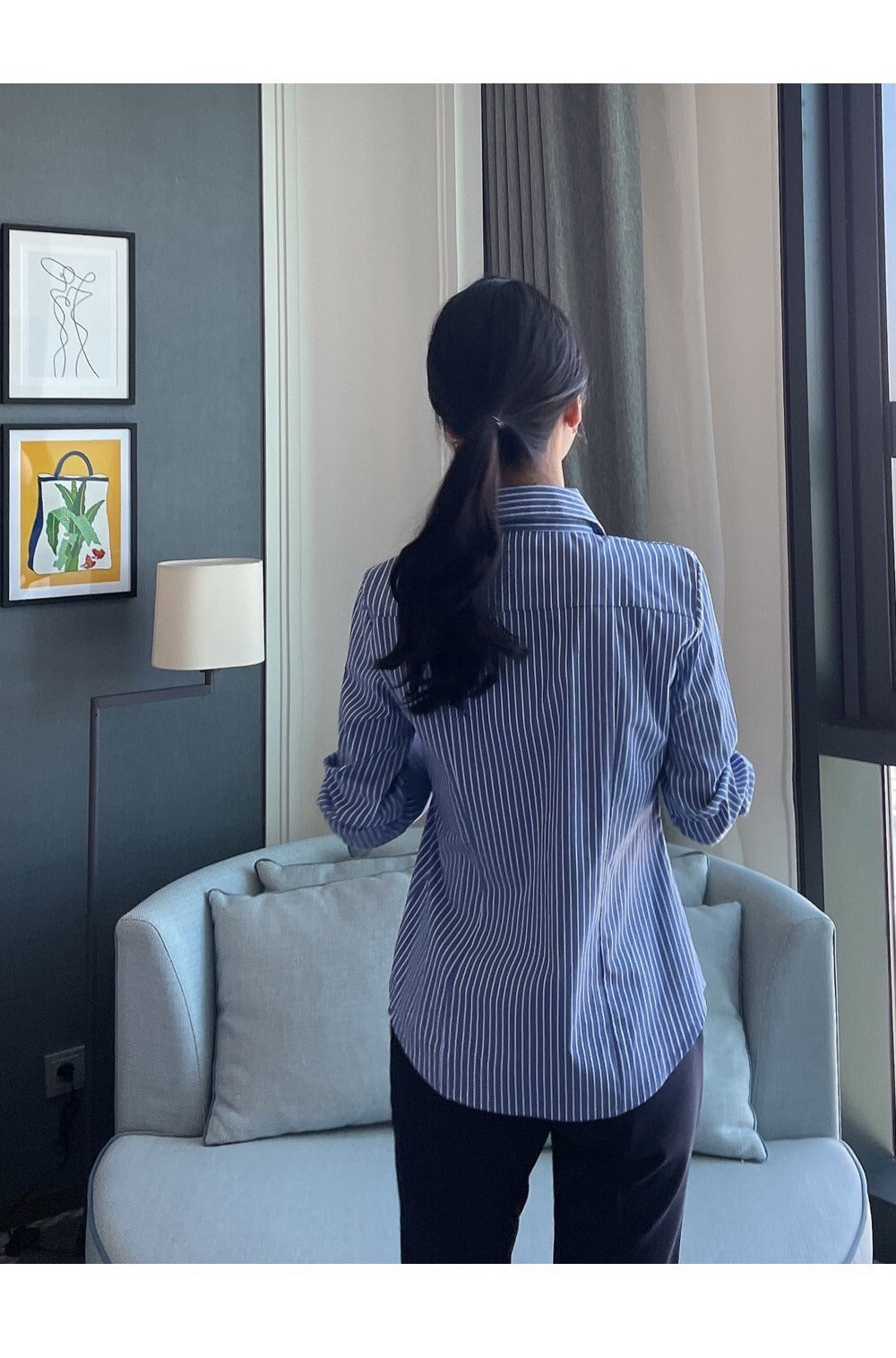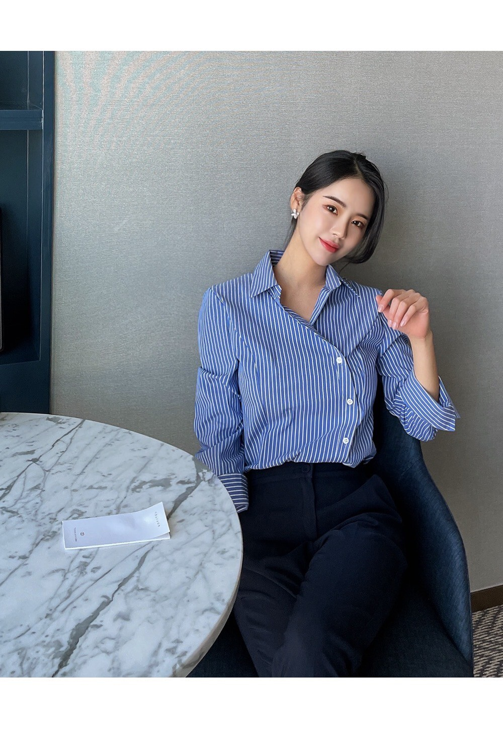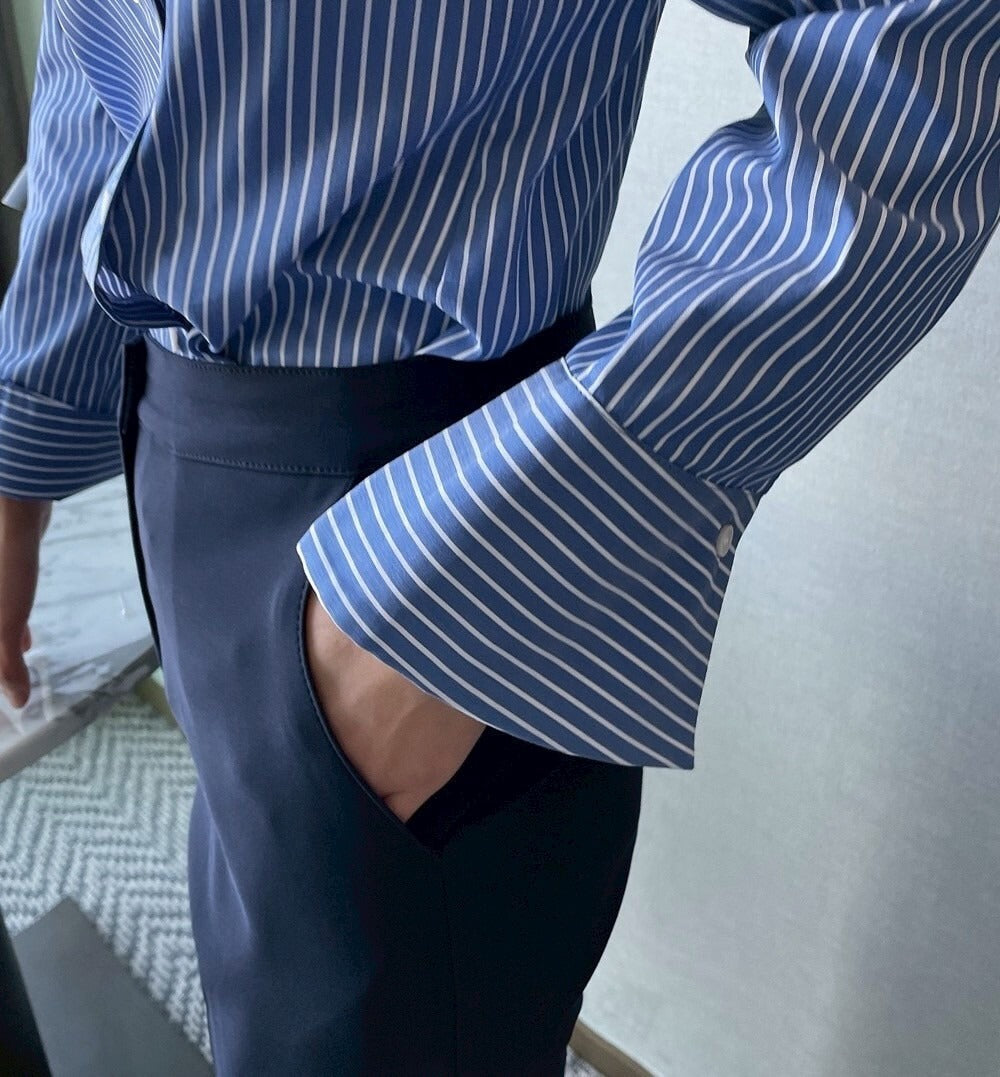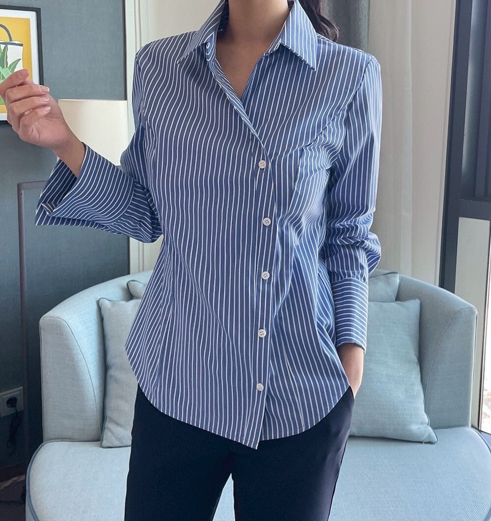 25Sep. 韓Chic簡約不規則側扣條紋襯衫 藍