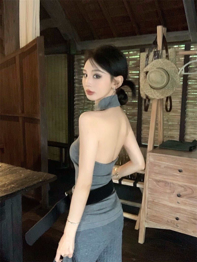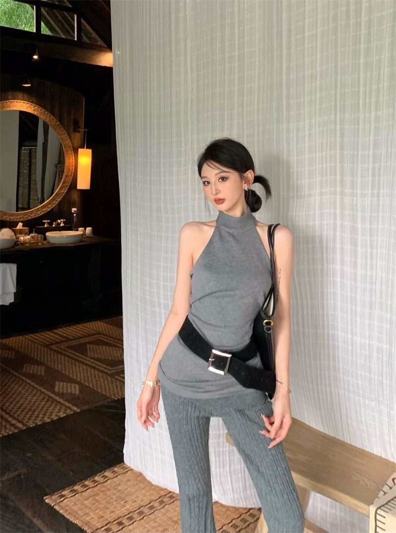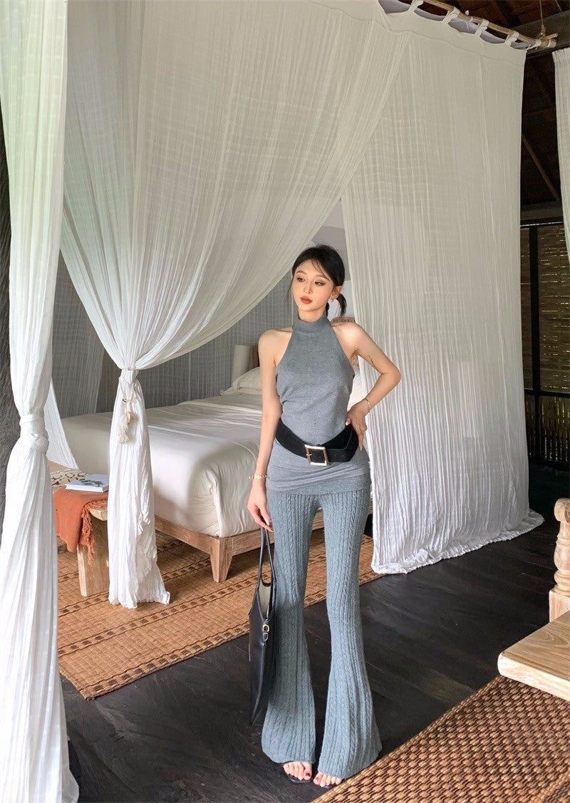Apr. 復古辣妹 削肩挖背顯瘦背心 麻花反折針織喇叭褲 灰